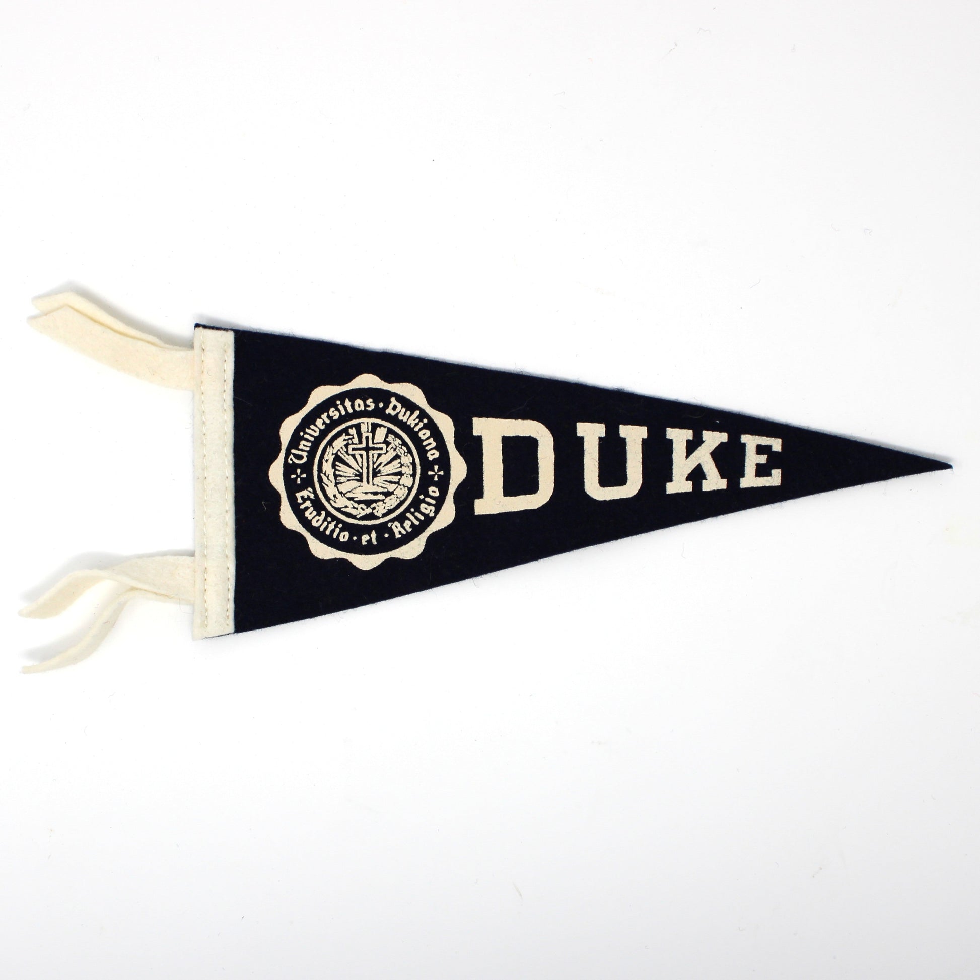 - Details: A wonderful vintage mini pennant from Duke University, with seal. It is black felt with white lettering. The screen printing is printed directly onto wool felt and is in perfect condition. This is a great addition to a pennant, memorabilia or souvenir collection. Perfect as decor for a game room, a dorm room or great gift for an alumni.