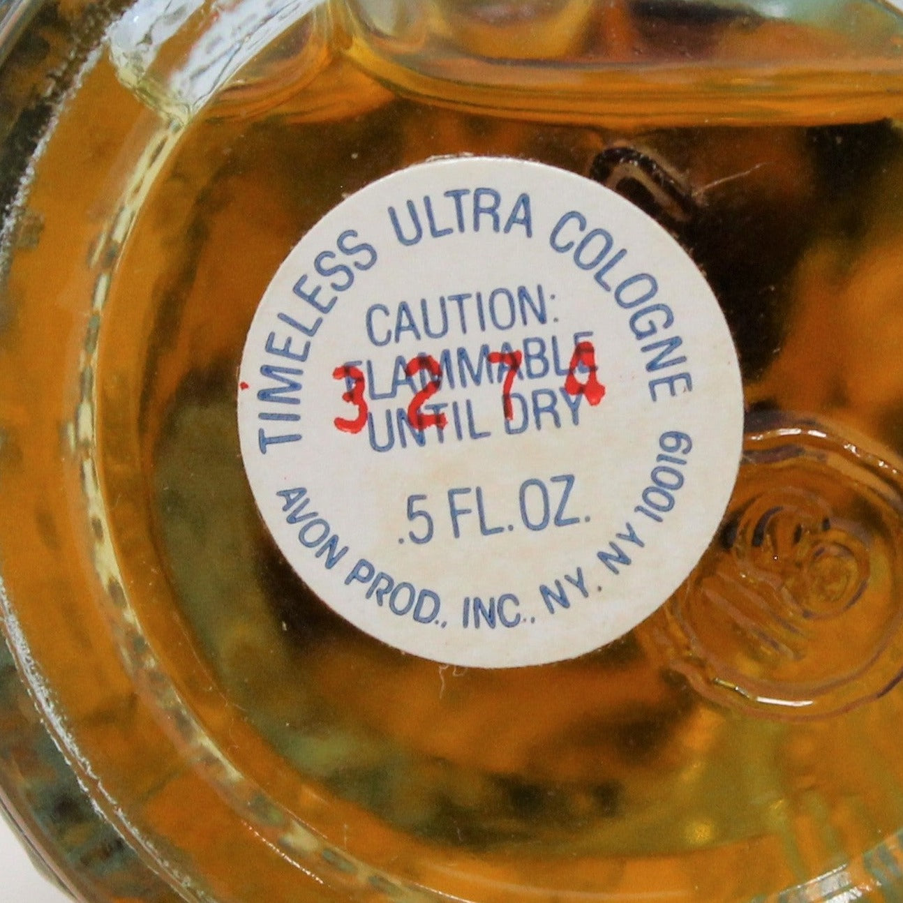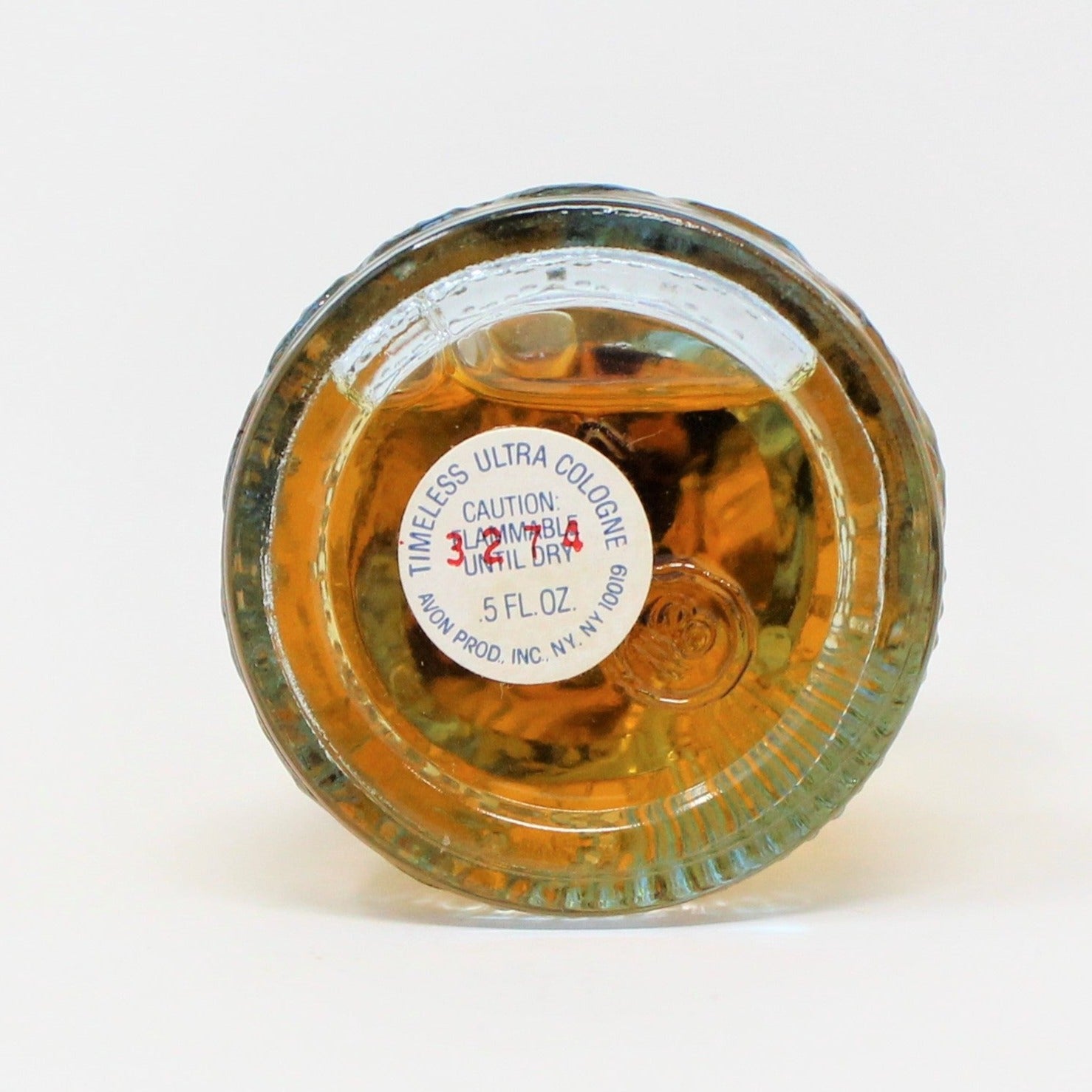 - Details: An adorable mini perfume bottle from Avon, it is a light blue glass bottle, in the shape of an angel, they called "Heavenly Angel". This one was sold with their Timeless Ultra Cologne which was introduced in 1974. This bottle is full, holds 0.5 fluid ounces of Timeless Ultra cologne. Please note this item can only ship "Ground" due to cologne contents. Great addition to your Avon bottle collection, the perfect touch for a Christmas Holiday display/vignette. If there's an angel collector in your life, this makes a wonderful gift!