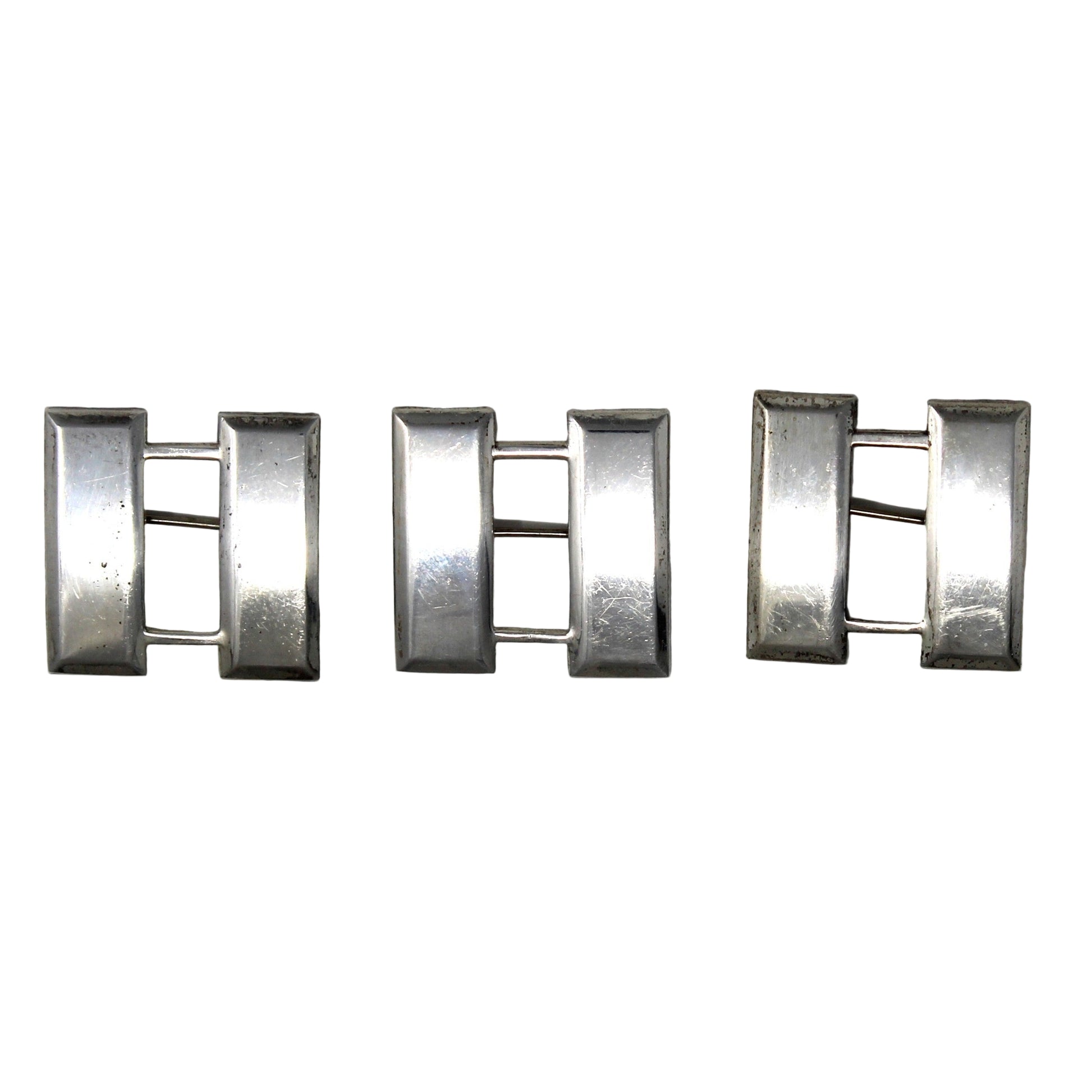 - Details: This vintage Captain Bars pin is from WWII, made of sterling silver*, and marked as such. The rank bar for a Captain consists of two horizontal silver bars on the lapel of the service coat or collar of the shirt. These sterling silver captain bars are now collectible antiques, this one is marked "Sterling". Many people collect military surplus, badges, metals and other items, if this is you, we hope you love these, they are in very good shape. We have three available, Sold Separately, at Random. They're all in the same condition, see last picture. Price is for ONE pin.