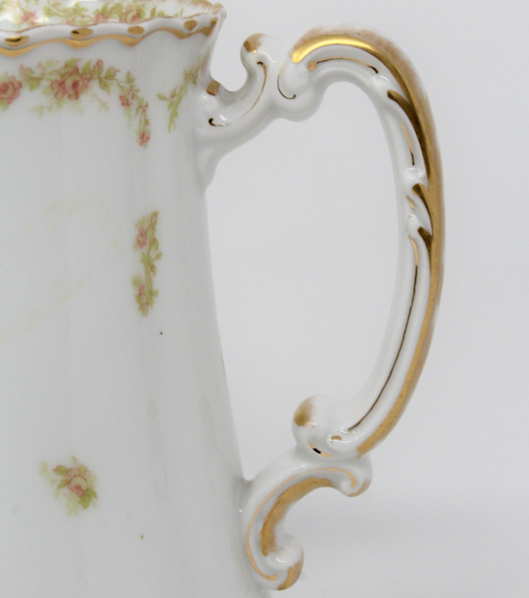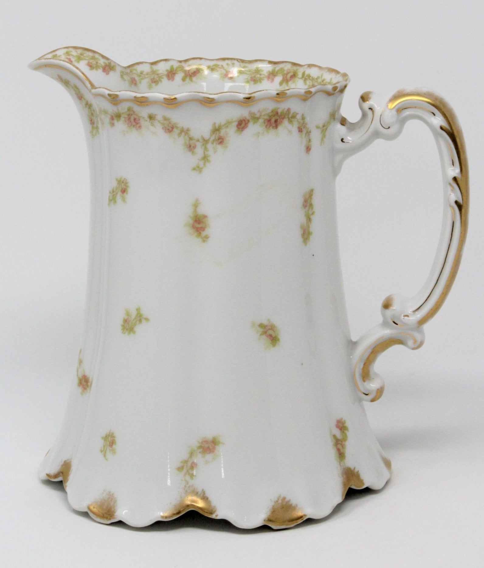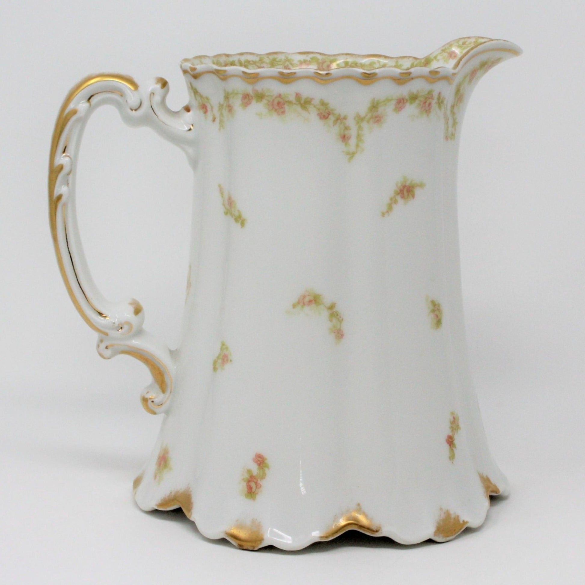 - Details: This is an extraordinarily beautiful pitcher! It is an antique, manufactured by Haviland Limoges in the 1890's. It has a wonderful shape with a very ornate handle and scalloped base. The pattern consists of tiny pink roses and green leaves that spill down from the rim, as well as small roses scattered across the piece. The inside border is also decorated with these tiny roses and leaves. Unfortunately not all Haviland Limoges patterns were named. Once they started naming their patterns, they were not routinely included as part of the back stamp until the 1970's, these older ones can only be identified by their Schleiger number. We were unable to find the Schleiger number for this pattern. The information stamped on the back stamp is simple: "Haviland France, Haviland & Co Limoges". If you're a Haviland collector, we hope this pitcher enhances your collection. If you're just looking for a beautiful gift for a bride or special someone, this piece will not disappoint.