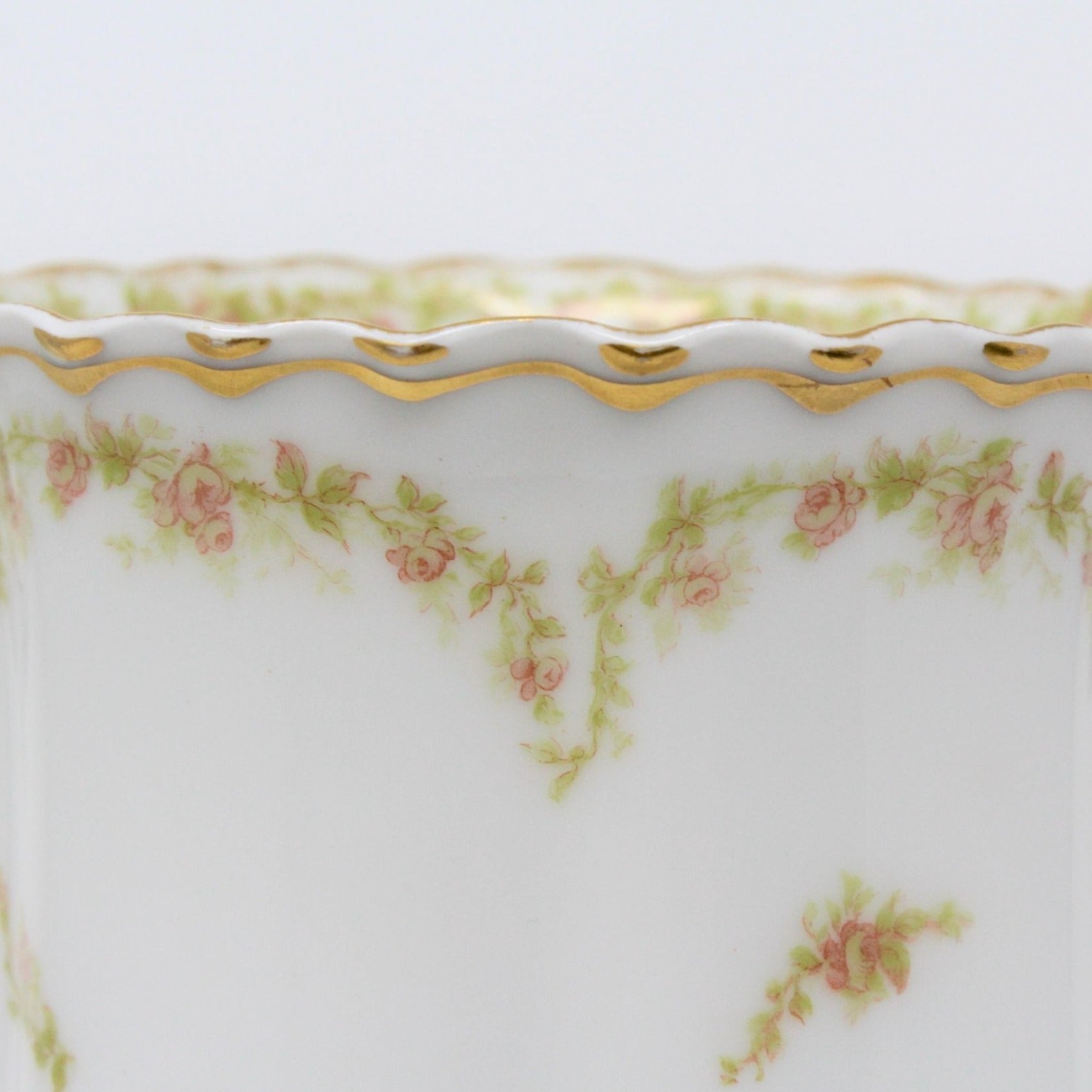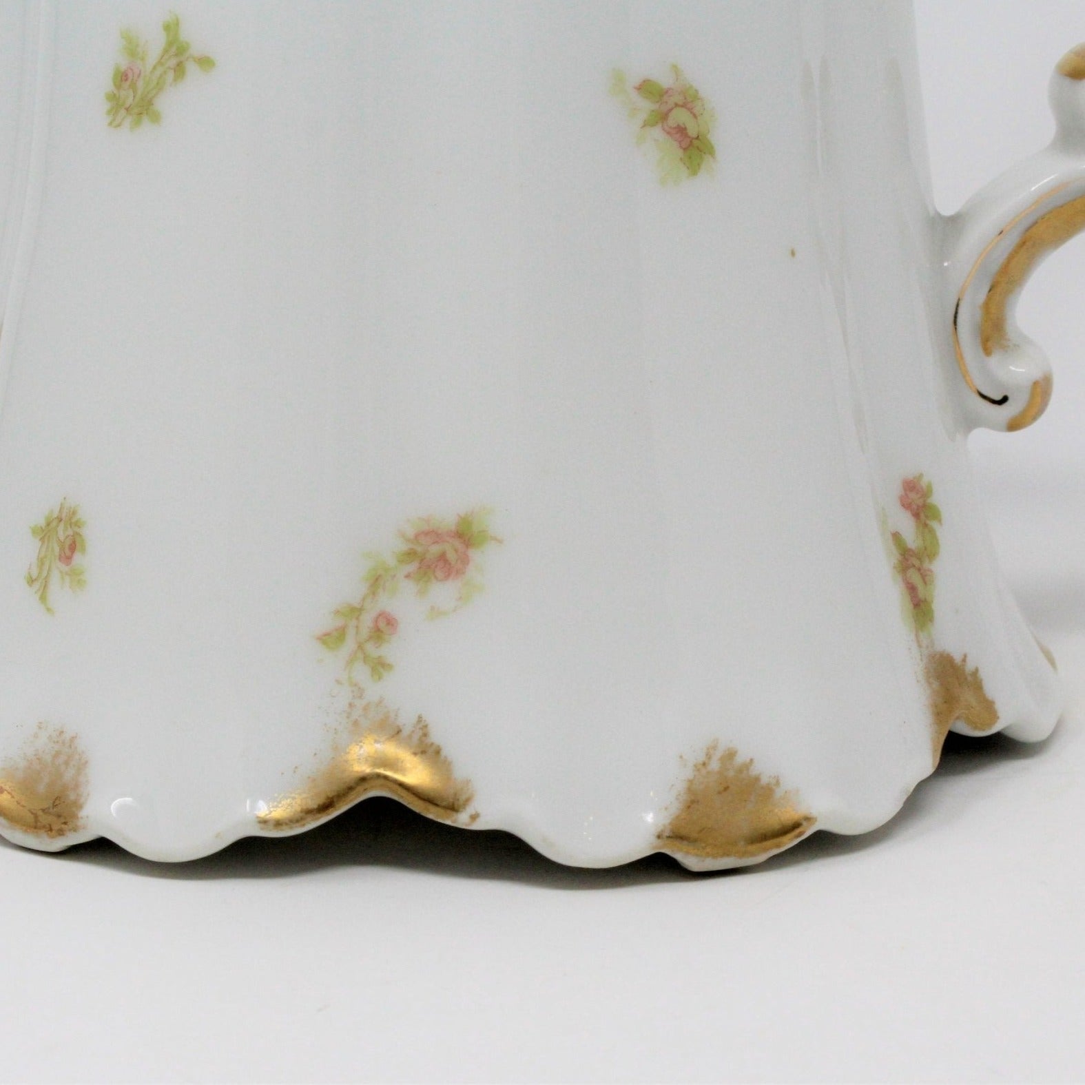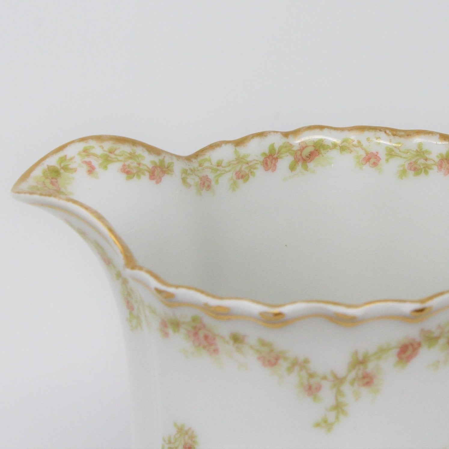 - Details: This is an extraordinarily beautiful pitcher! It is an antique, manufactured by Haviland Limoges in the 1890's. It has a wonderful shape with a very ornate handle and scalloped base. The pattern consists of tiny pink roses and green leaves that spill down from the rim, as well as small roses scattered across the piece. The inside border is also decorated with these tiny roses and leaves. Unfortunately not all Haviland Limoges patterns were named. Once they started naming their patterns, they were not routinely included as part of the back stamp until the 1970's, these older ones can only be identified by their Schleiger number. We were unable to find the Schleiger number for this pattern. The information stamped on the back stamp is simple: "Haviland France, Haviland & Co Limoges". If you're a Haviland collector, we hope this pitcher enhances your collection. If you're just looking for a beautiful gift for a bride or special someone, this piece will not disappoint.