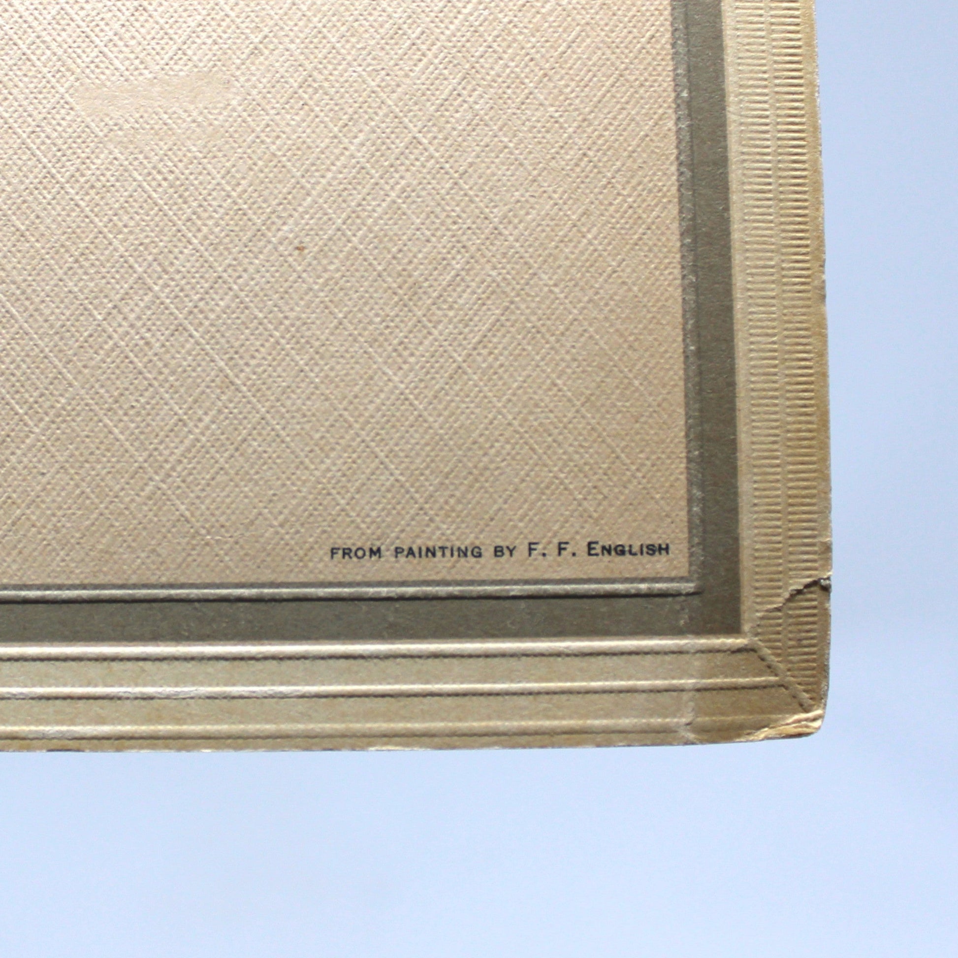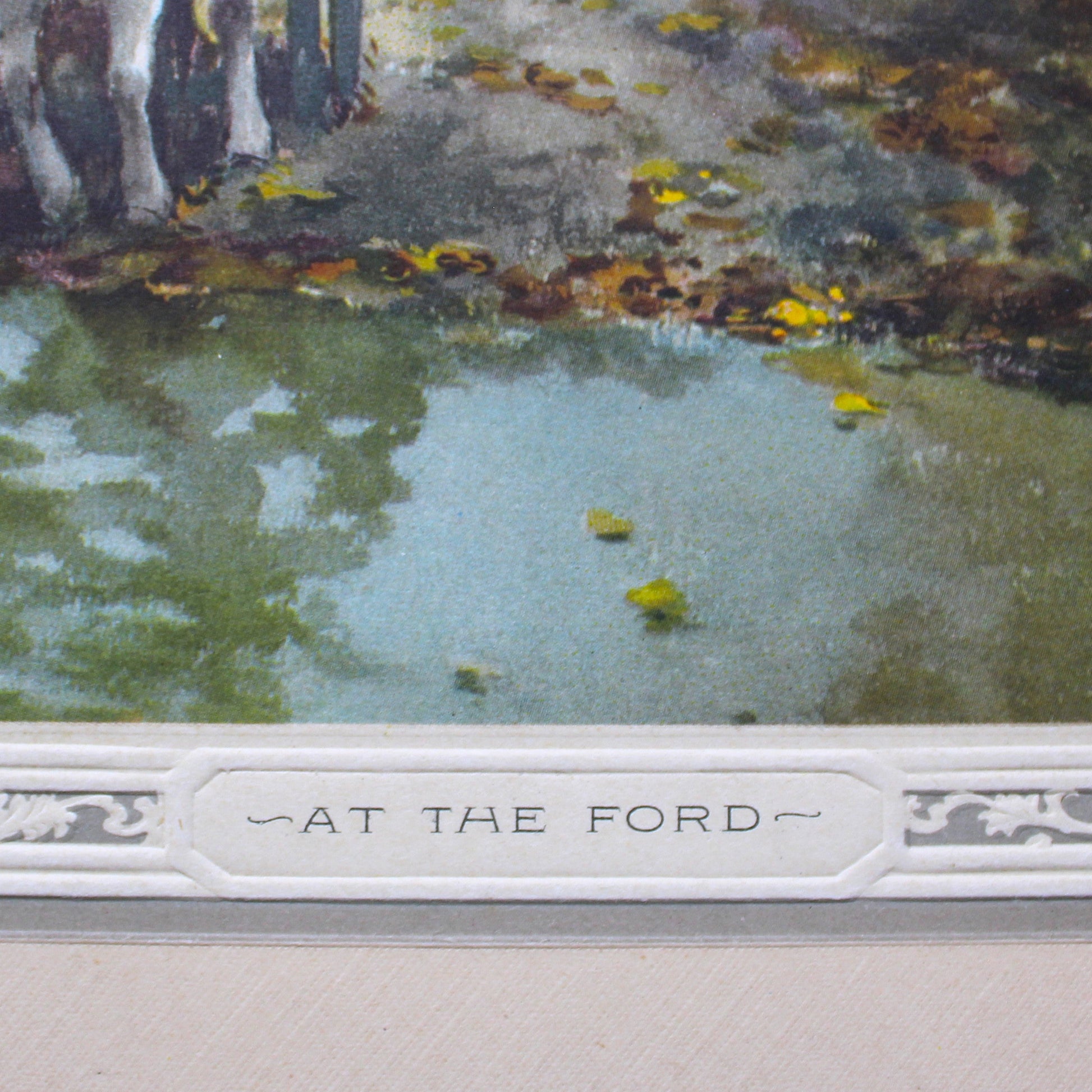 - Details: A hard to find, large original lithograph, now out of print. This is a salesman sample calendar, however, the actual calendar has been torn off, but the print and embossed matting is so beautiful, we decided to sell it as a print, in absolutely wonderful condition. The painting is by Frank F. English, depicting a country landscape, a horse-drawn cart with two horses crossing a river. The calendar lithographer titled it At The Ford #2269, we're unsure if this is the actual title of the piece. This is a large piece, matted, would look stunning framed, just cut off the top and bottom margins and keep the gorgeous matting.