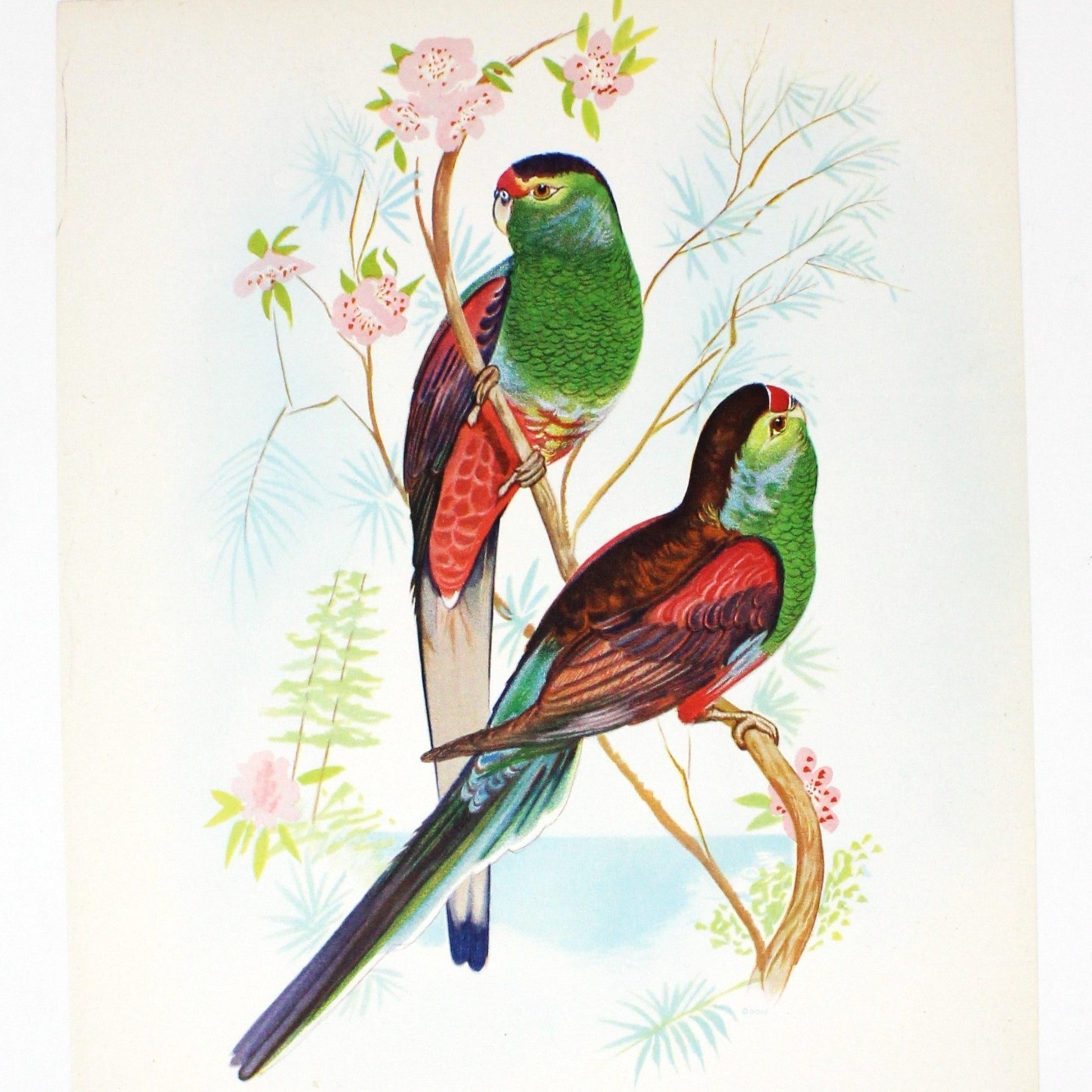 - Details: A gorgeous vintage print of the extinct Paradise Parrots. This very colorful print is from "The Birds of Australia" a book written by John Gould and published in seven volumes between 1840 and 1848, with a supplement of other birds published between 1851 and 1869. Although John wrote the original monographs, his wife Elizabeth Gould was the one who illustrated and produced many of the plates. This specific image plate was done by HC Richter. Marked: "Litho in U.S.A. GLCO, Beautiful Parakeets". (GLCO=Goes Lithography Company 1879 – 2019 Chicago, IL). This image was typically sold as an Advertisement Print for use in calendars, thermometers, advertisement postcards, hand fans, etc. It is in pristine condition, not used, suitable for framing, and recommended in order to maintain condition.