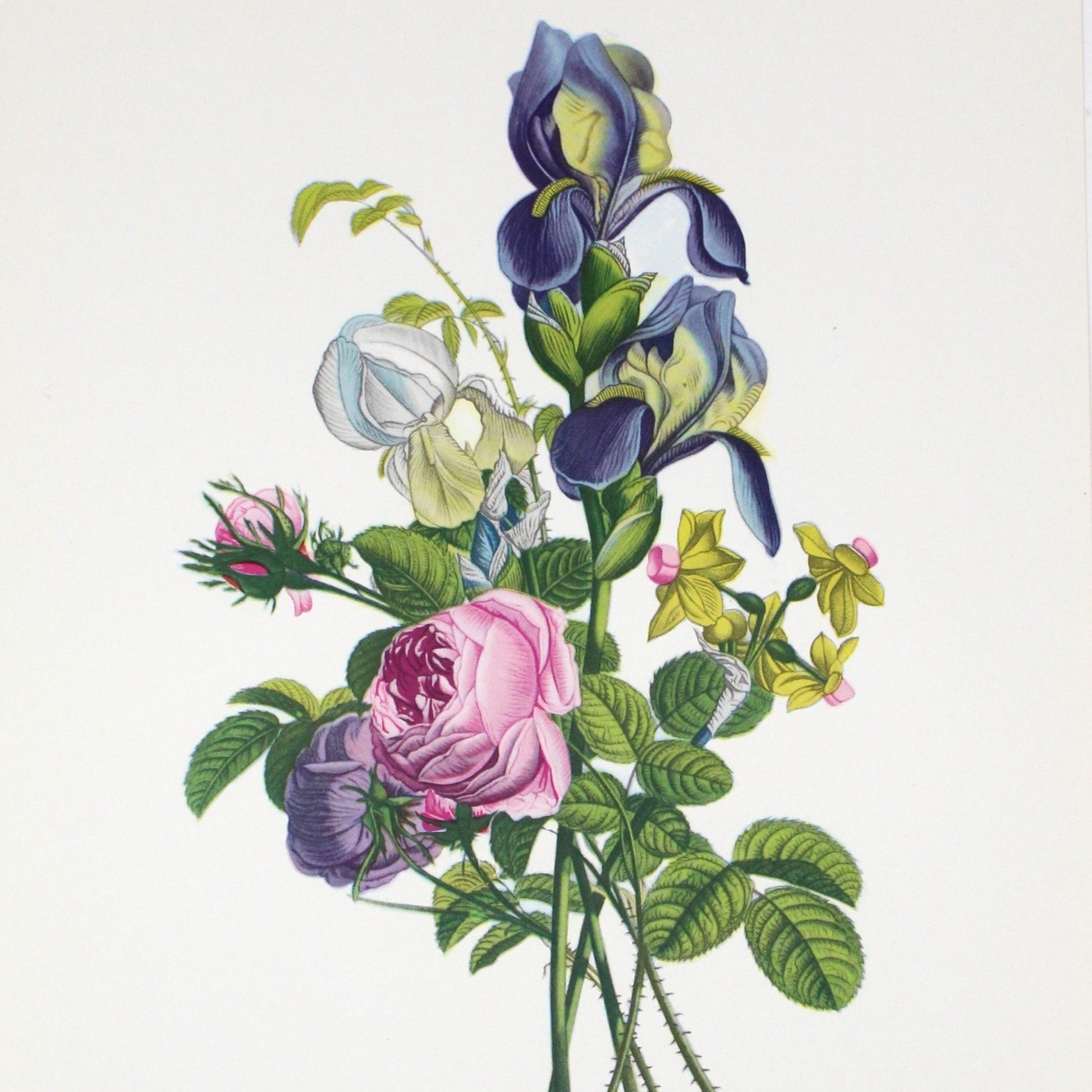 - Vintage Lithograph Print, Botanical Print, Floral Bouquet, Irises & Pink Roses by Jean Louis Prévost, Advertisement Calendar Print #3107, Ephemera, Frameable Art, Decor, (Discontinued)