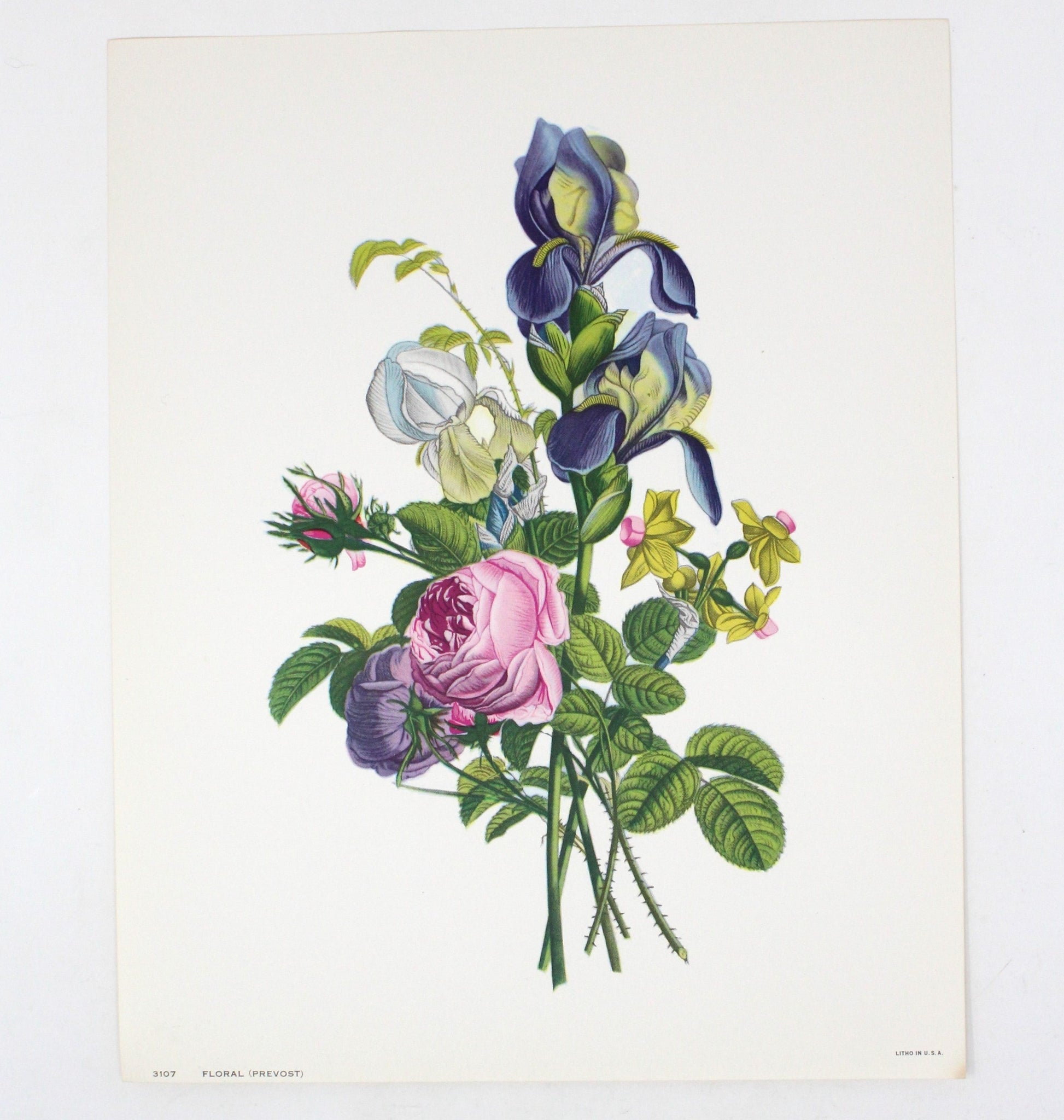 - Details: A hard to find French botanical work, vintage lithograph by Jean Louis Prevost (1760 - 1810), now out of print. It features a floral bouquet of blue and yellow irises with pink roses among other flowers. This is part of Prevost's collection titled: "Collection des Fleurs et des Fruits". These images were typically sold as Advertisement Prints for use in calendars, thermometers, advertisement postcards, hand fans, etc. Marked: "3107 Floral (Prevost), Litho in U.S.A.". This piece is suitable for framing, and recommended in order to maintain this condition.