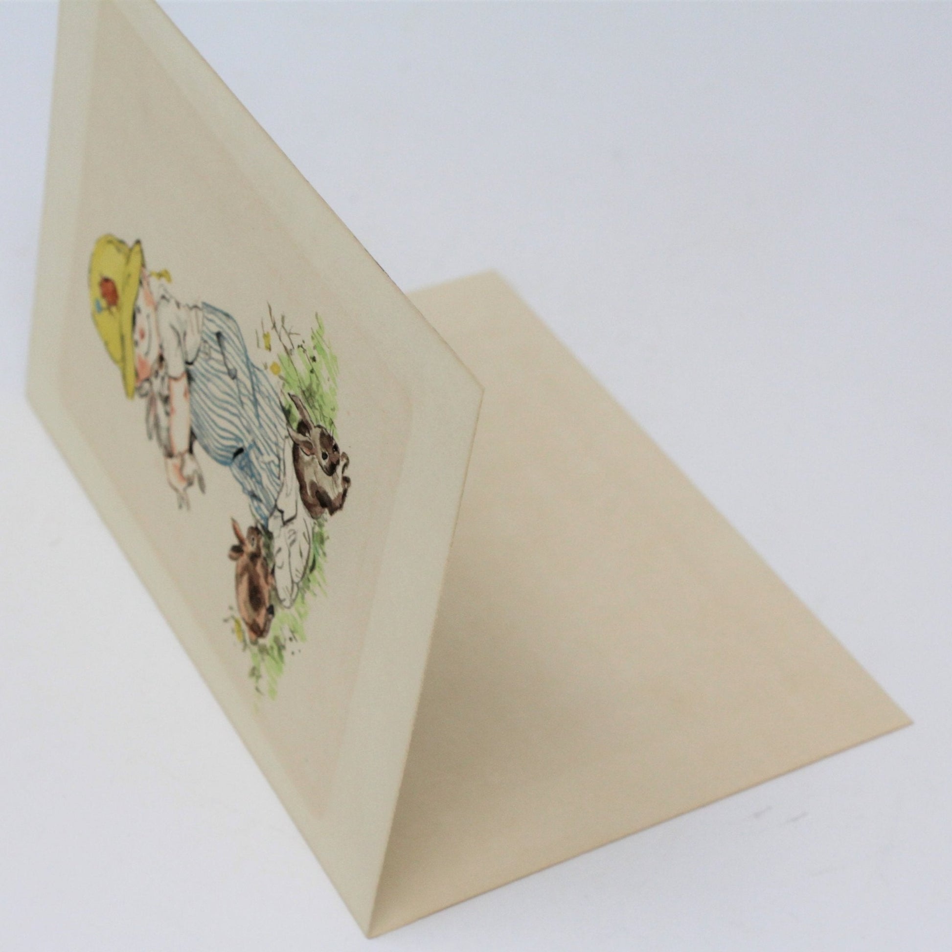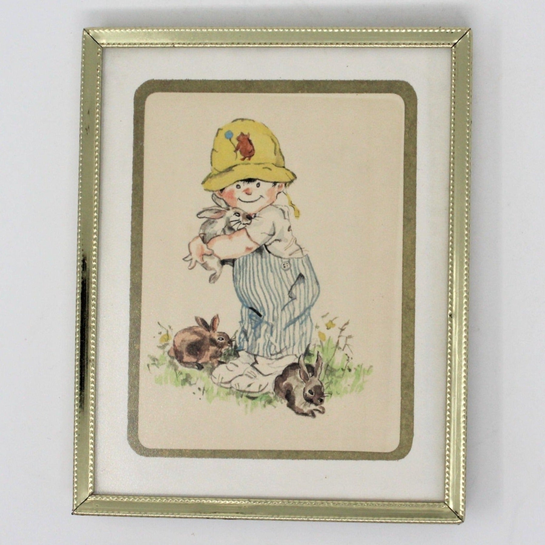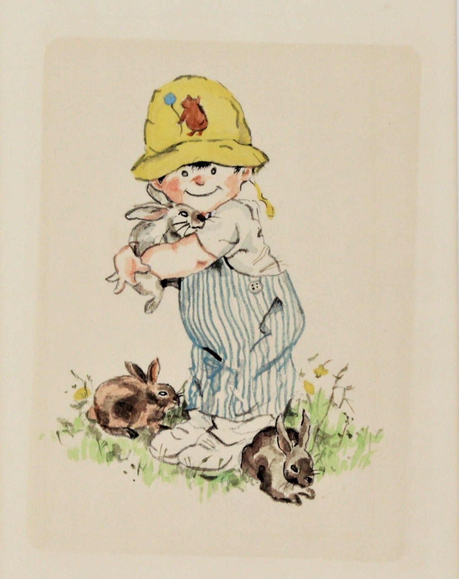 - Details: This is a small watercolor print. It's a little boy, surrounded by brown bunny rabbits, and holding a white bunny in an awkward embrace, just like a little child would. He's wearing what looks like seersucker overalls and a white t-shirt. His yellow hat is adorned with a Pooh bear holding a balloon, and the hat's strap is swinging on one side, a little haphazard, like he's been playing outside. We could not to find another print like it, it is unsigned, so we are unable to tell you more about it. The paper is folded, this might have been a blank note card, but the paper is not card stock, it's just a folded heavy paper. We found it framed, in a simple, inexpensive, gold-tone metal frame. We've kept it in the frame, not only for protection, but it's an excellent size for it, it is matted, plus non-glare glass, and the frame is in good condition. If you'd like us to ship it unframed, we'll certainly accommodate, please use Contact Us.
