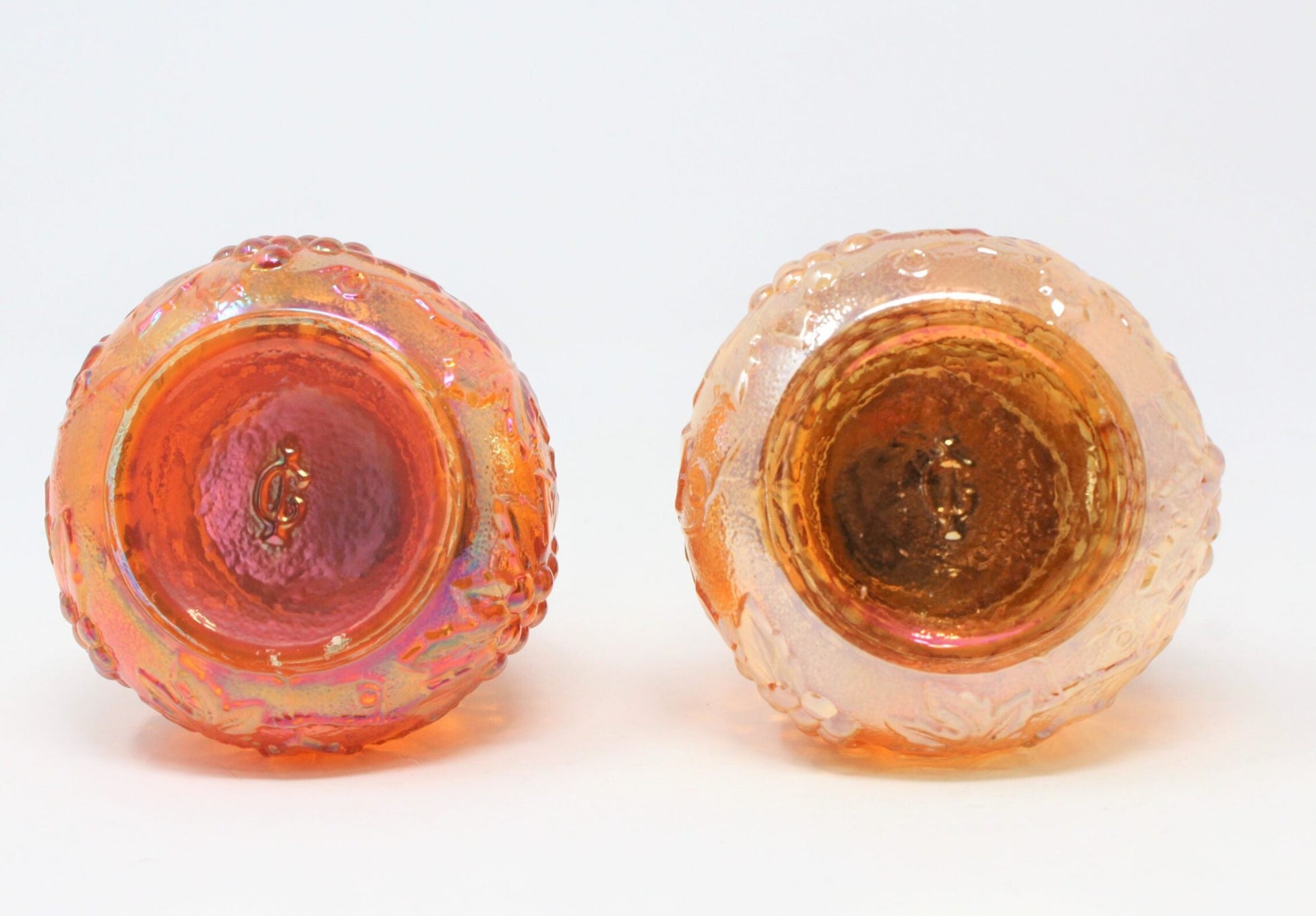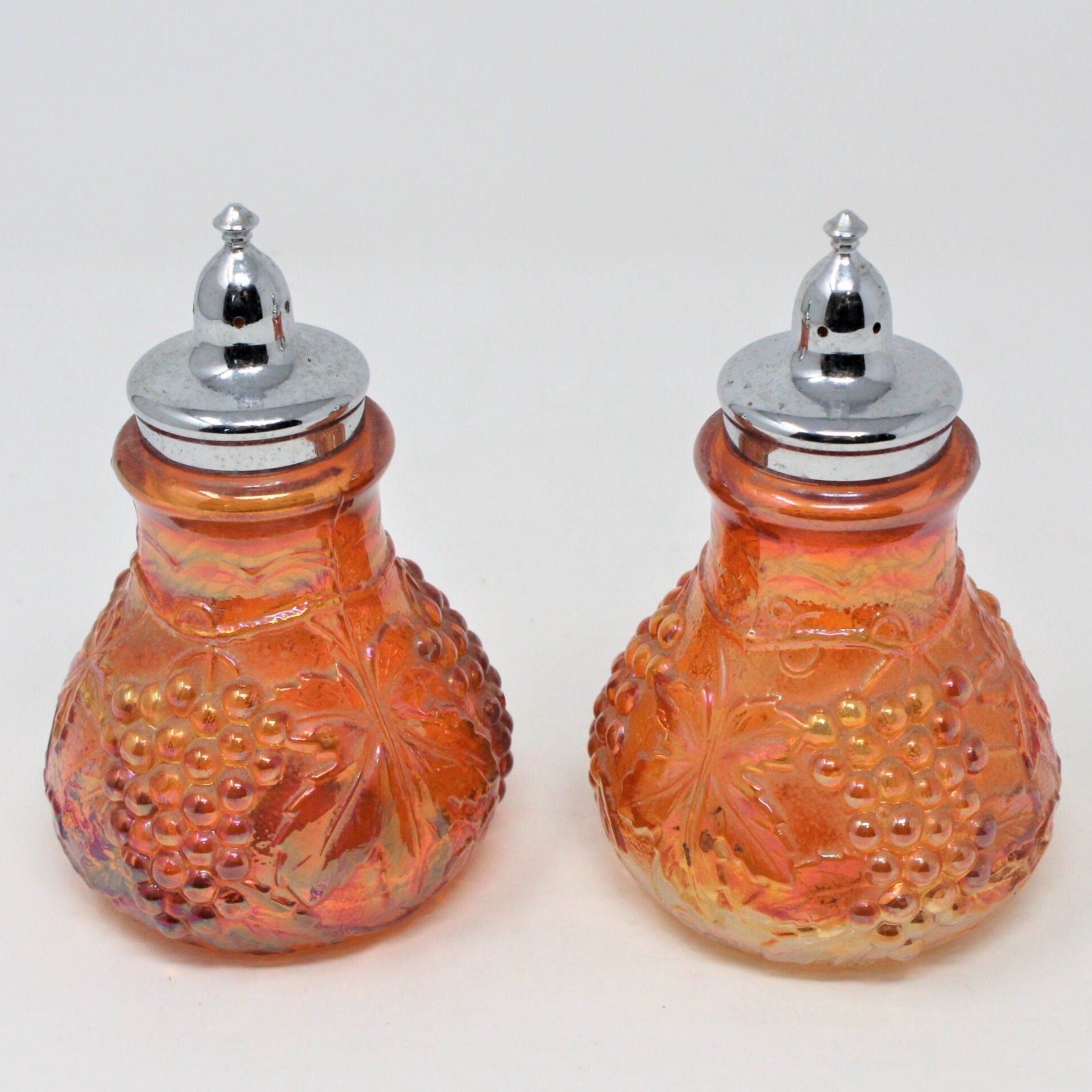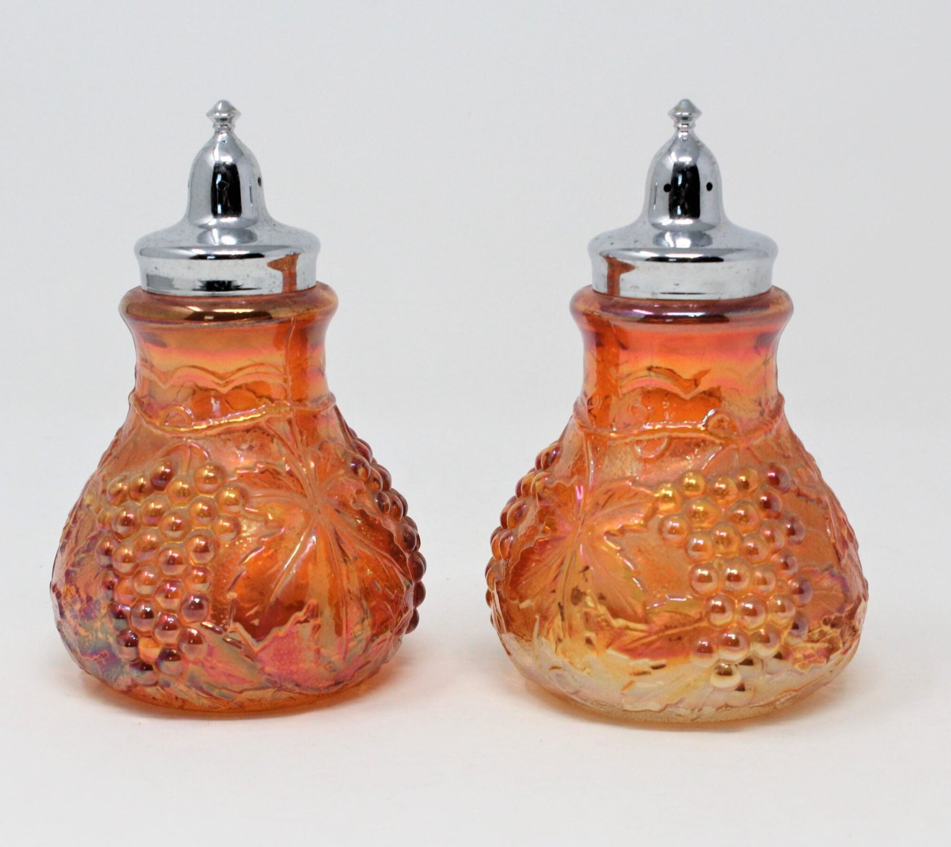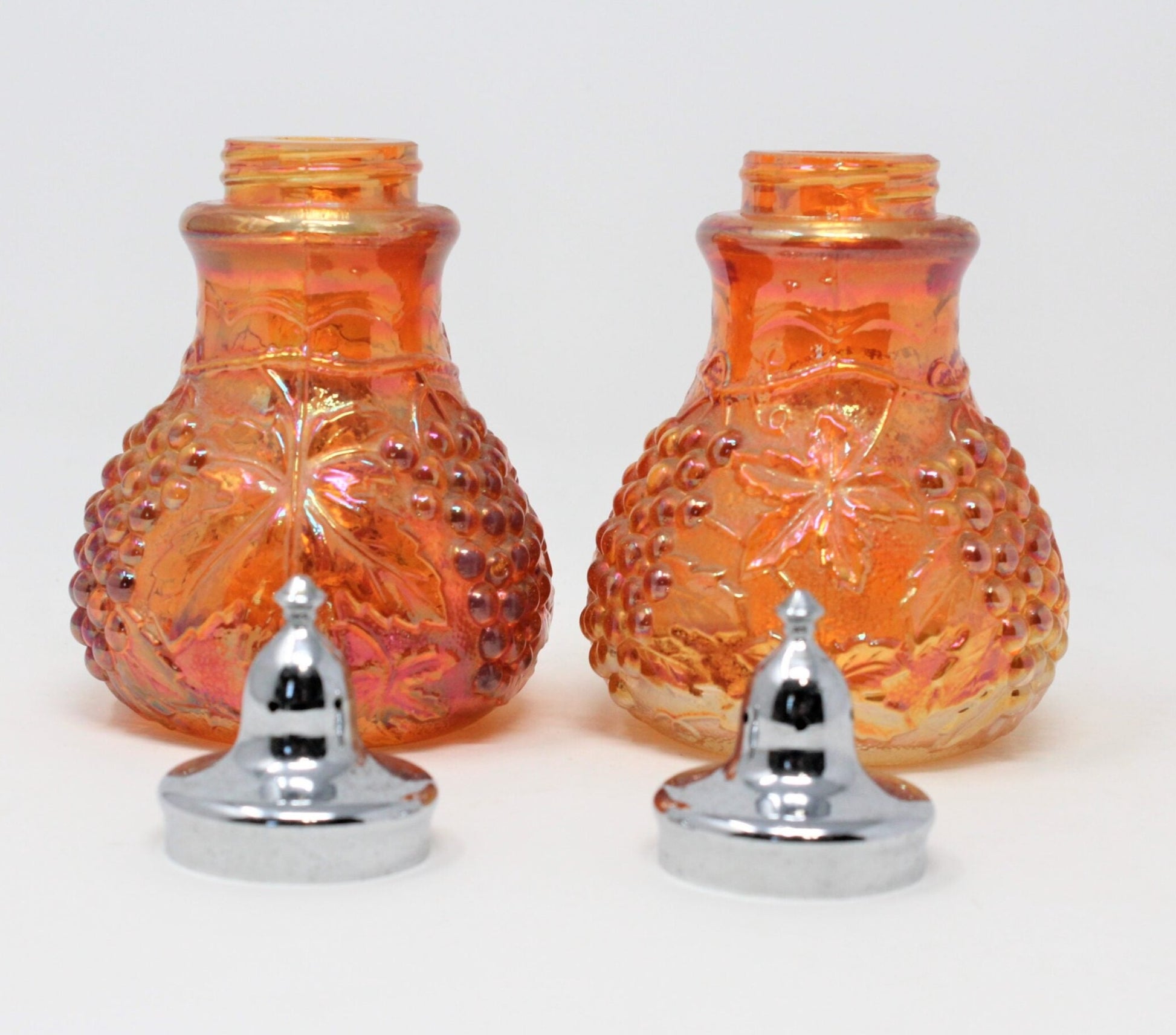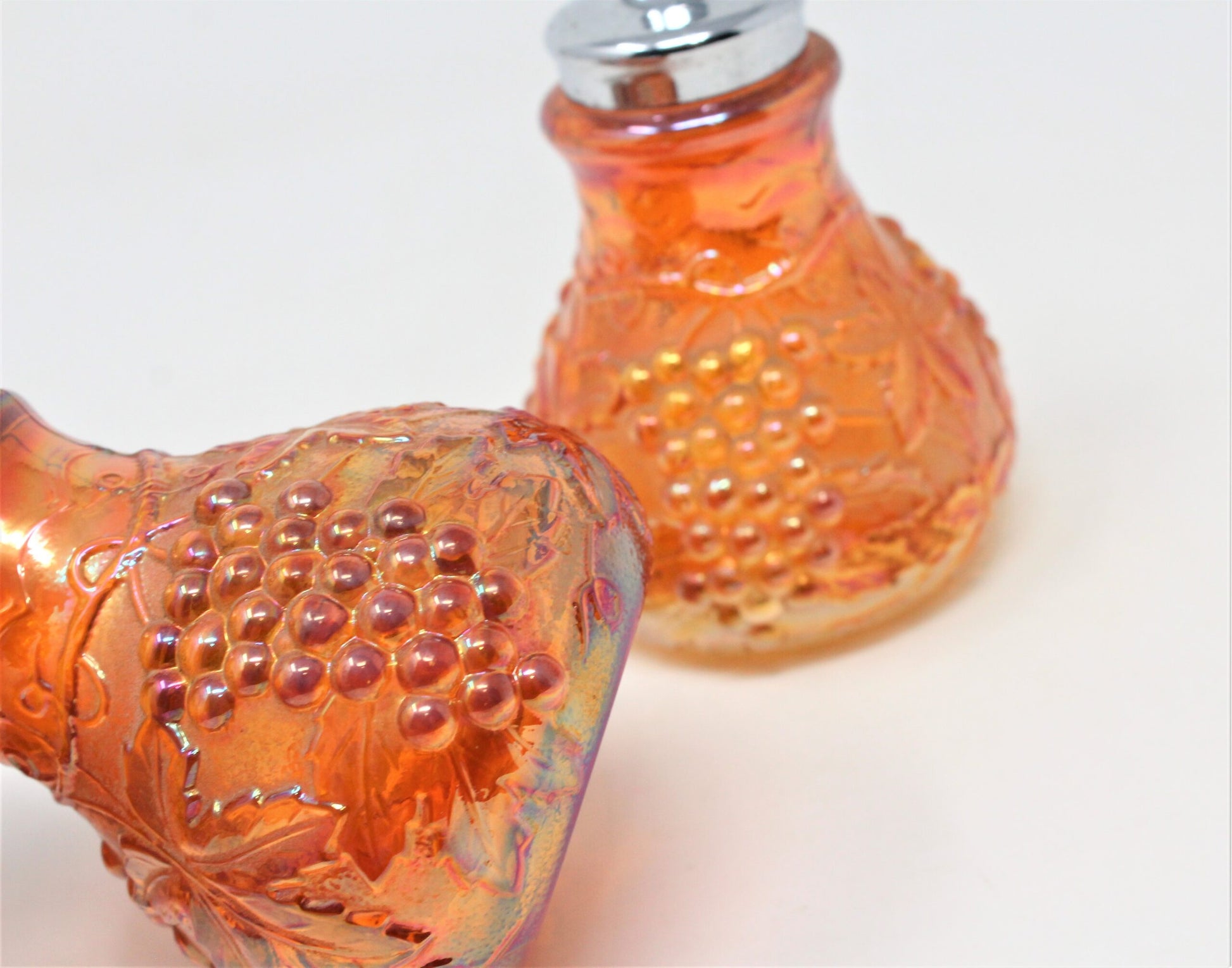- Vintage Salt & Pepper Shakers, Imperial Glass, Carnival Grape Marigold #96, Mid Century Carnival Glass, Iridescent, Grapes & Leaves Pattern, Fall Tableware, Thanksgiving Table Decor, RARE, Vintage Collectibles, Orange Glass, (Discontinued)