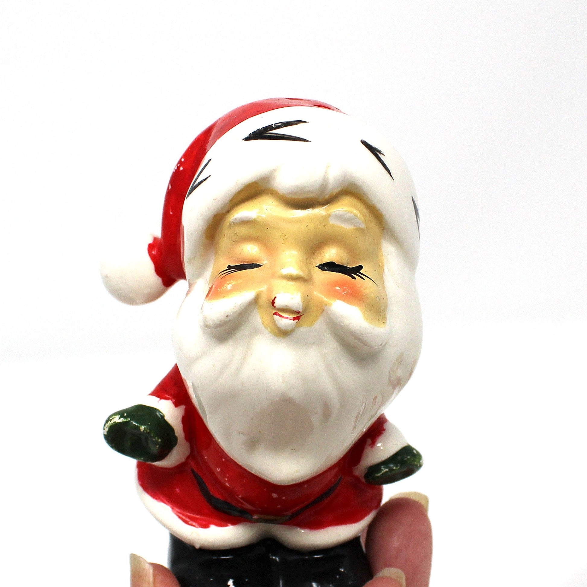 - Condition: Vintage - Used. Good Vintage Condition. Mrs. Claus has a lot of color wear on her face. Santa has color wear, mostly on the back and a chip on the back of his boot. There are no chips or scratches, both retain their stoppers. If you enjoy the worn patina and chippy paint on mid century figurines, they will be perfect for you. Please review all pictures and make sure you love this item before purchasing, we can't accept returns. Please remember these are ANTIQUE and VINTAGE items, they are NOT new, every effort has been made to show scratches, wear and tear and imperfections.