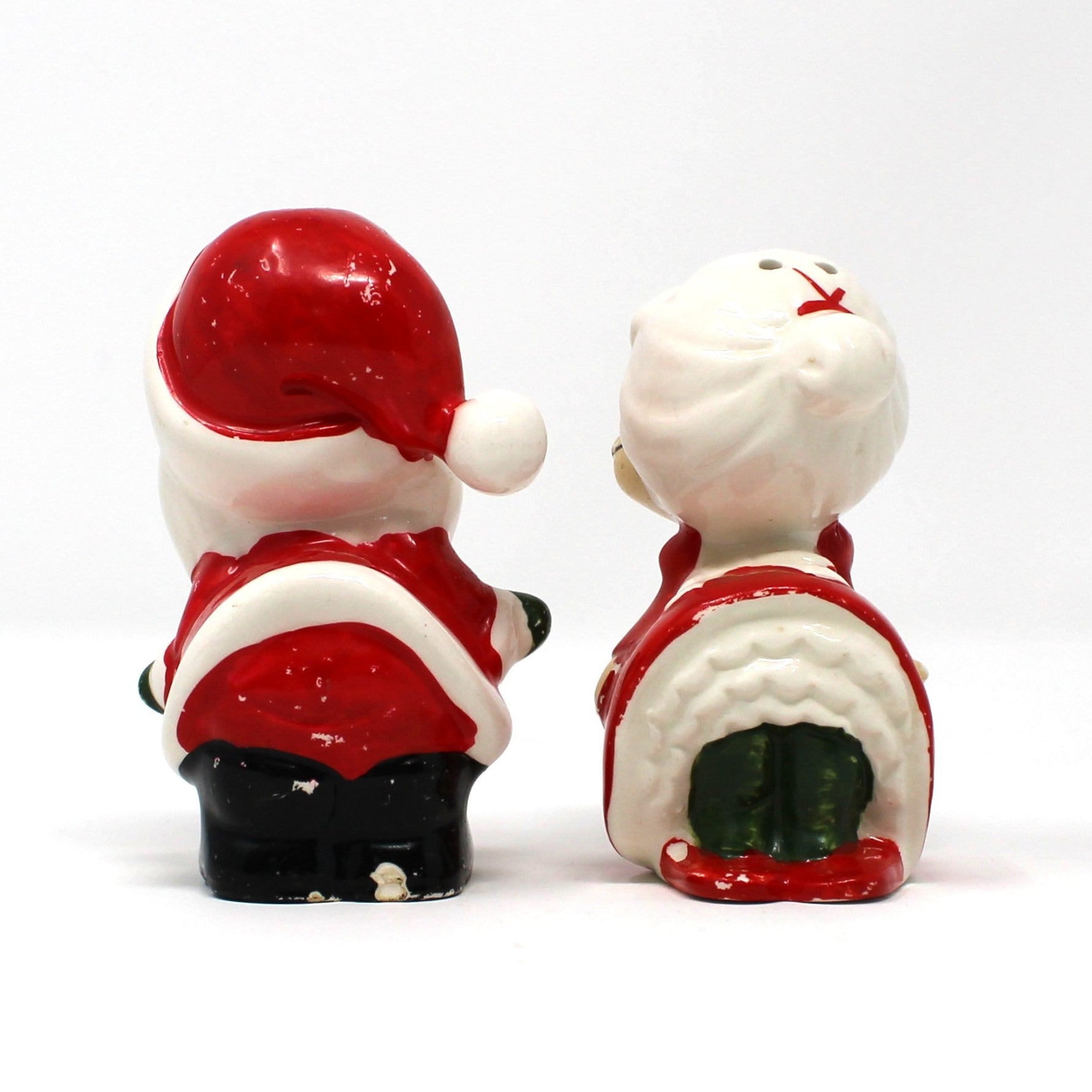 - Details: Charming mid-century salt and pepper shakers. Figural Kissing Santa and Mrs Clause in hand-painted porcelain. The set showcases meticulous detail (look at those eye lashes!), and warm holiday spirit perfect for festive table settings. These are the originals, have not been retouched, an ideal collectible for those who appreciate authentic mid-century ceramics and nostalgic Christmas décor. A delightful addition to any kitchen or holiday display. These have color wear, please see Condition below for details. Perfect for the children's table too!