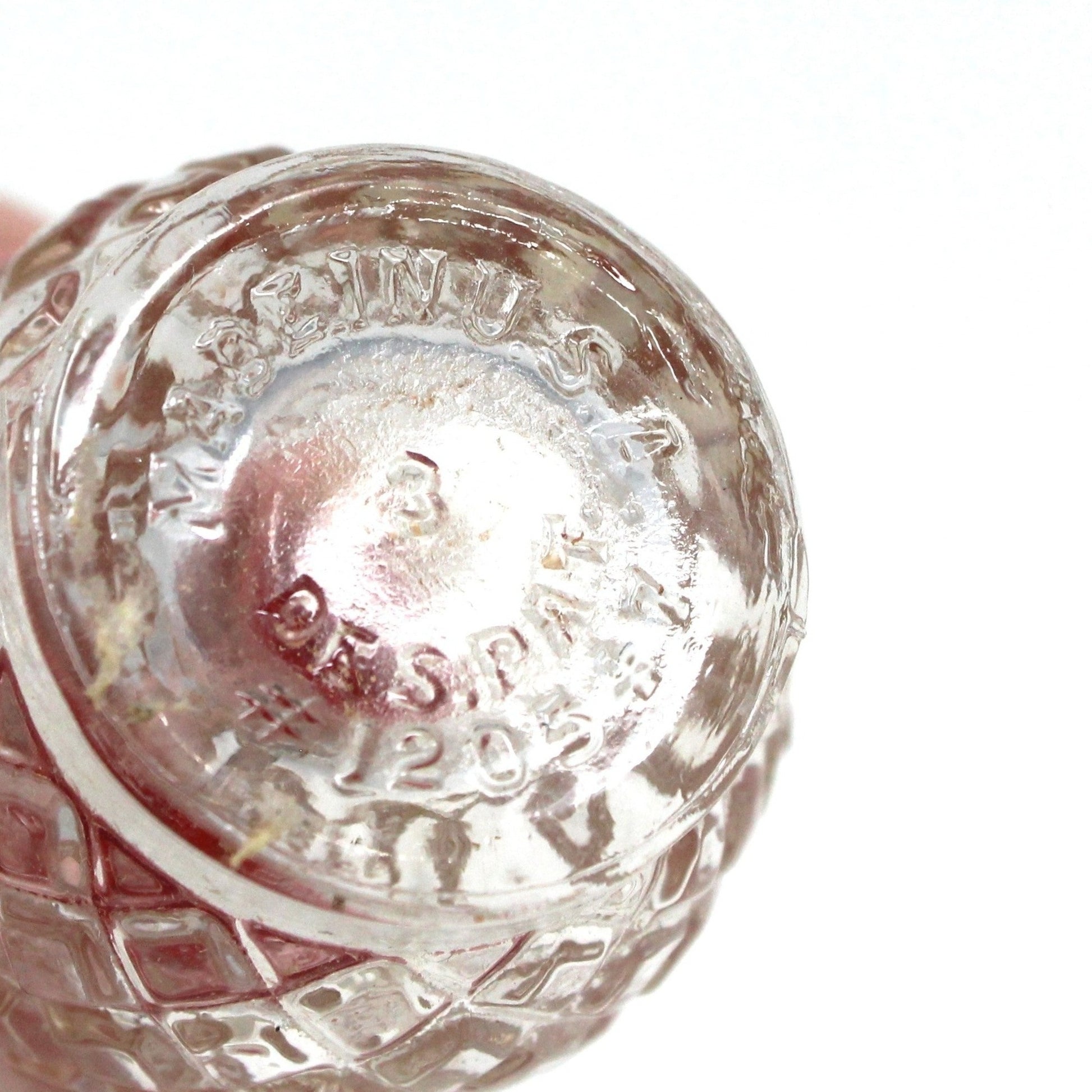 - Details: This is a very cute set of vintage glass salt and pepper shakers. They are round, pressed glass, in a very pretty cut diamonds pattern and Bakelite tops. These are unique and have that totally vintage vibe. The tops are pointy and have one single hole on each, could even be used to pour sugar. The bottom is embossed: "Made in USA, Des Pat 120547", (design patent). These are small, please note size, they would be perfect on a breakfast tray or intimate setting. Adorable as vintage kitchen decor or as collectibles.
