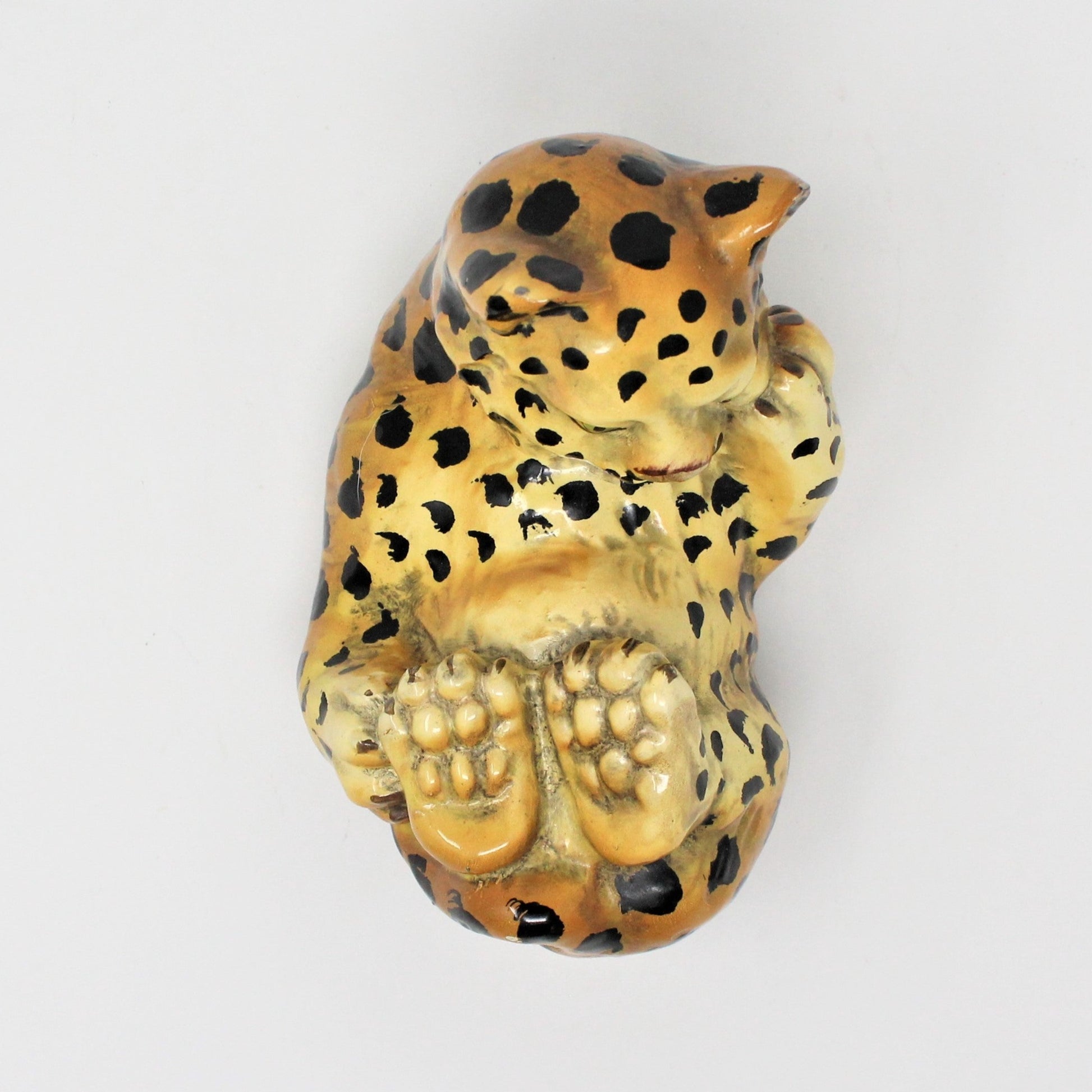 - Details: A very cute Cheetah or Leopard cub to warm your heart. Hand painted with the sweetest eyes and pose. The little paw pads, the nails, the varying shades on the coat, everything is perfectly detailed. These handmade animal statutes were all the rage in the 1960's and '70's and are coming back in full force! You see them often now in catalogs and online, made in China, most likely machine made. This one is a true work of art, handmade in Portugal. This came from an estate sale, a world traveler living in Miami, Florida. We actually purchased several pieces from him, all absolutely wonderful, most of them already sold, some we've not posted yet, come back soon to see more. A special addition to enhance your home.