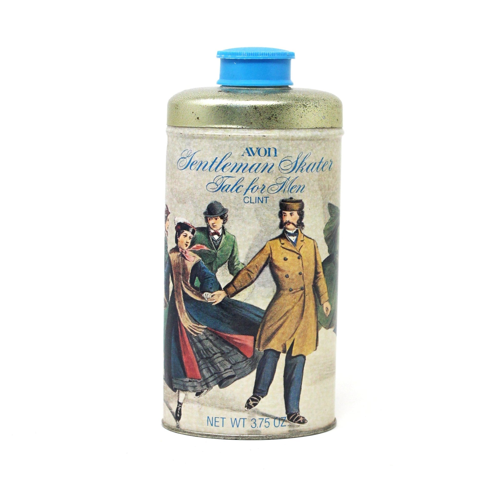 - Details: A perfect shaker tin to display in winter and over the holidays! It is from Avon, originally sold with Gentleman's Talc in their very famous Clint fragrance for men (launched in 1976), now empty. The tin features just a small fragment from an illustration by lithographers Currier & Ives titled "Central Park - Winter" (1862), a very large, old Americana print, with lots of skaters enjoying the ice in New York City. The back of the tin talks about the illustration and suggests that "...displayed on shelf or table, it will add a charming note of nostalgia to any bath decor." We couldn't have said it better. Great gift for a tin collector, it is in very nice vintage condition.