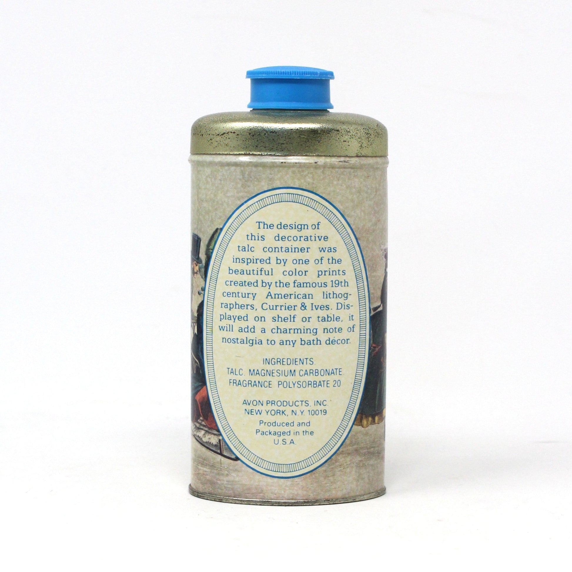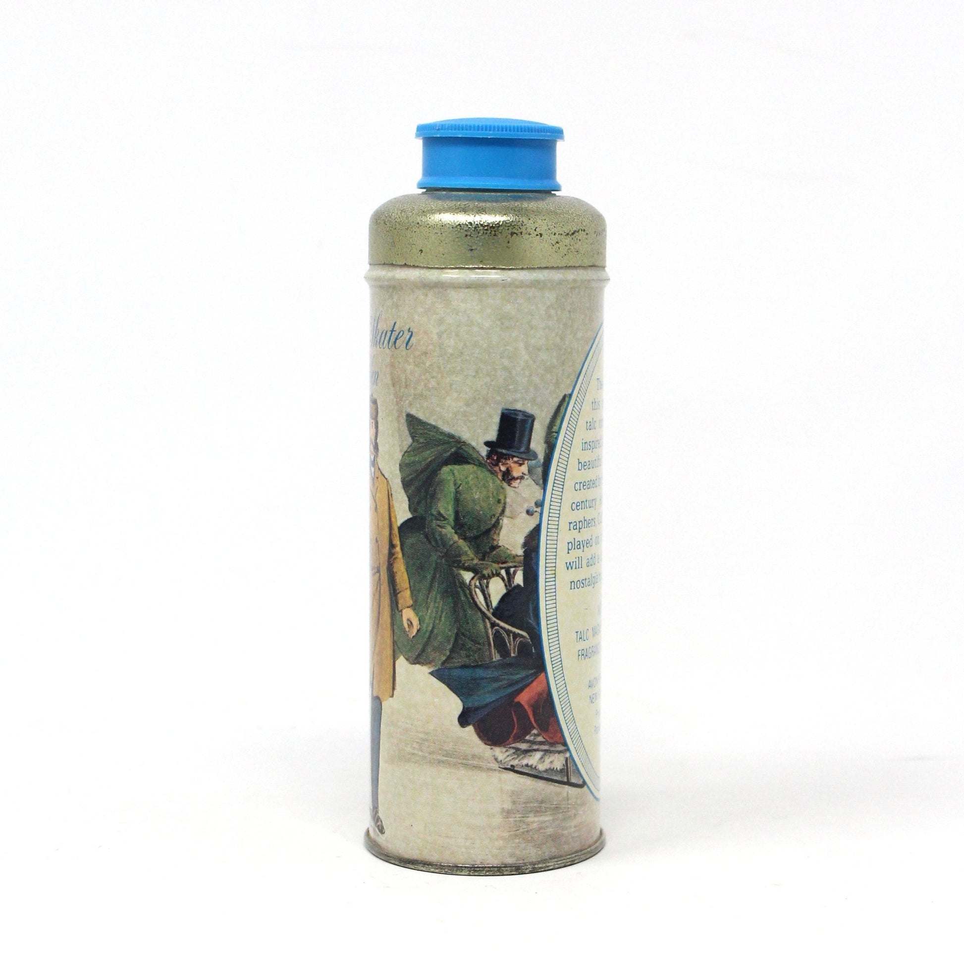 - Vintage Talcum Tin, Powder Talc Shaker, Avon Collectible, Decorative Tin, Promotional Products, Advertising Collectibles, Currier & Ives Illustration, Central Park Winter 1862, Avon Clint Fragrance, 1800's Ice Skaters, (Discontinued)