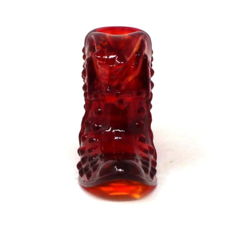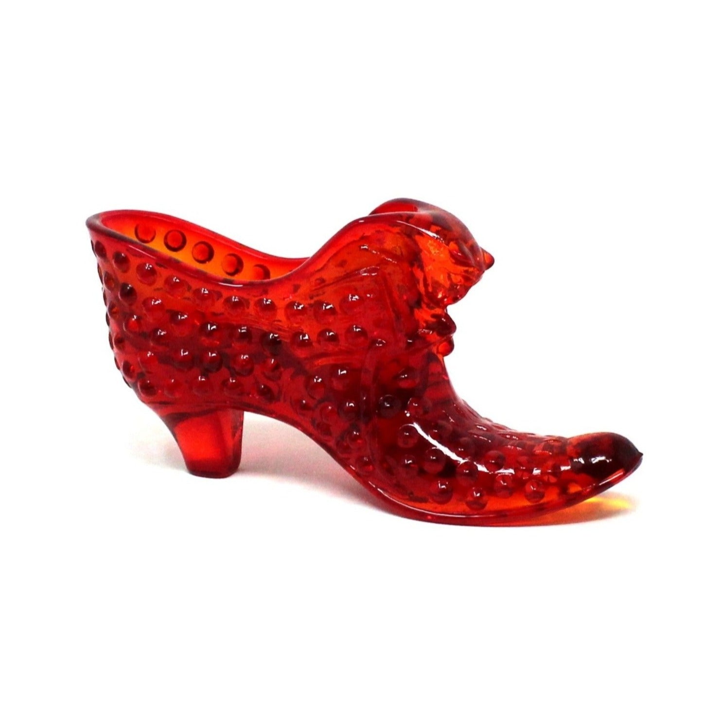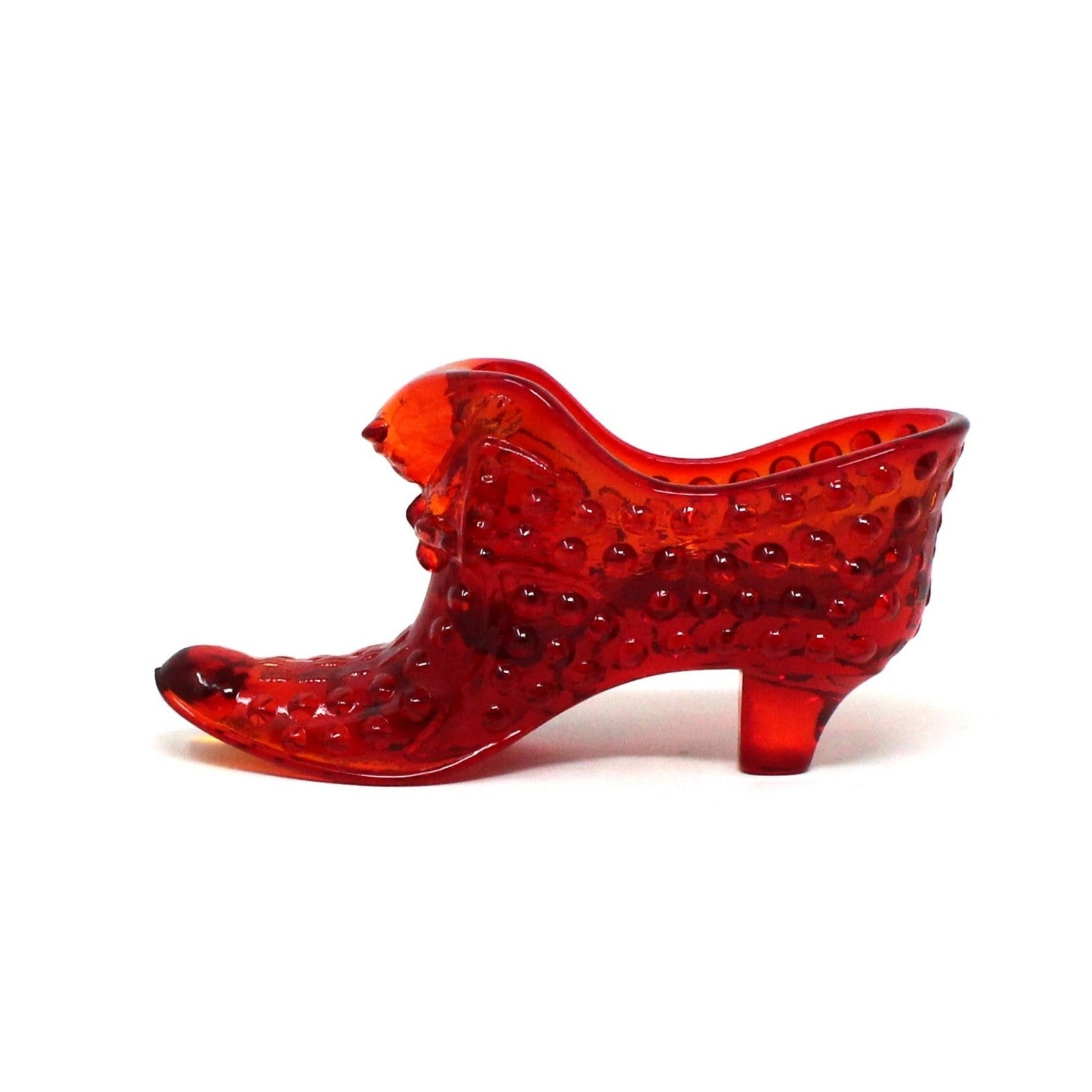 - Details: Adorable and highly collectible, these Fenton Slippers, (also known as Fenton Cat Shoes), are the perfect little objects to add a pop of color to any spot in the house. Fenton made the first glass slipper in 1937, this one was introduced in 1963, in the Hobnail pattern (1939), in Orange Glass, (Fenton named this color Valencia Orange, not Amberina, but many still refer to it as Amberina). The cat head detail is really cute and the reason for the nickname Cat Head Shoe. Not only beautiful displayed as collectibles, these little shoes can be filled with any small item of your choosing. We have used ours for Business cards or Post It notes in the office, or filled with matchbooks alongside our candles. We're sure you'll think of many other uses!