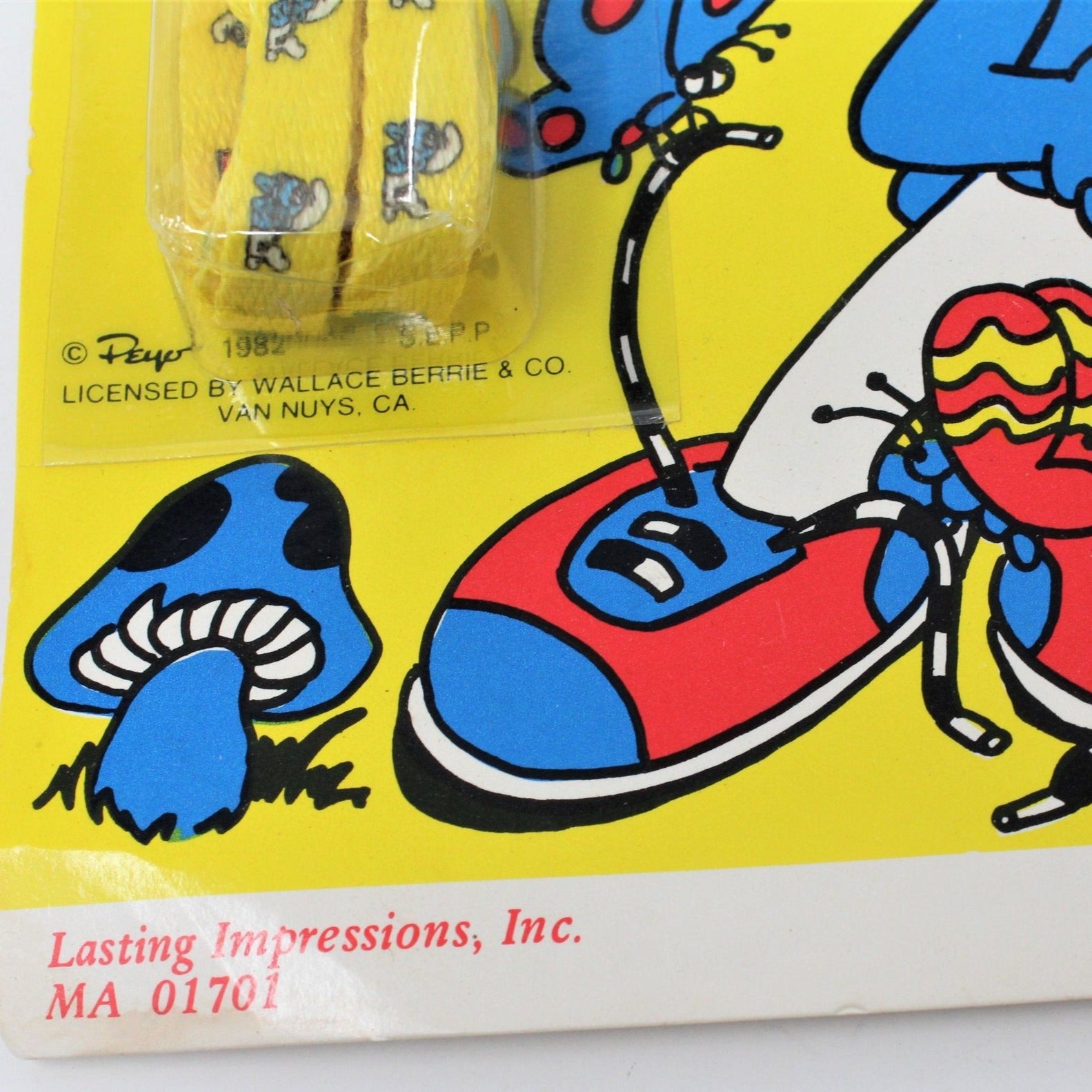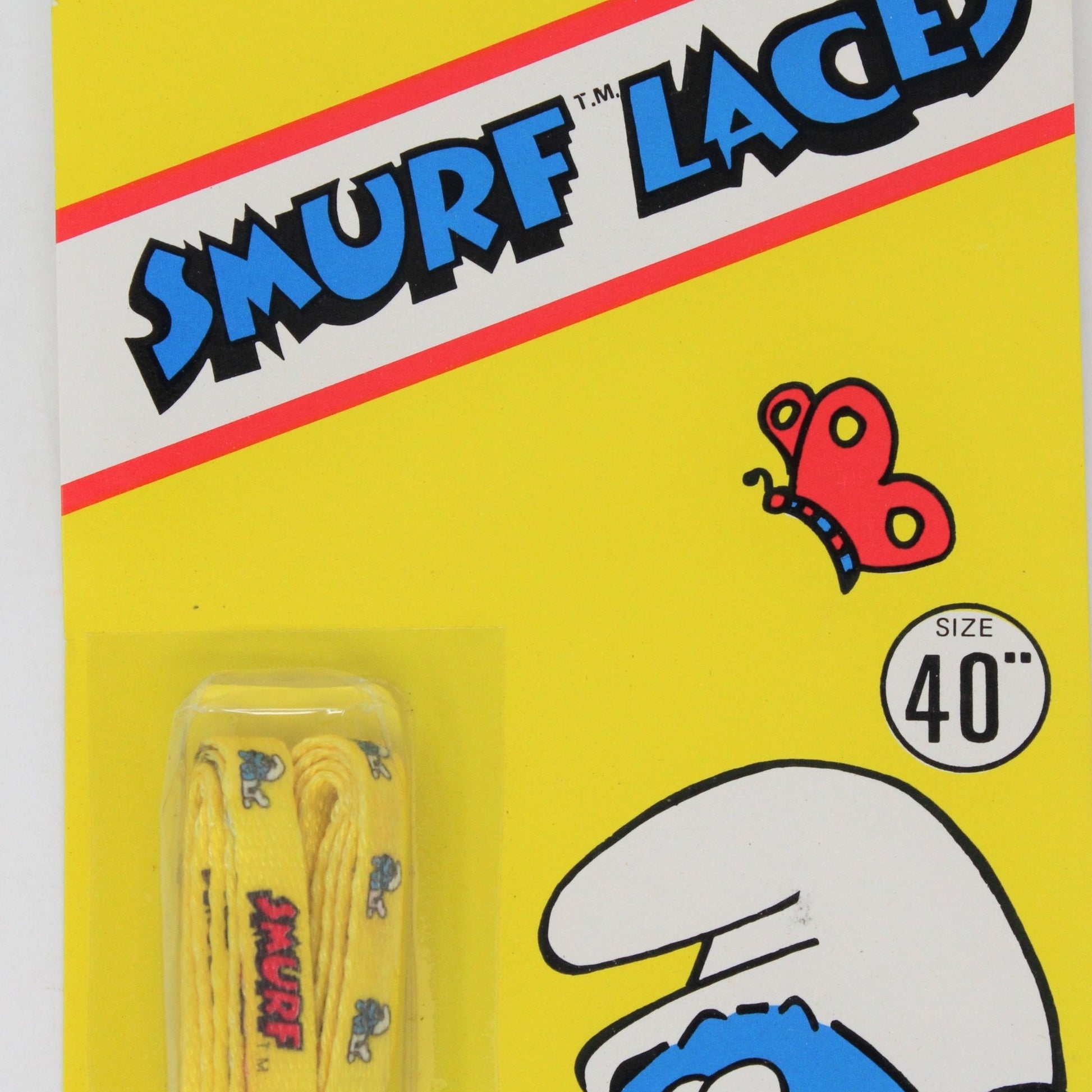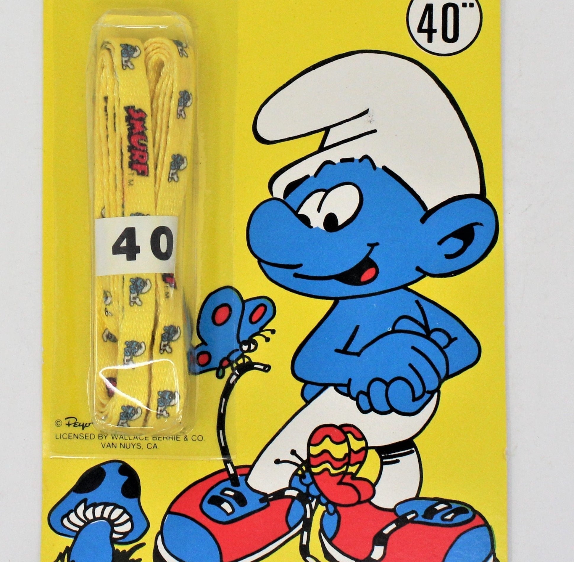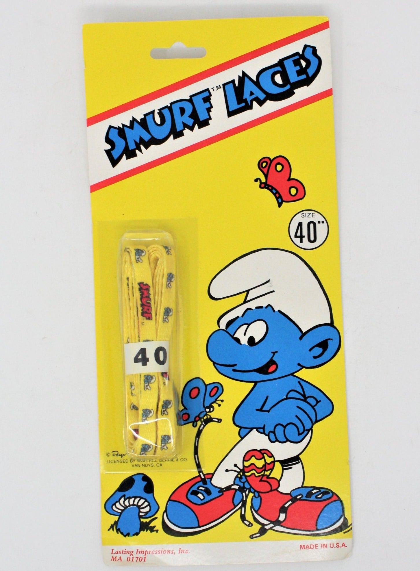 - Details: This is a very cute set of shoe laces, featuring the Smurfs. The laces have a yellow background with the red Smurf wordmark and a picture of a Smurf repeated throughout the laces. The display card (blister card) is unopened and reads: "Smurf Laces, size 40", Lasting Impressions, Inc. MA 01701, Peyo, 1982, Licensed by Wallace Berrie & Co, Van Nuys, CA, Made in USA". Great gift for a Smurfs fan or Smurfs memorabilia collector. We have 3 in stock, all are yellow, all are size 40".