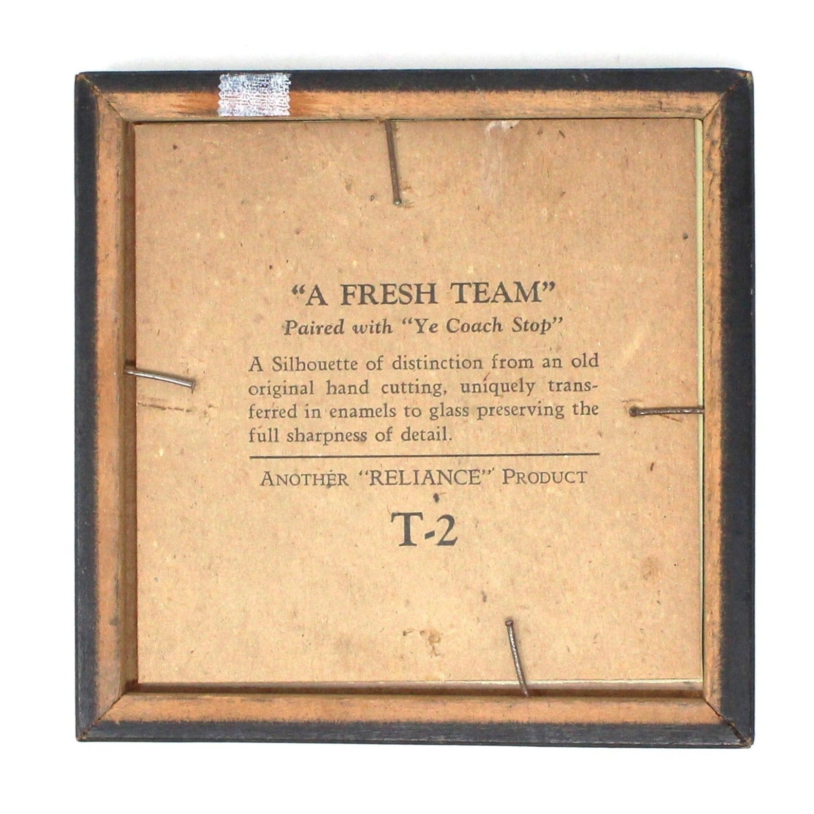 - Details: This reverse painted glass silhouette shows a stagecoach lead by four horses. It is an enamel transfer on glass with a nice black and gold wood frame. Made by Reliance Picture Frame Company in Chicago, one of three Reliance Co divisions. The back reads in part: "A Silhouette of distinction from an old original hand cutting, uniquely transferred in enamels to glass preserving the full sharpness of detail. Another "Reliance" product. Today, silhouettes are back in style and can be mixed with other portraits, among wall plates, or displayed on their own.