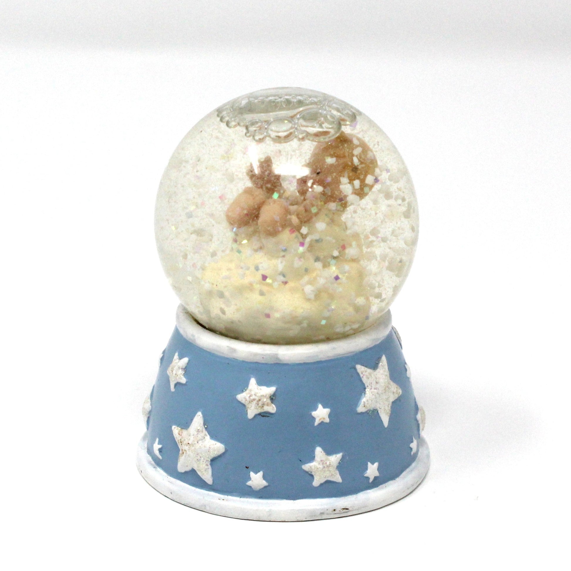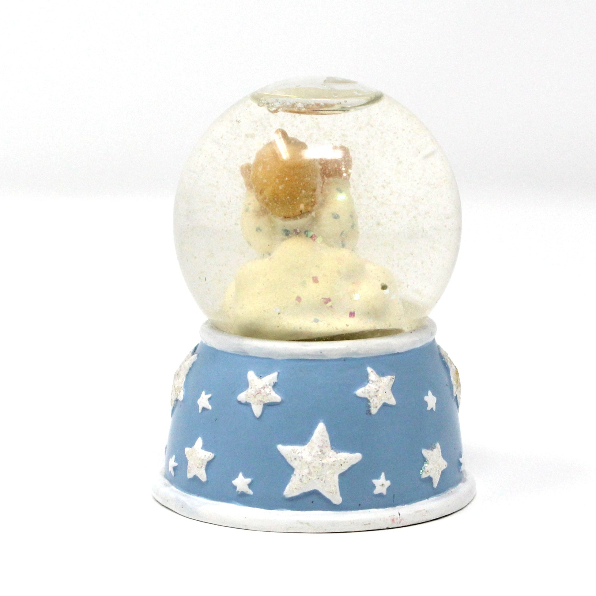 - Details: A very cute mini snowglobe for your favorite Snowglobe collector or new Mom. It's a little baby wearing a white onesie with blue dots, laying on a cloud. The base is blue and white with white stars covered in glitter. It retains the original Made in China label. Cute little addition for a nursery, as baby shower decor, or displayed as collectible.