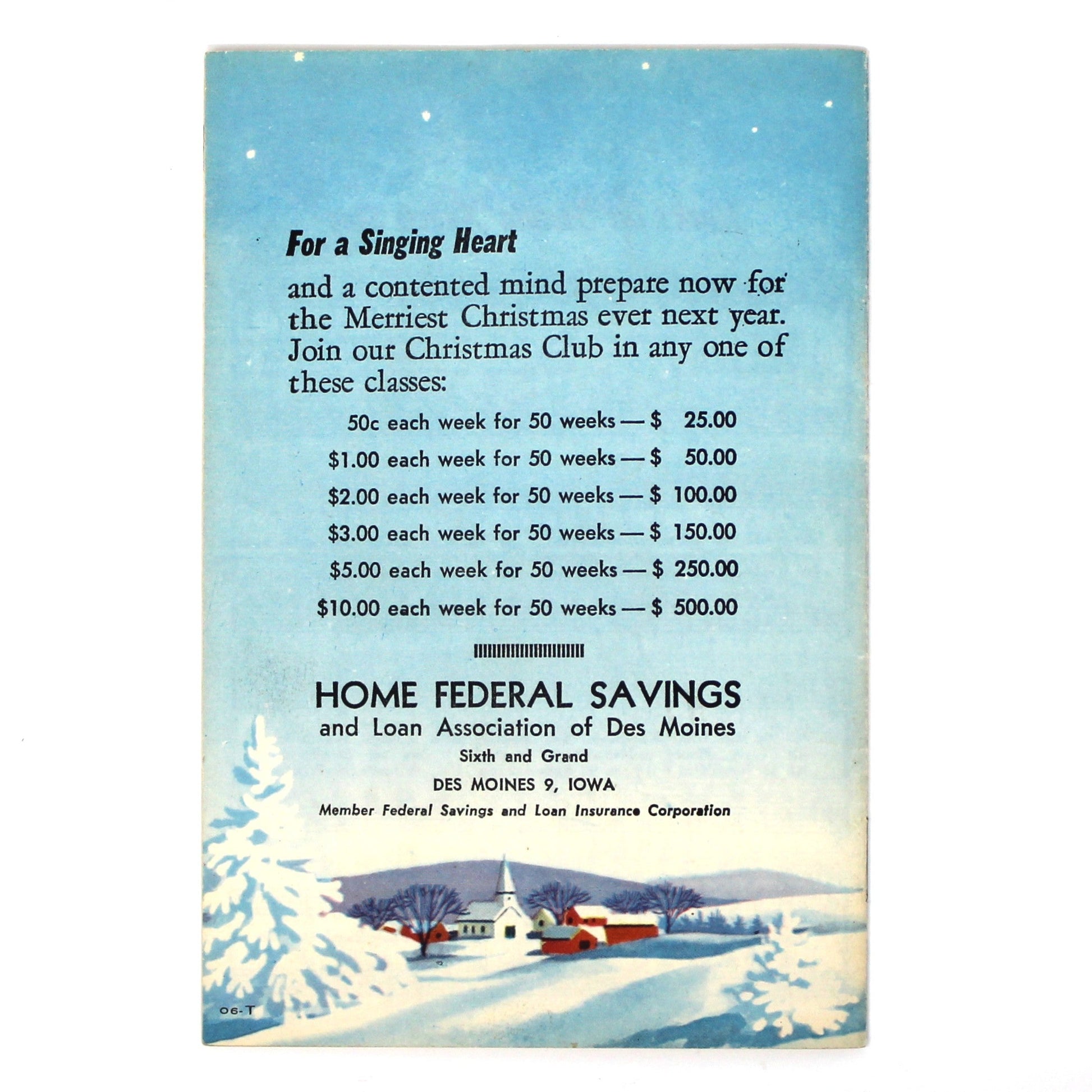These vintage Christmas songbooks were promotional items given by banks, stores and many other businesses.  Typical of the mid-20th century, circa 1950s and 1960s.  This one is from Home Federal Savings and Loan Assoc of Des Moines, opened in 1929.  They are remembered for their contribution to beautiful architecture in public spaces.  Their mid century modern building, constructed in 1962, is considered "one of the most well-known examples of mid-century modern architecture in Des Moines.  Designed by the prominent Chicago architect Ludwig Mies van der Rohe, it is one of the first steel and glass modernist buildings in the city's downtown.  We believe they went out of business during the "Savings and Loan Crisis", (1980's to 1990), when over 1,000 savings and loans failed and the Federal Savings and Loan Insurance Corporation (FSLIC) went bankrupt. This period saw the largest bank collapse since the Great Depression.