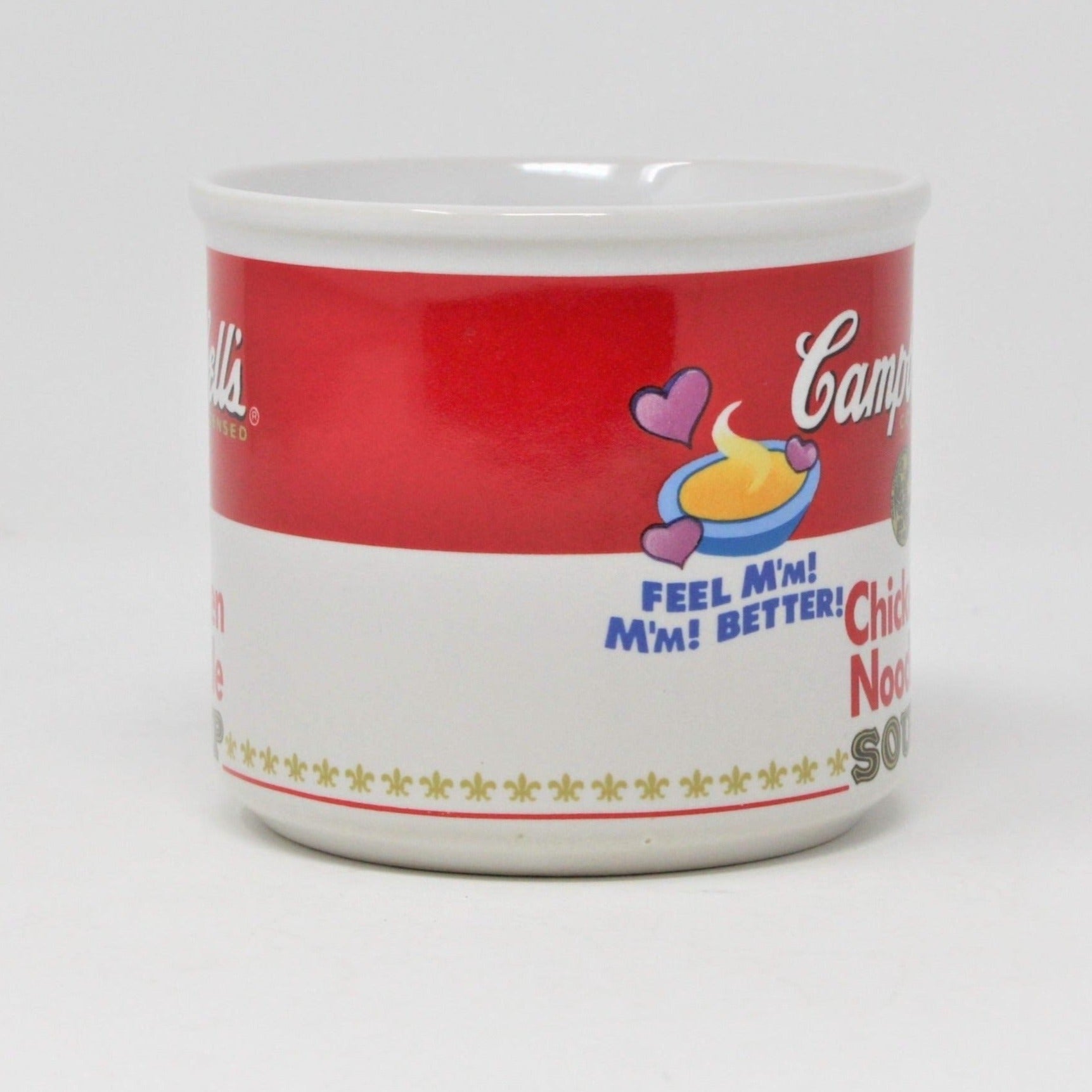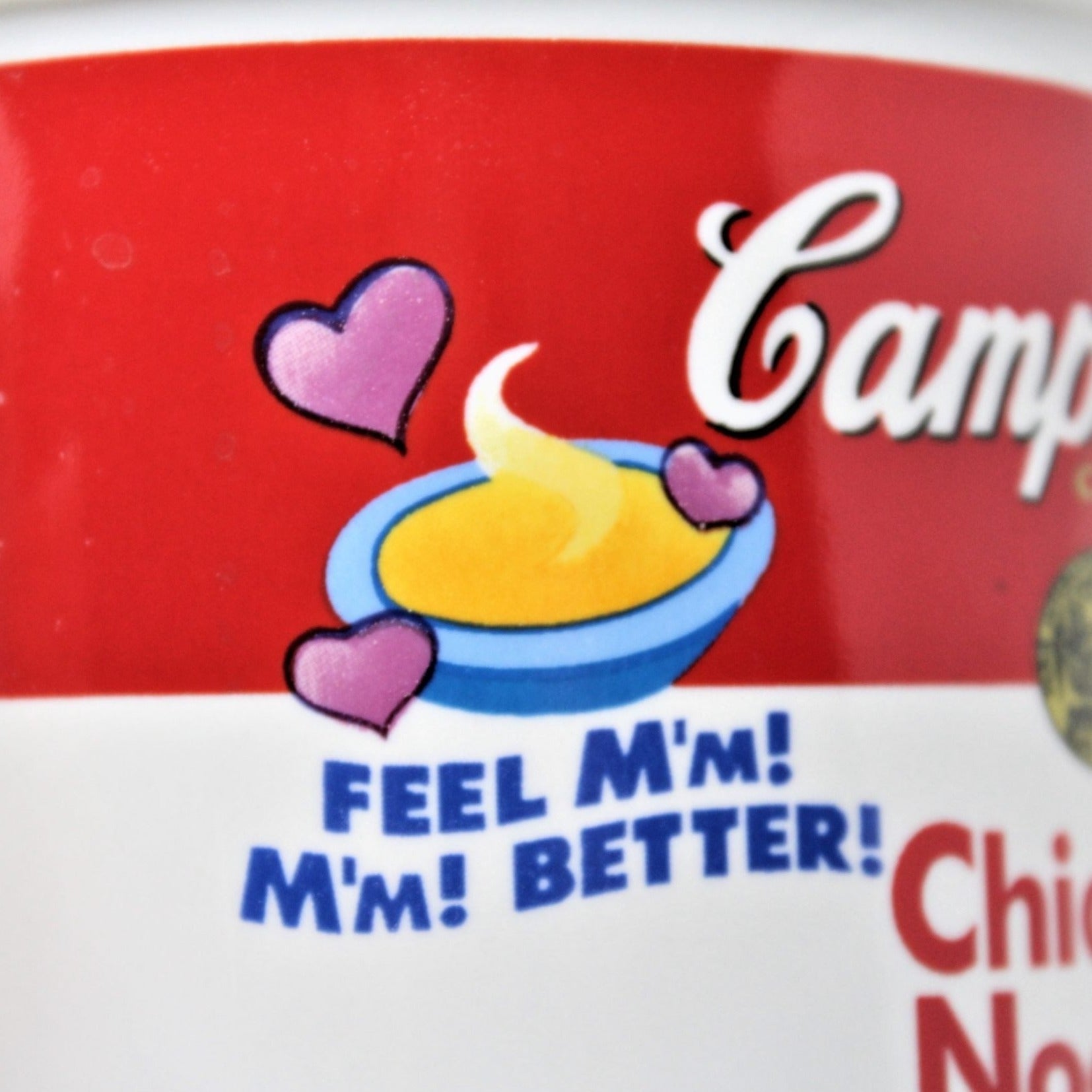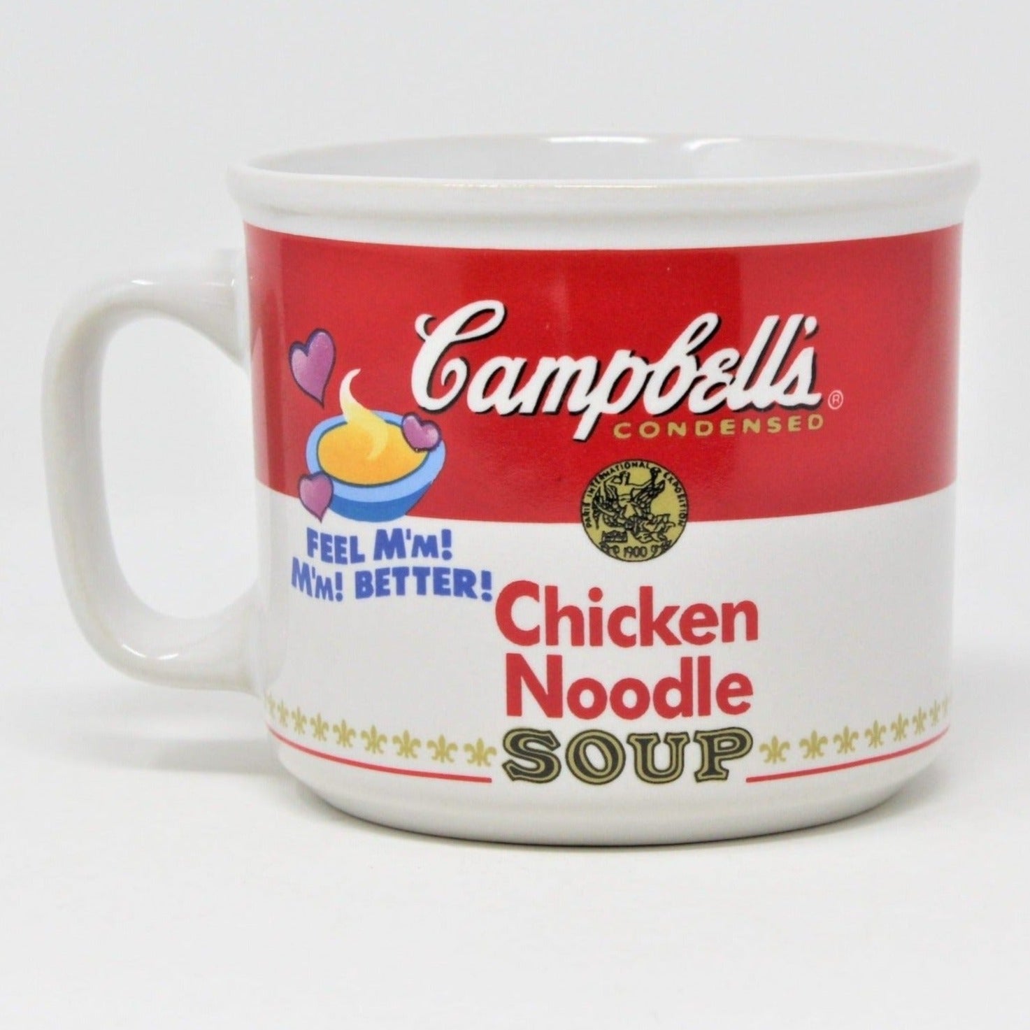 - Details: Probably one of the best "Get Well Soon" gifts around! A ceramic Campbell's Chicken Noodle Soup mug, maybe add some homemade or Campbell's soup and it will be very much appreciated. Fall and Winter are notorious flu and cold season, so this will be the perfect mug to have on hand for family and friends that get hit by these viruses in the coming months. This mug was released by Westwood and features a bowl of chicken noodle soup surrounded by pink hearts and the famous "M'm M'm Good" changed to " Feel M'm! M'm! Better!". The rest is the iconic Campbells red and traditional look, same design on both sides. The mug is stamped on the bottom: "1997 and trademarks licensed by Campbell Soup Co. All Rights Reserved, By West Wood". We carry several Campbell's Soup Mugs, (while supplies last), we offer a 20% discount with the purchase of 3 or more, mix and match. Please Contact Us for discount code and let us know which mugs you would like prior to purchasing.