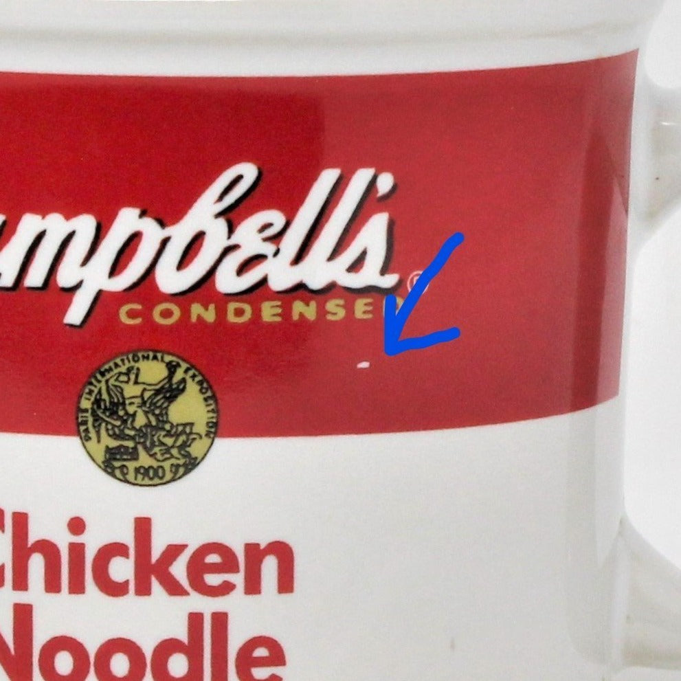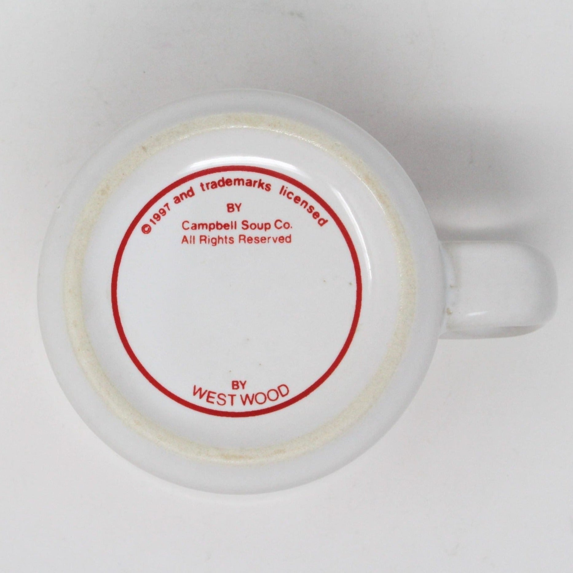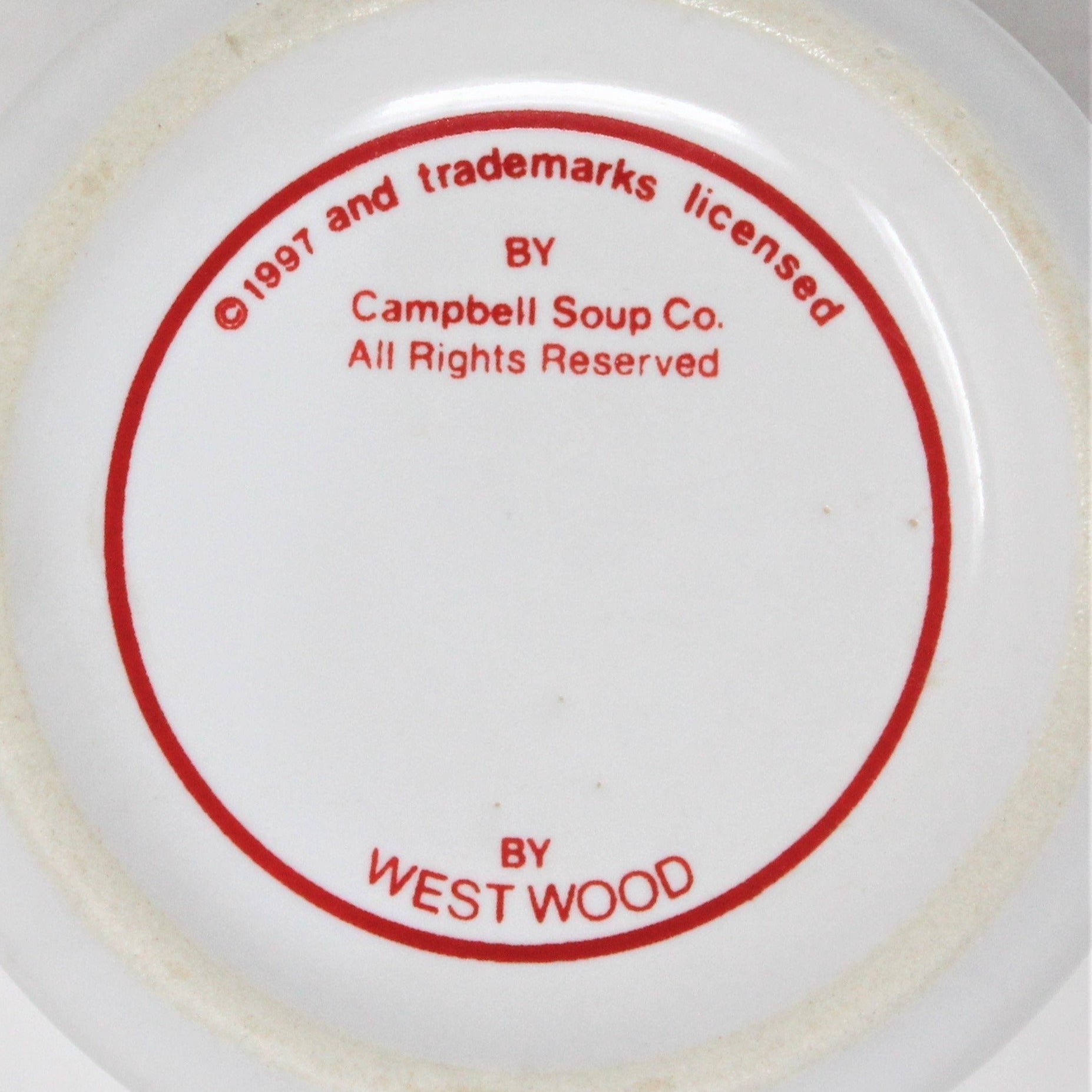 - Details: Probably one of the best "Get Well Soon" gifts around! A ceramic Campbell's Chicken Noodle Soup mug, maybe add some homemade or Campbell's soup and it will be very much appreciated. Fall and Winter are notorious flu and cold season, so this will be the perfect mug to have on hand for family and friends that get hit by these viruses in the coming months. This mug was released by Westwood and features a bowl of chicken noodle soup surrounded by pink hearts and the famous "M'm M'm Good" changed to " Feel M'm! M'm! Better!". The rest is the iconic Campbells red and traditional look, same design on both sides. The mug is stamped on the bottom: "1997 and trademarks licensed by Campbell Soup Co. All Rights Reserved, By West Wood". We carry several Campbell's Soup Mugs, (while supplies last), we offer a 20% discount with the purchase of 3 or more, mix and match. Please Contact Us for discount code and let us know which mugs you would like prior to purchasing.
