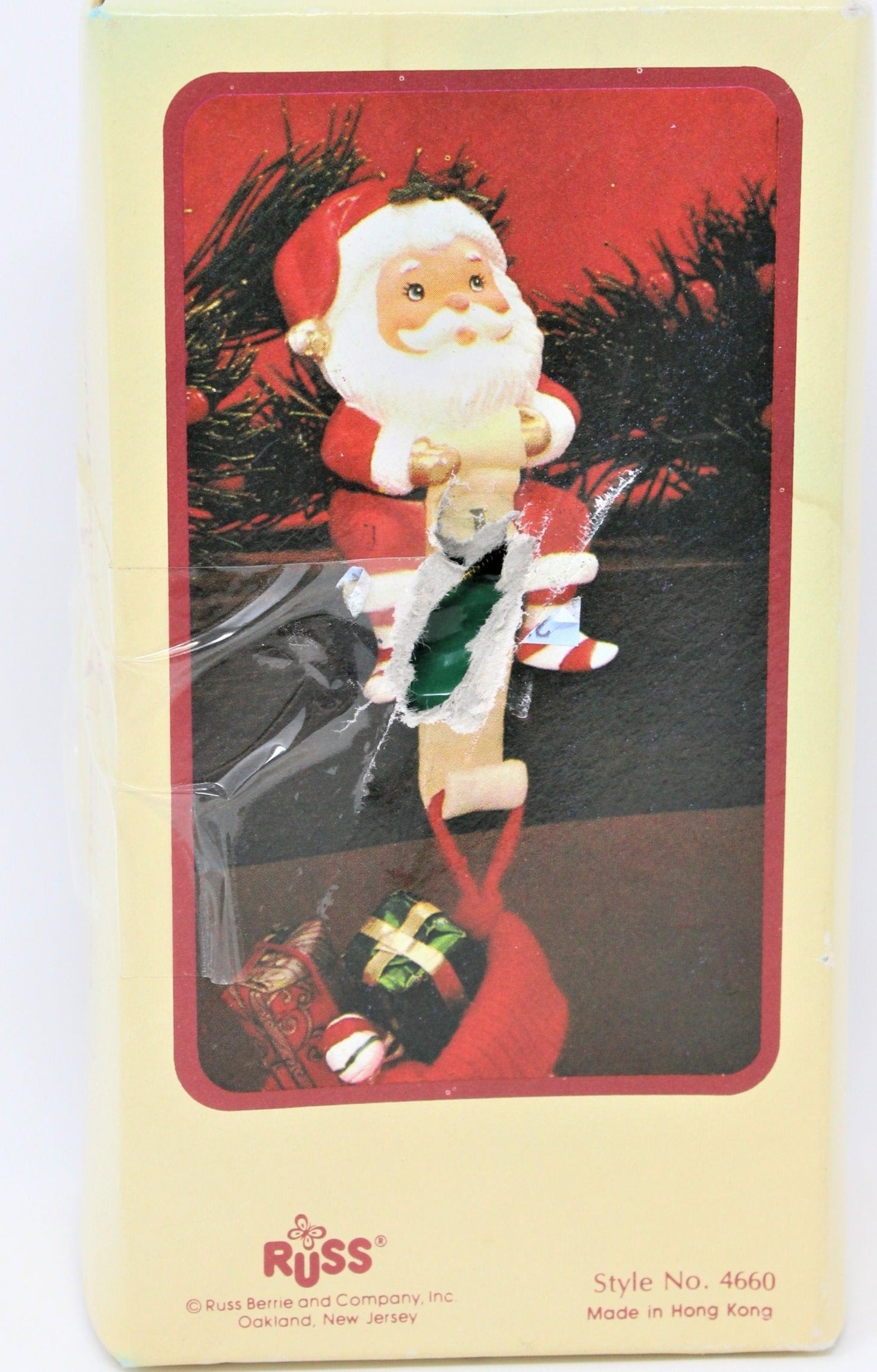 - Details: A very cute stocking hanger, Santa is sitting down reading his very long list. The list has the word JOY in large letters and ends in a hook to hang the stocking. Santa must be at home because he's not wearing his boots, has red and white striped stocks on. However, he is wearing his famous red suit and hat, adorned with a holly sprig. The hanger is in its original box, but the box is best for storing the ornament, not for gift giving, it is in rough condition. The box retains its original foil label that reads: "Christmas Stocking Hanger by Russ". This will make a great addition to your mantel or shelf, on a wreath, or even hanging on the Christmas tree. Perfect stocking stuffer!