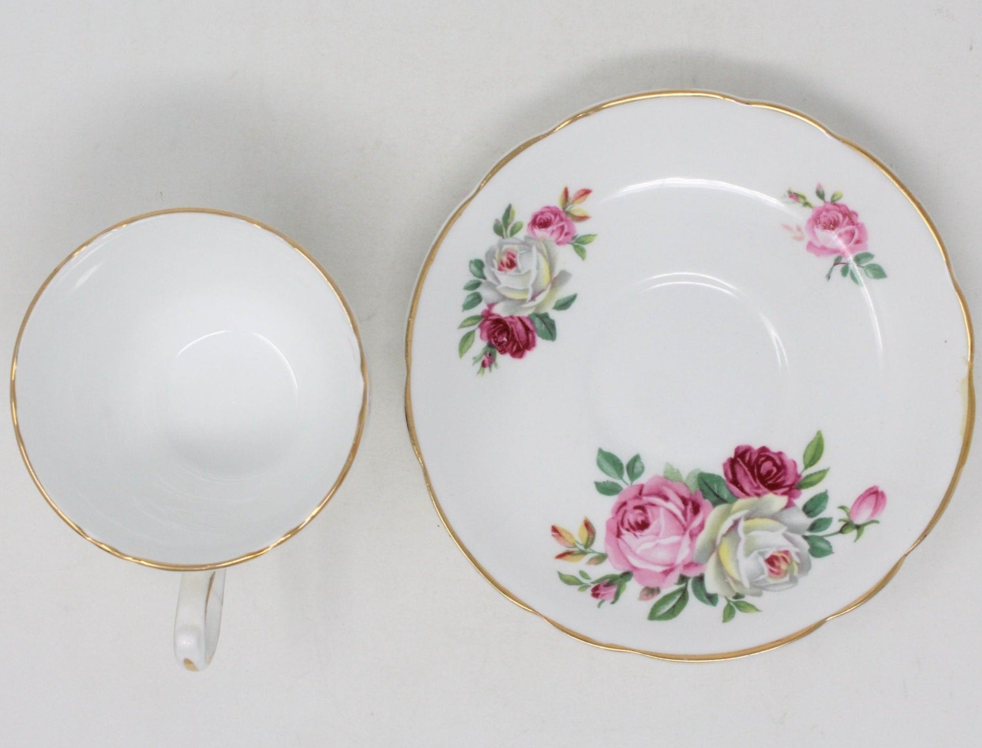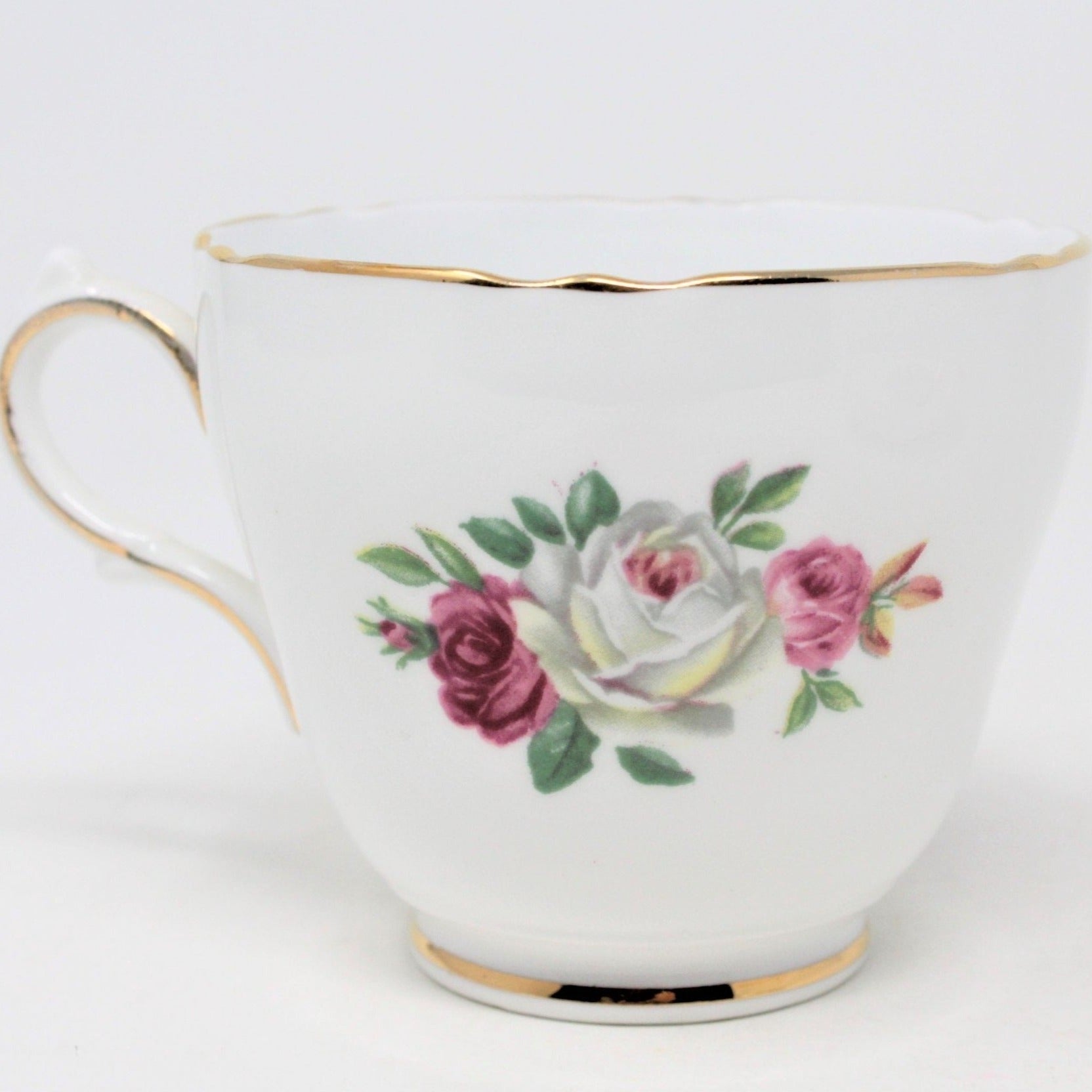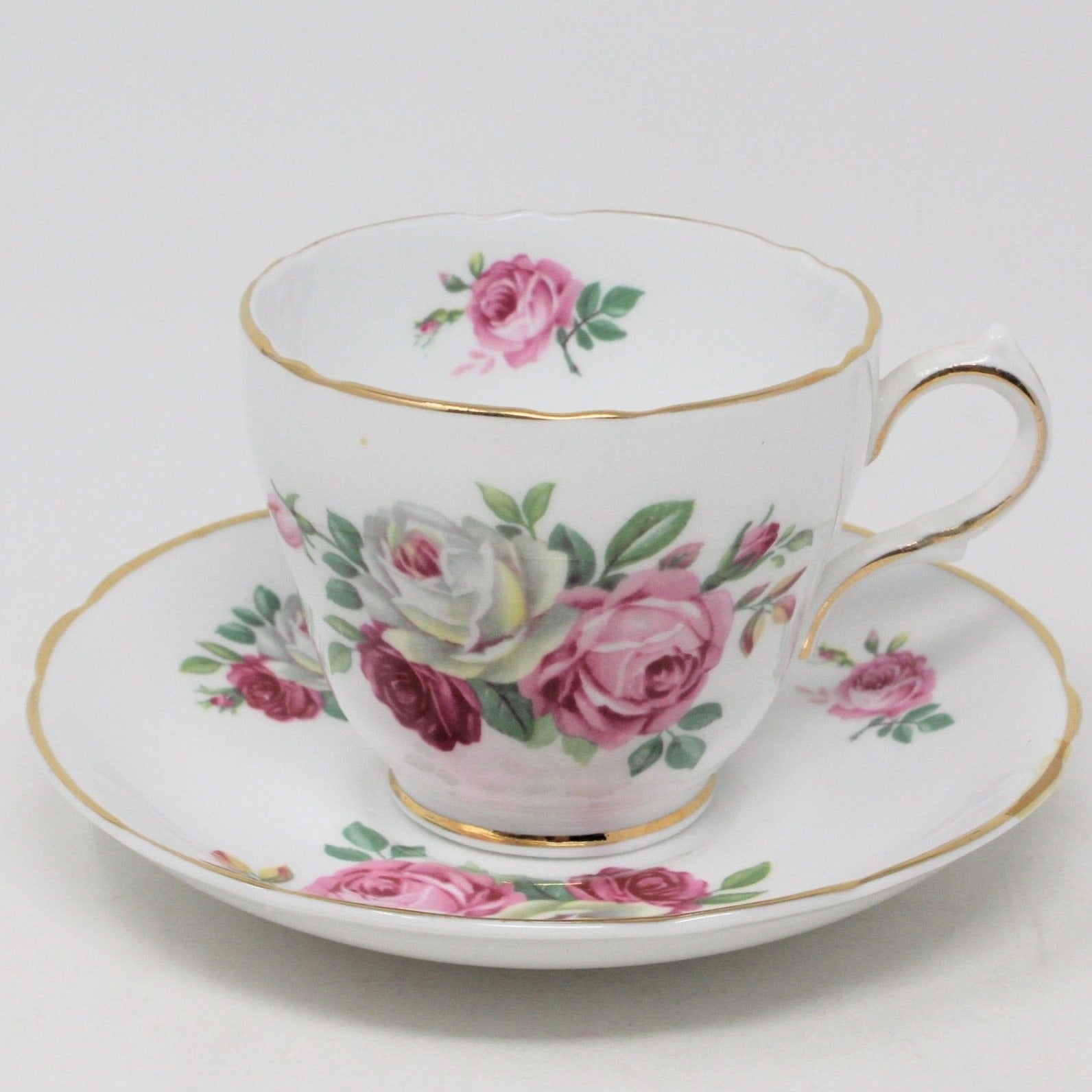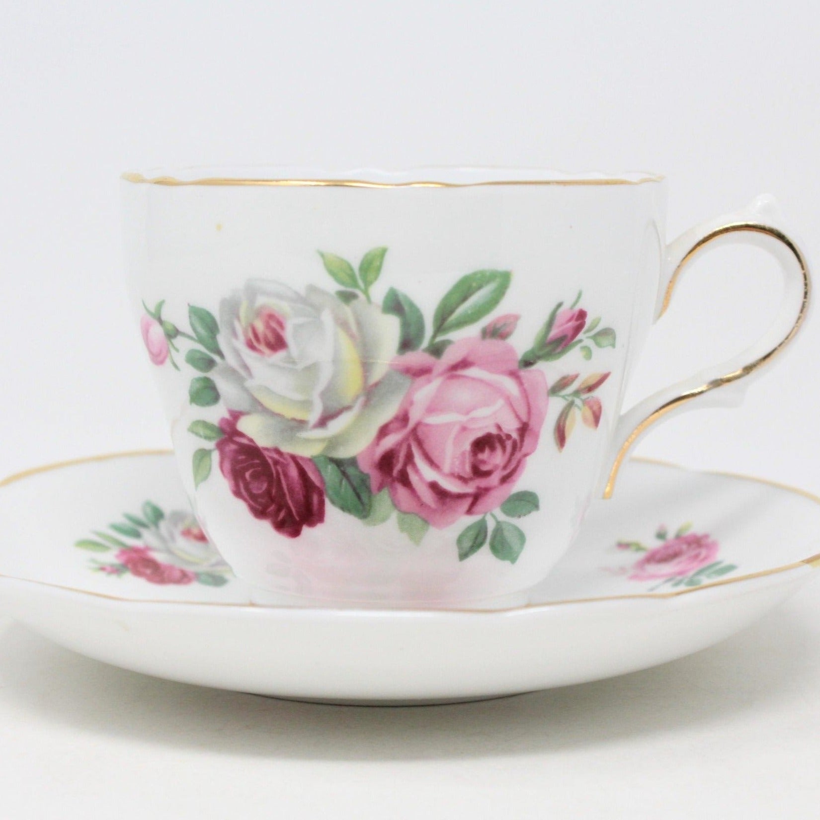 - Pattern: Vintage Tea Cup & Saucer, English Bone China, Pink, Red and White Roses, (Discontinued)