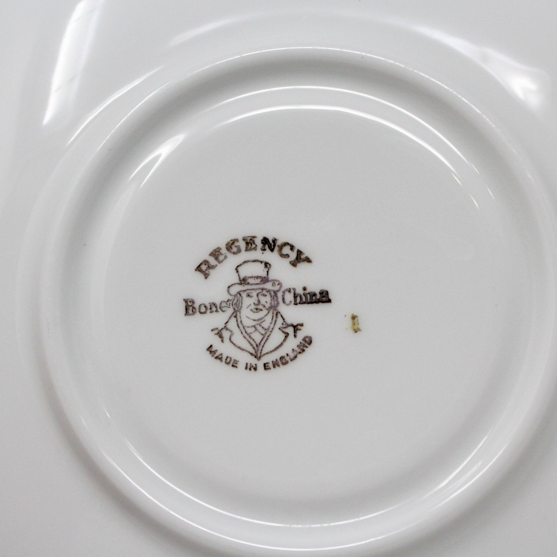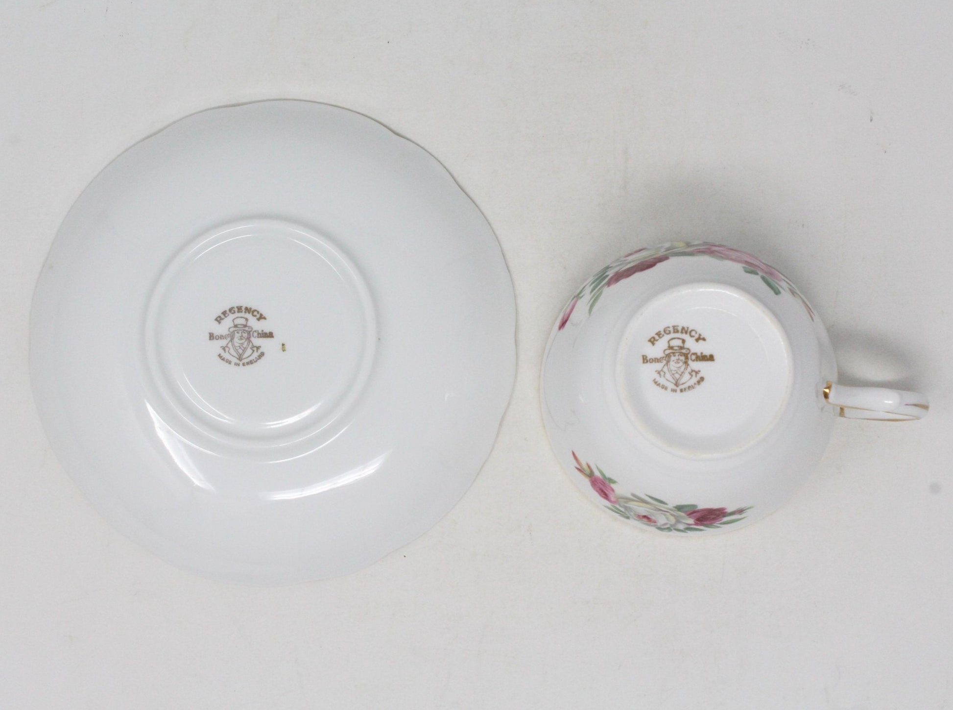 - Details: This is a very beautiful bone china cup with matching saucer, the pictures do not fully represent the beauty of this piece. The floral pattern consists of three large roses, red, pink and white and green leaves. Both the saucer and the cup have a gold rim that is "ruffled", creating a beautiful effect. The cup has gold around the bottom rim plus a small gold detail on the handle. It is stamped on the bottom with the older Regency logo, we have estimated the age based on the backstamp. A lovely set, ideal for the tea cup collector, as a Mother's Day gift, for a beautiful Spring luncheon or Tea Party or for a Bridal Shower gift, or of course for your favorite tea lover or you!