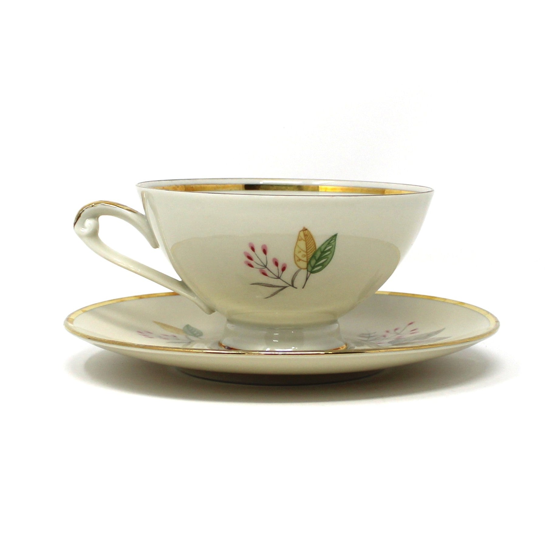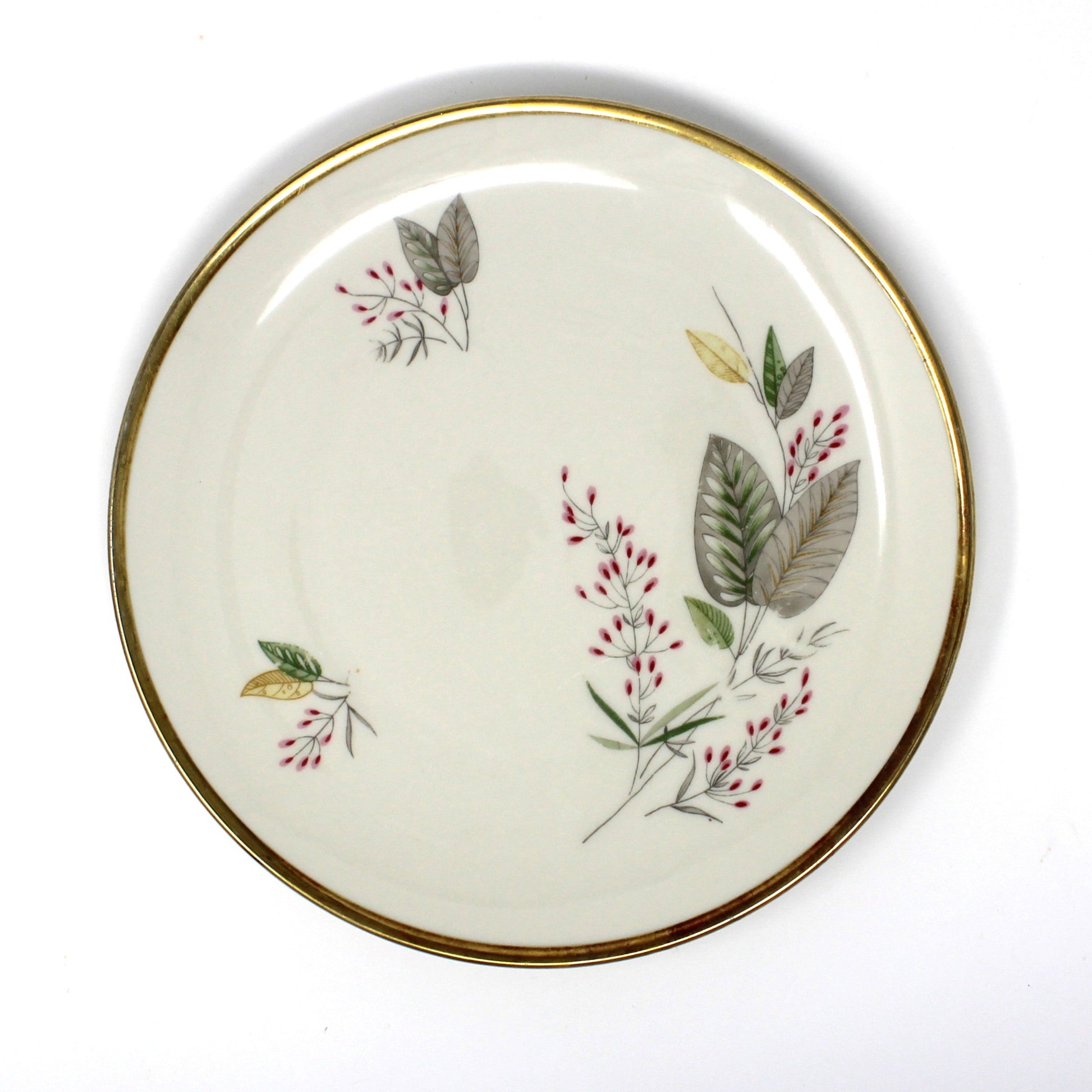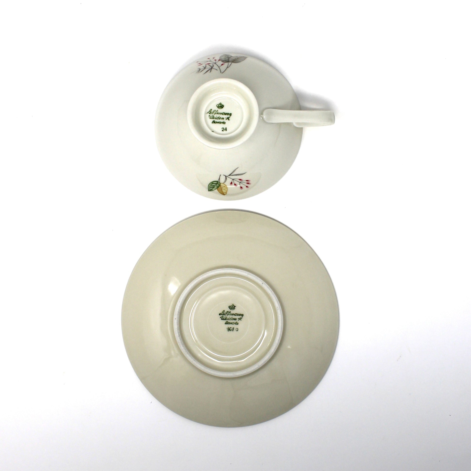 - Details: This set of teacup, saucer plus larger Salad Plate set is so beautiful and a very RARE find! It features a bouquet of fenestrated leaves, aka Monstera leaves, with tiny red floral branches, absolutely beautiful! The leaf designs are on the inside and outside of the cup, all pieces rimmed in gold. The backstamp shows these pieces are from Seltmann Weiden in Bavaria, the "K" stands for Krummennaab factory. Based on the "K" mark, we are able to date this cup from 1939 to sometime before 1945, since Wilhelm acquired this factory in 1939 and WWII destroyed it. A set with a rich history and a gorgeous pattern for anyone who loves Monstera plants or the finer things in life.