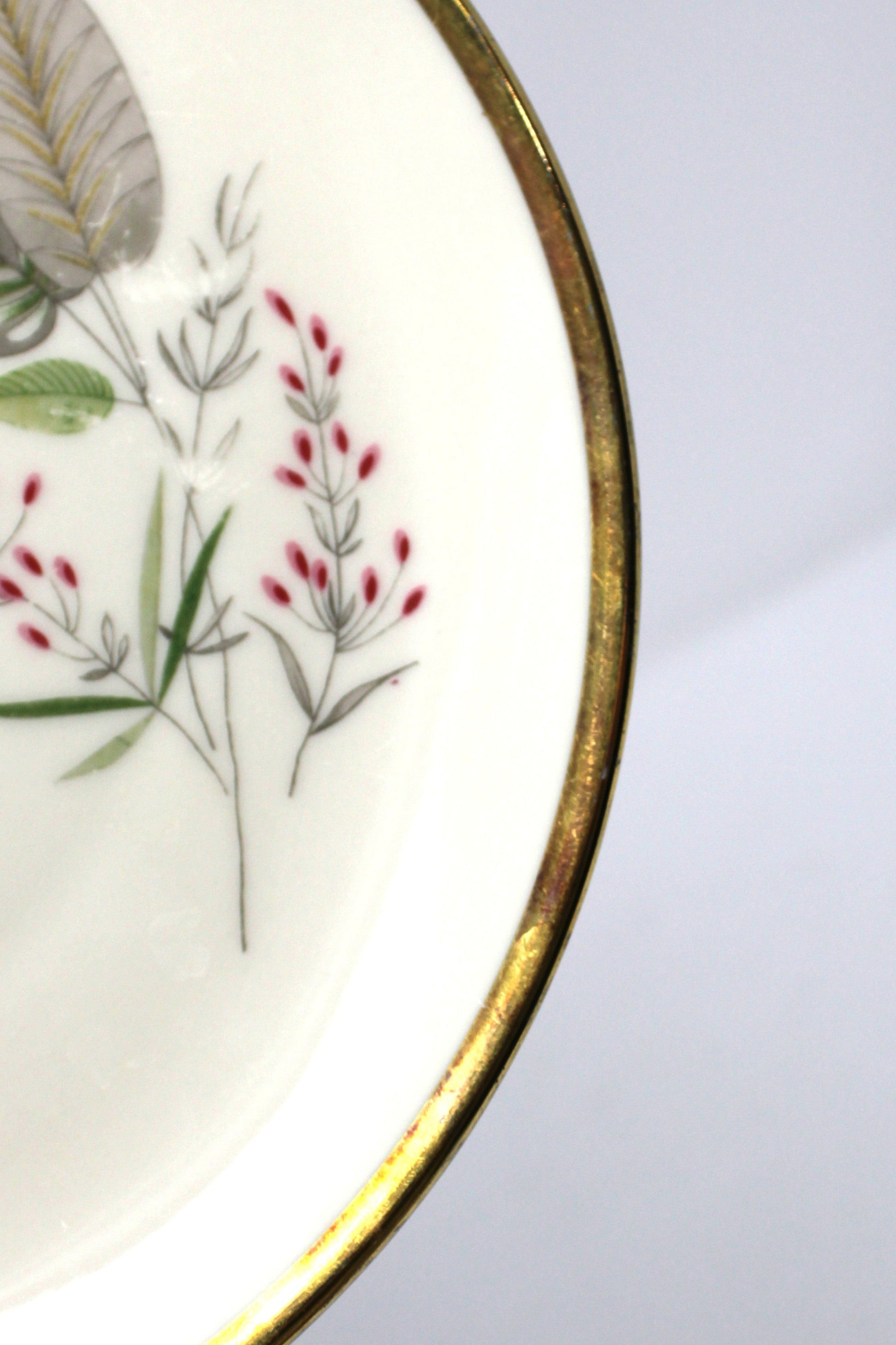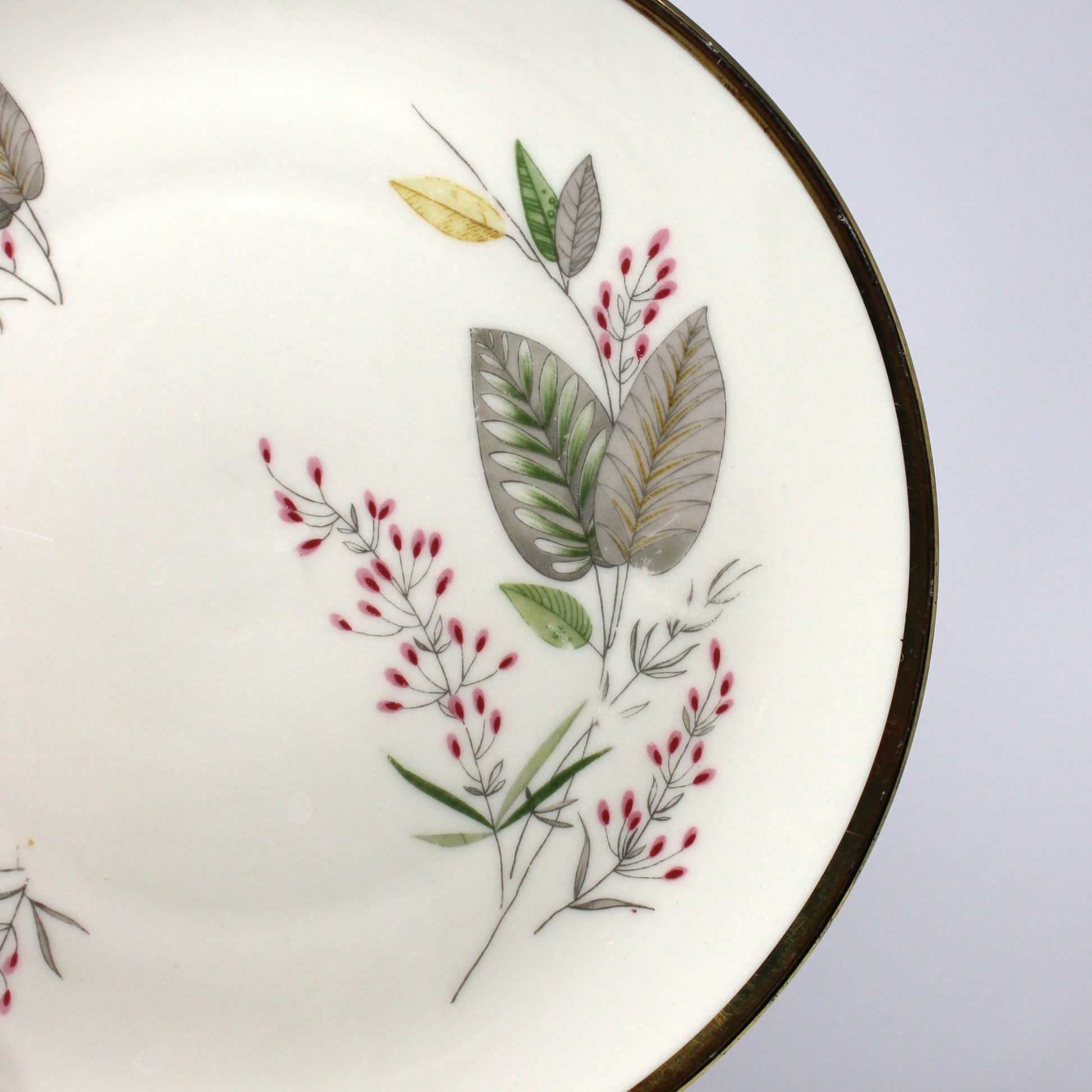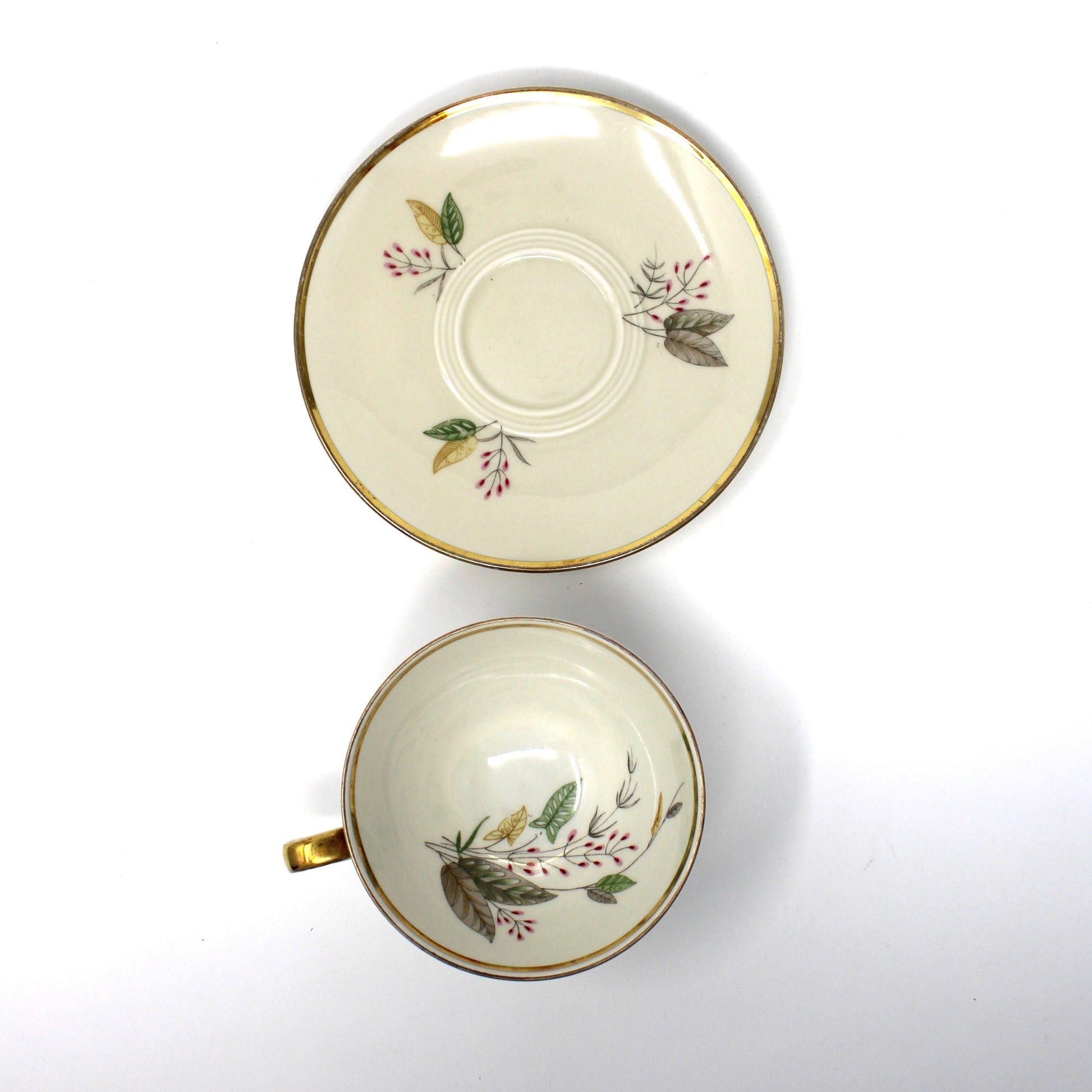 - Details: This set of teacup, saucer plus larger Salad Plate set is so beautiful and a very RARE find! It features a bouquet of fenestrated leaves, aka Monstera leaves, with tiny red floral branches, absolutely beautiful! The leaf designs are on the inside and outside of the cup, all pieces rimmed in gold. The backstamp shows these pieces are from Seltmann Weiden in Bavaria, the "K" stands for Krummennaab factory. Based on the "K" mark, we are able to date this cup from 1939 to sometime before 1945, since Wilhelm acquired this factory in 1939 and WWII destroyed it. A set with a rich history and a gorgeous pattern for anyone who loves Monstera plants or the finer things in life.