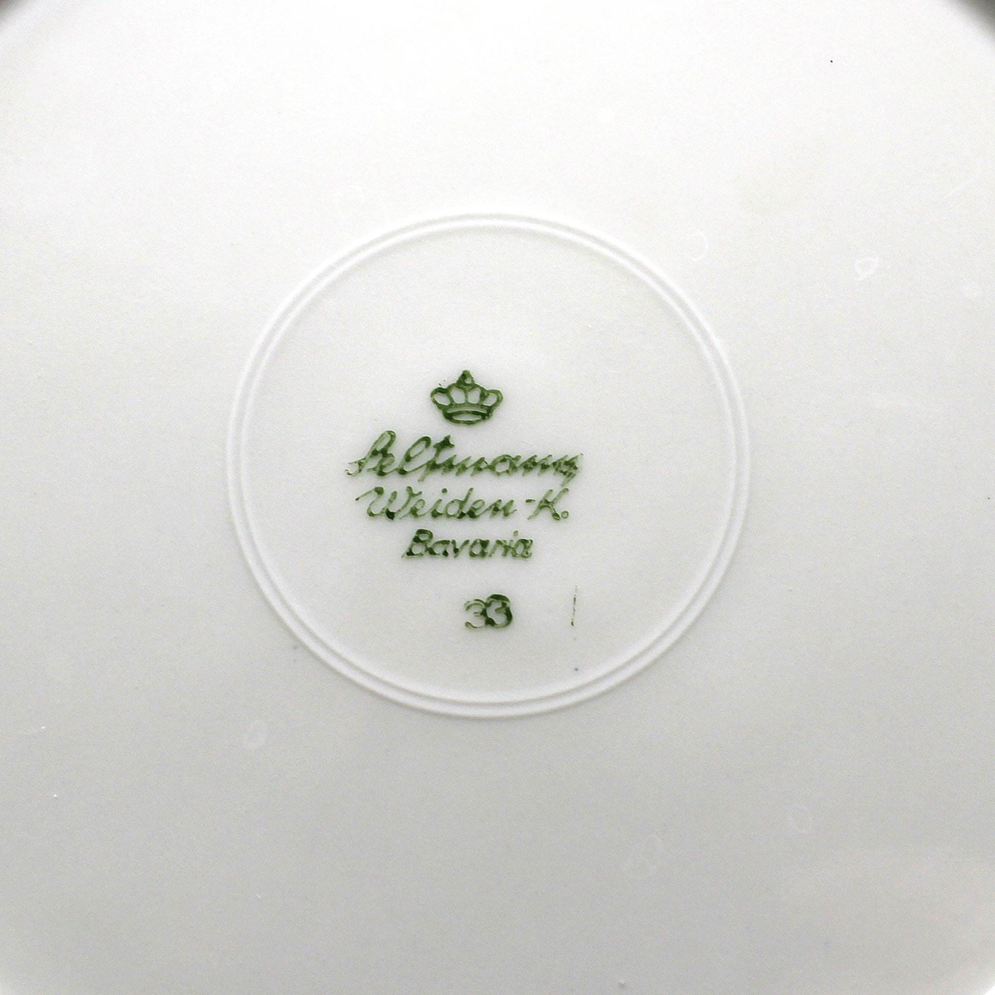 Christian Wilhelm Seltmann, and his brother Johann, established a porcelain factory in Vohenstrauß in 1901, but they parted ways in 1909. Christian opened his own porcelain factory, Seltmann Weiden, in Weiden, Bavaria in 1910 Germany. Unfortunately Christian Seltmann died in an accident in 1921. His widow, Katharina Seltmann, ran the company until she retired, and left the business to their two sons. Heinrich received the Schirnding factory, Wilhelm the Weiden factor. Wilhelm expanded by taking over the Krummennaab factory in 1939 and the Erbendorf factory in 1940. The "K" in this backstamp refers to the factory located in Krummennaab, however, after the war, both factories, this one and the one in Erbendorf, were largely destroyed. An interesting note, these factories served as temporary housing for American soldiers in war time. Wilhelm Seltmann died on September 27th 1967 and left his business in the hands of his family. The Seltmann group is one of a few remaining larger family-run companies in Germany.