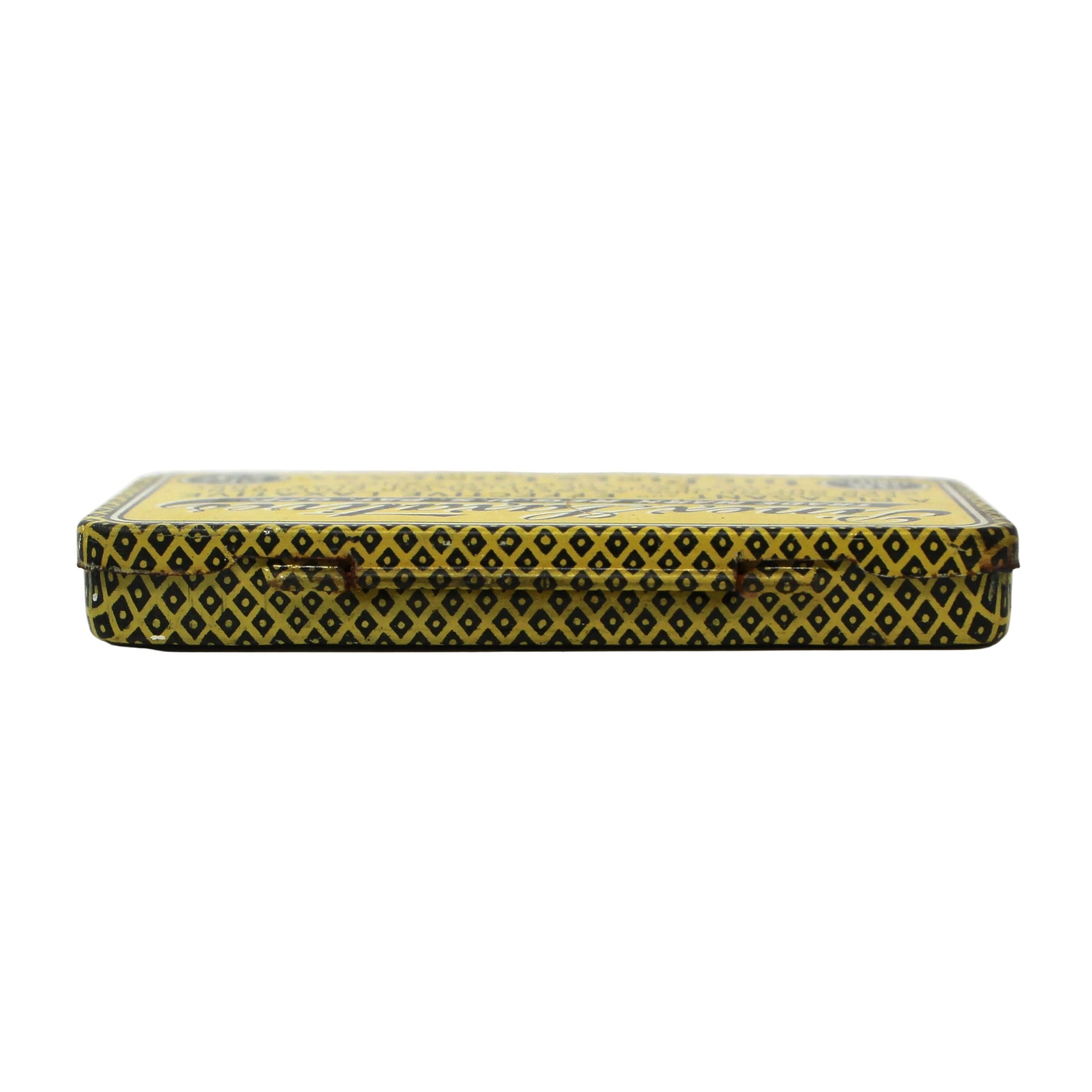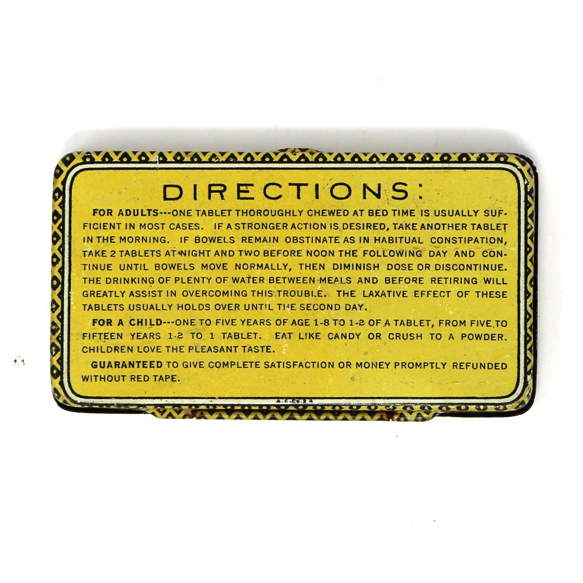 - Details: A wonderful tin full of pharmaceutical nostalgia. It was issued by The Pinex Company (1905 - 1960) with their Pinex Laxative tablets. We couldn't find a trustworthy record of when the laxative was initially introduced but we believe the tins date back to around 1914. These are New Old Stock, unused, empty tins. The hinged lid, bright yellow color and wonderful antique lettering will make this a favorite tin for collectors. Great gift for a pharmaceutical collector, advertisement collector or to store small treasures.