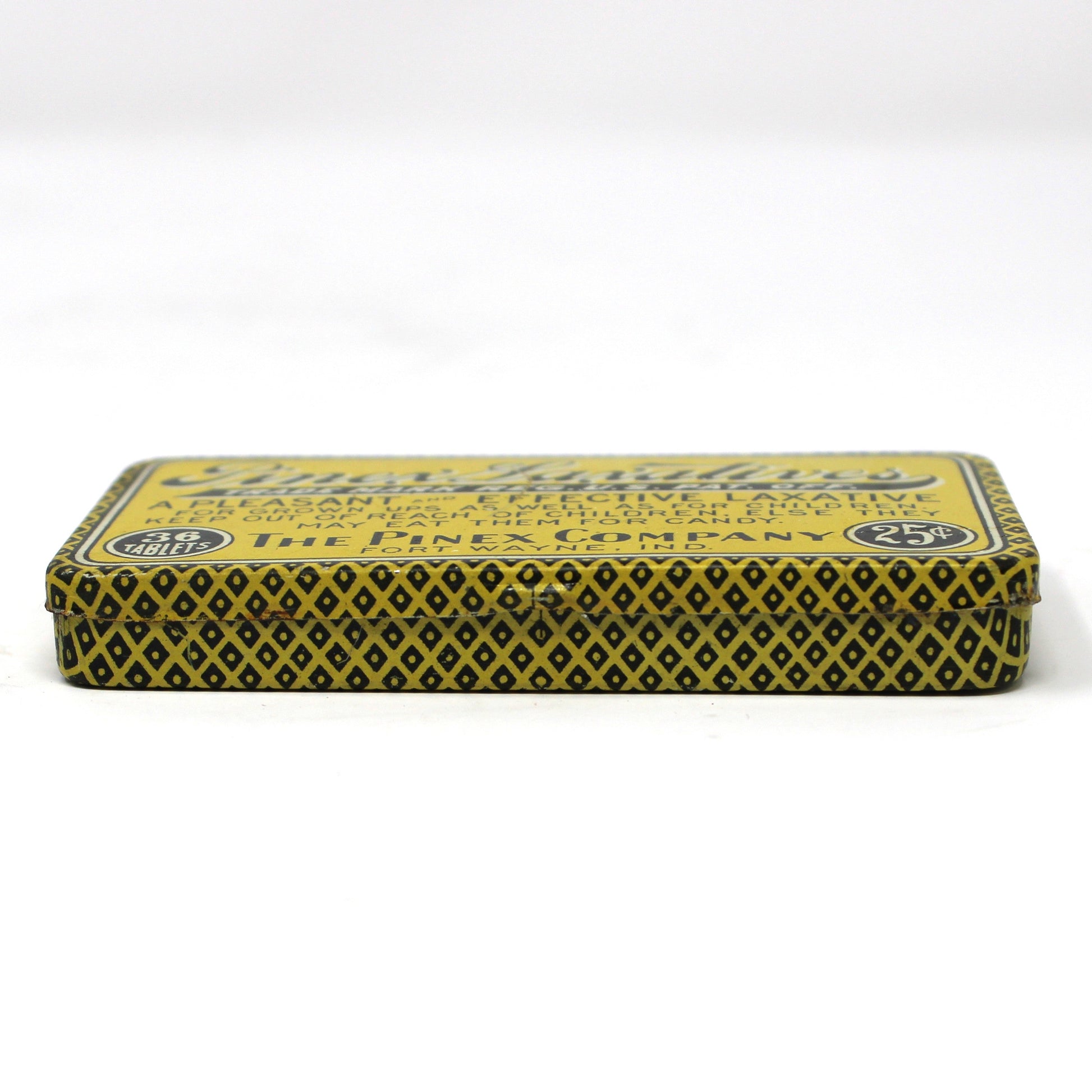 - Antique Medicine Tin, Pinex Laxatives NOS, Pinex Company Fort Wayne, IN, Advertisement Collectors, American Pharmaceutical History, Nostalgia, (Discontinued)