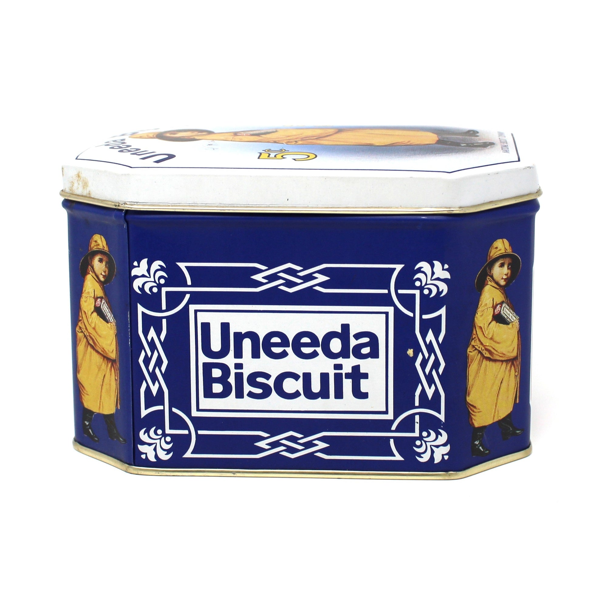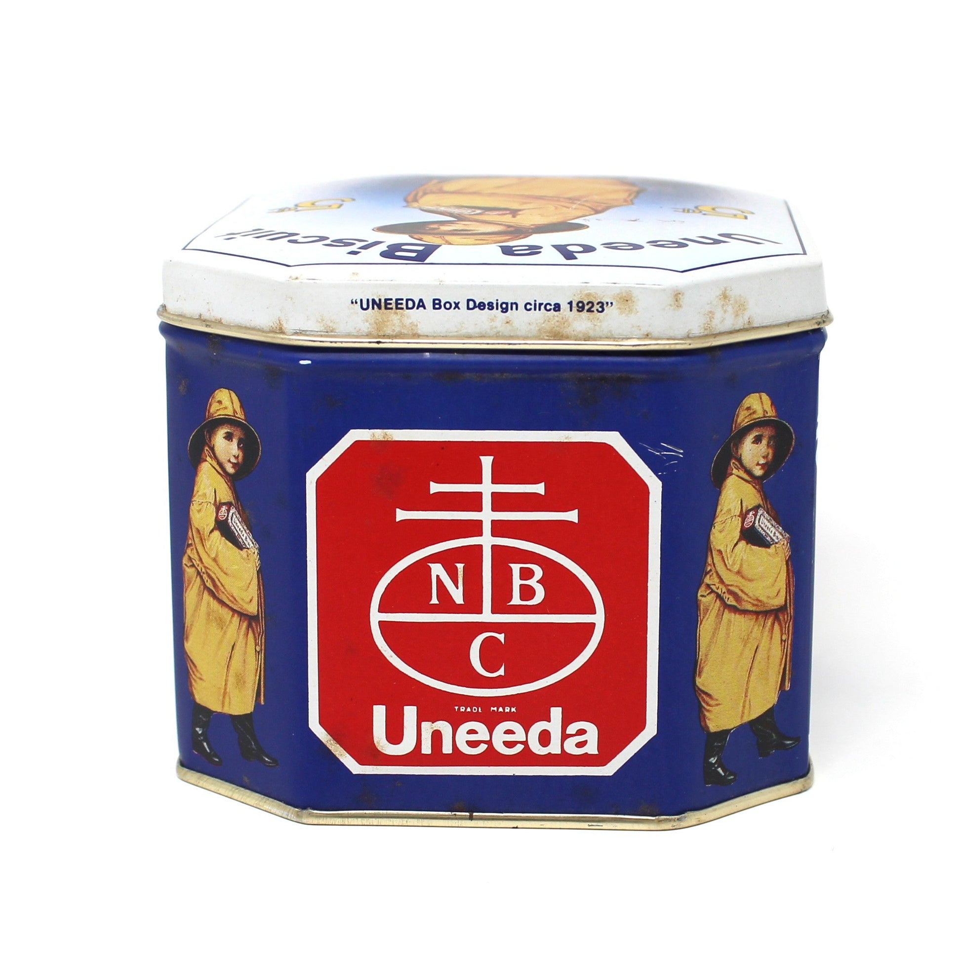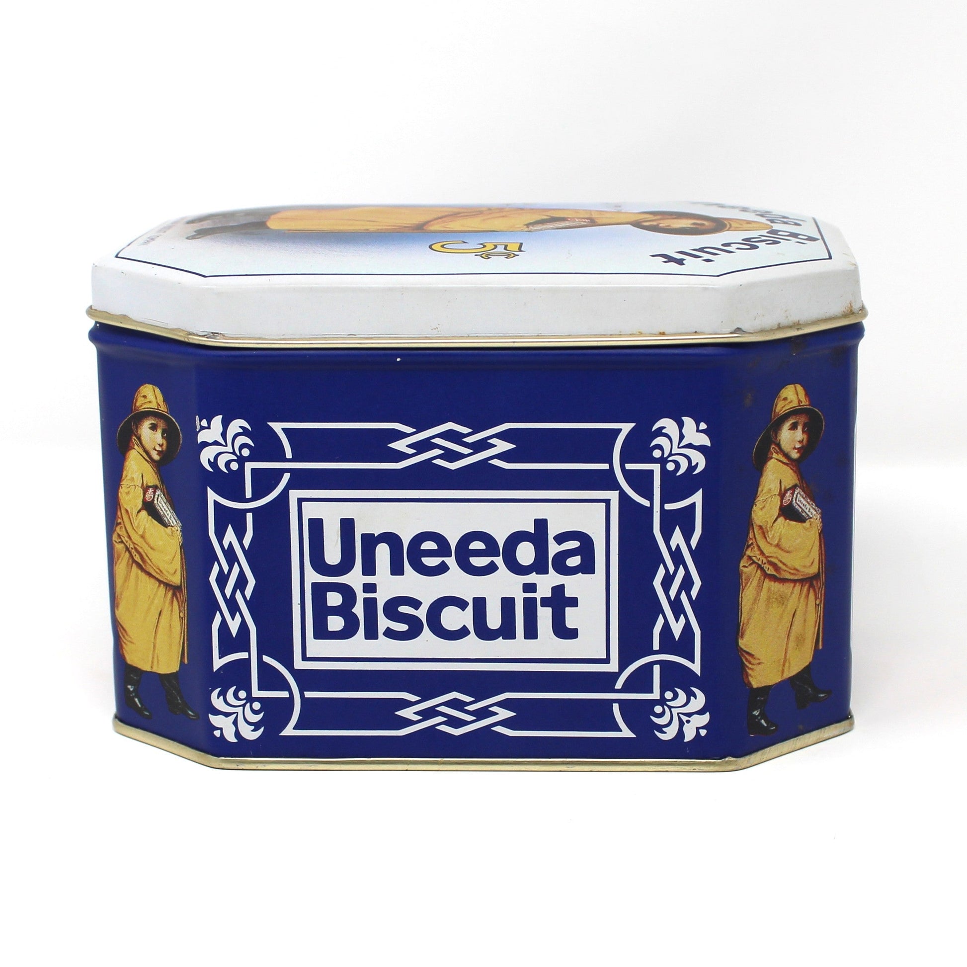 - Vintage Biscuit Tin, Boy in Yellow Raincoat Uneeda Biscuit, 1970s Reproduction of 1920s National Biscuit Company Tin, Nabisco, Bristol Ware, (Discontinued)