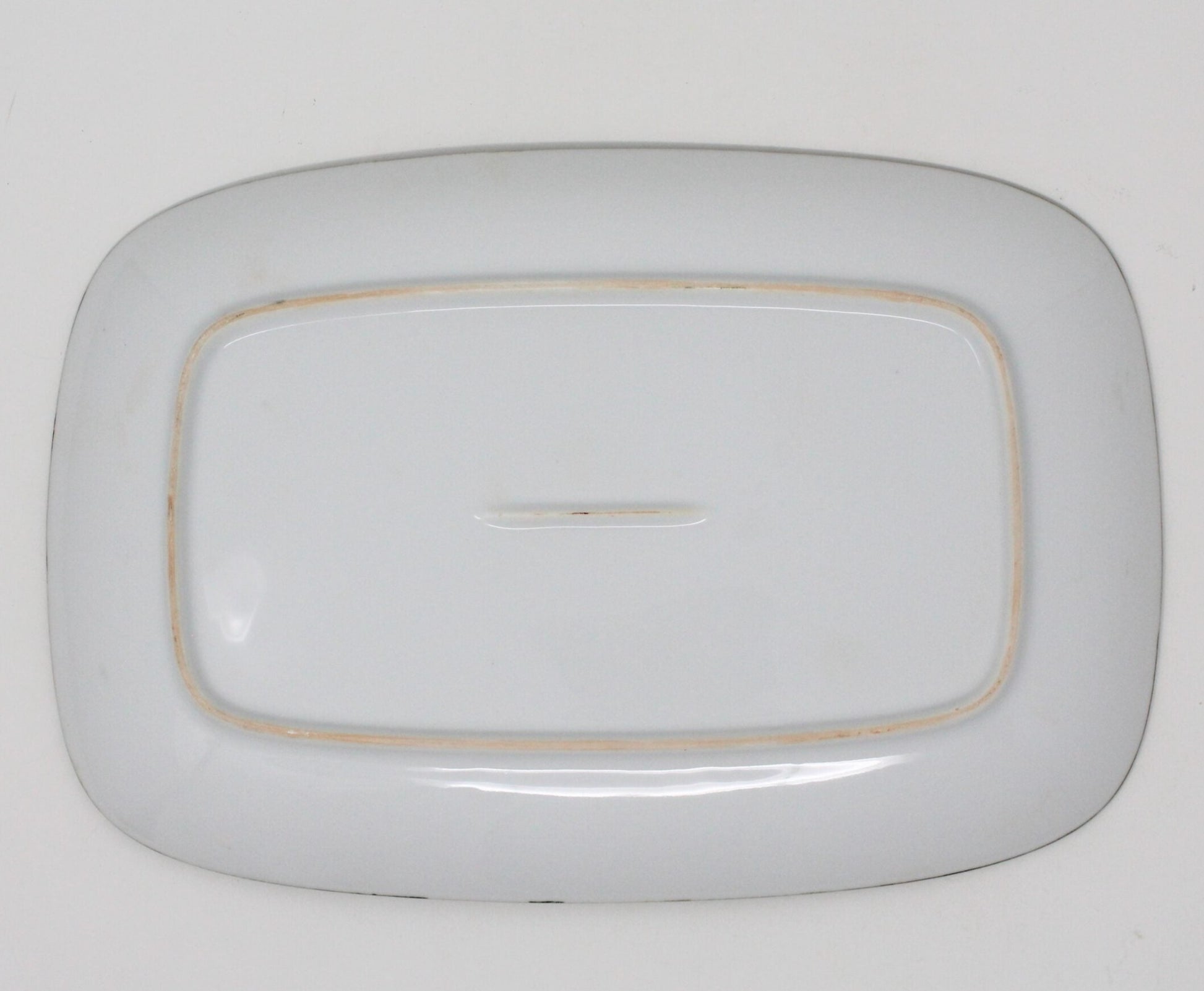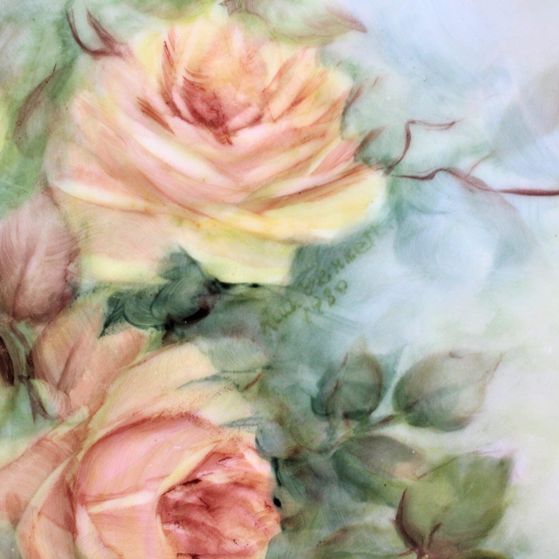 - Details: An absolutely lovely rectangular porcelain tray with hand painted yellow and peach roses. This is a decorative tray, (it may not be food safe). The porcelain is not marked but the value of this piece is not in the porcelain maker, but in the hand-work of the artist. It is signed by the artist, we couldn't make out the name but looks like Ruth Ermkell, dated 1980. Would make an excellent gift, maybe for Mother's Day, or special birthday!