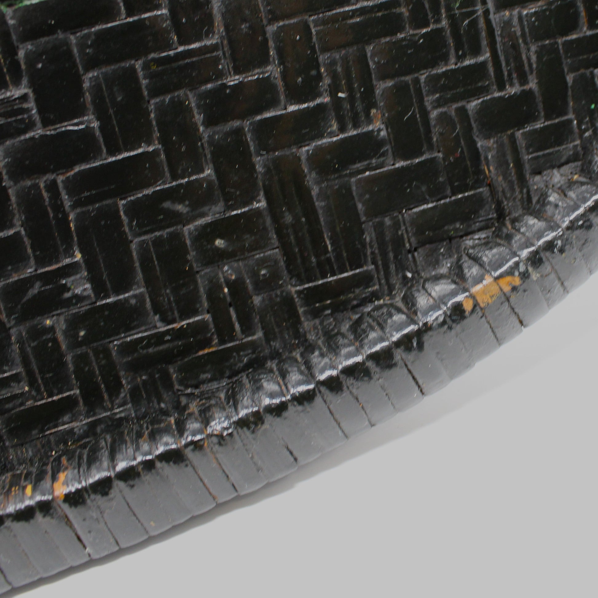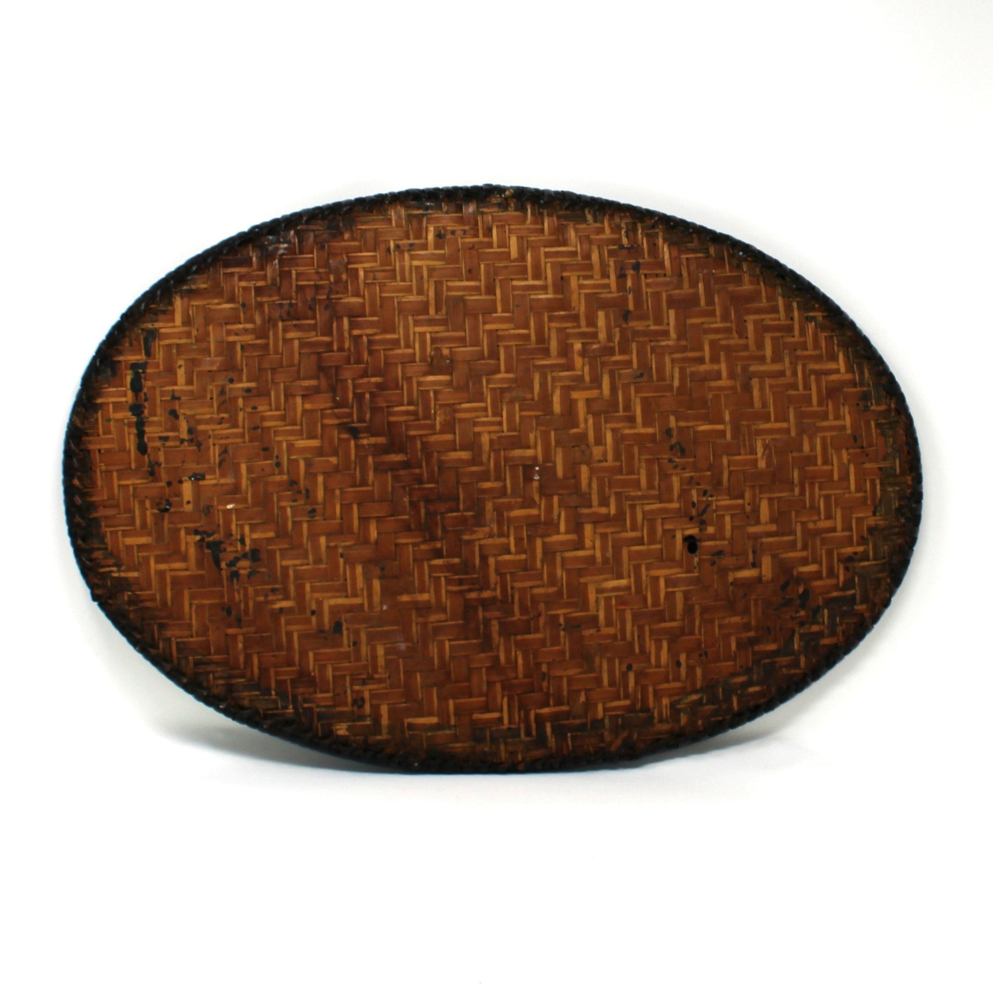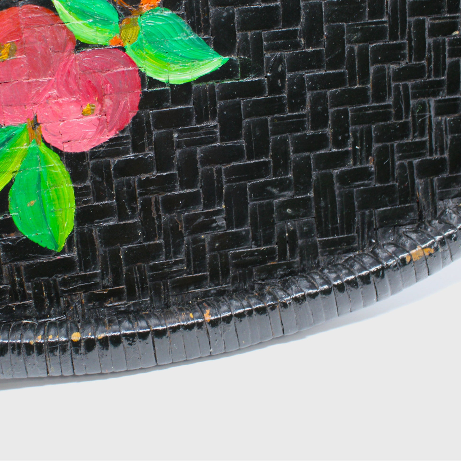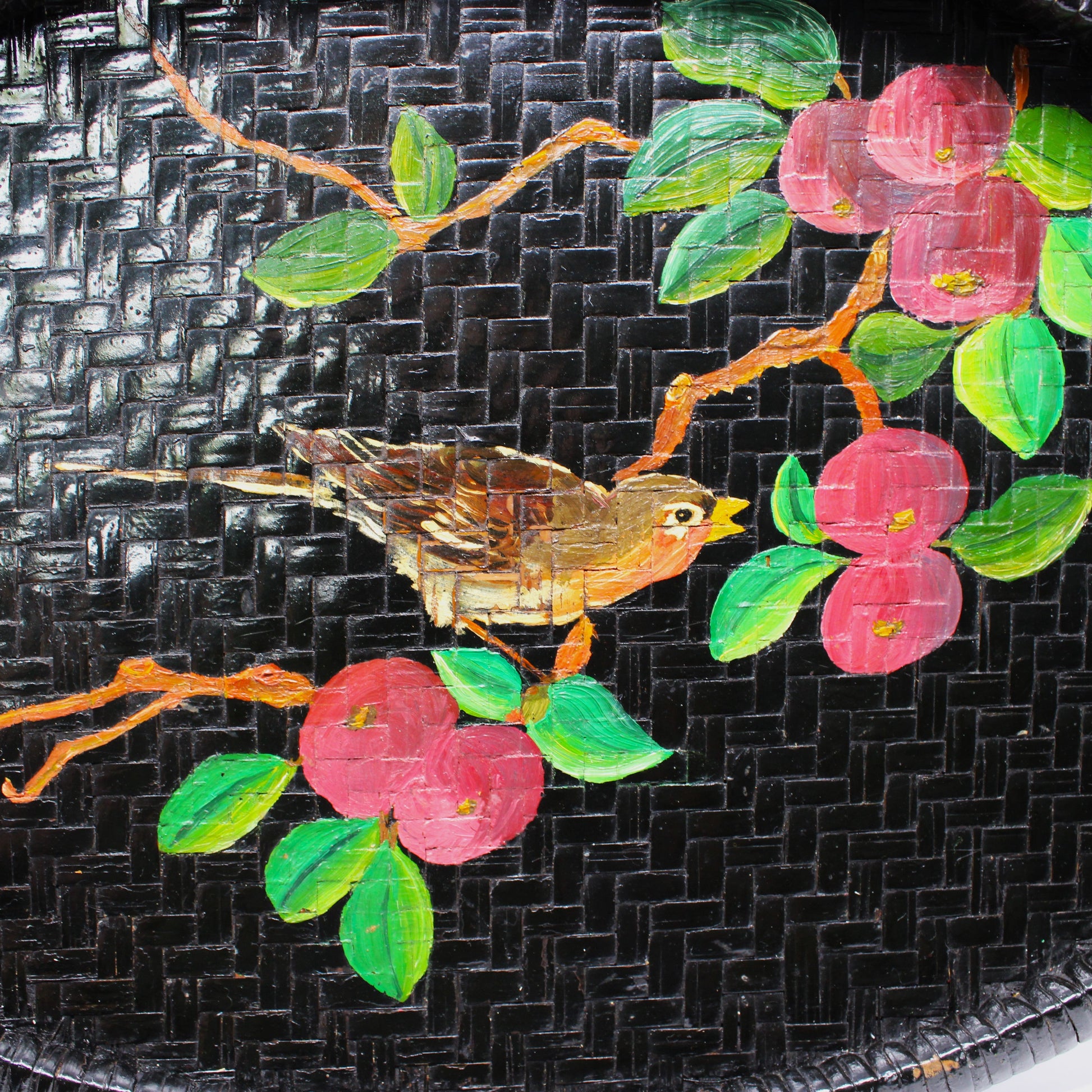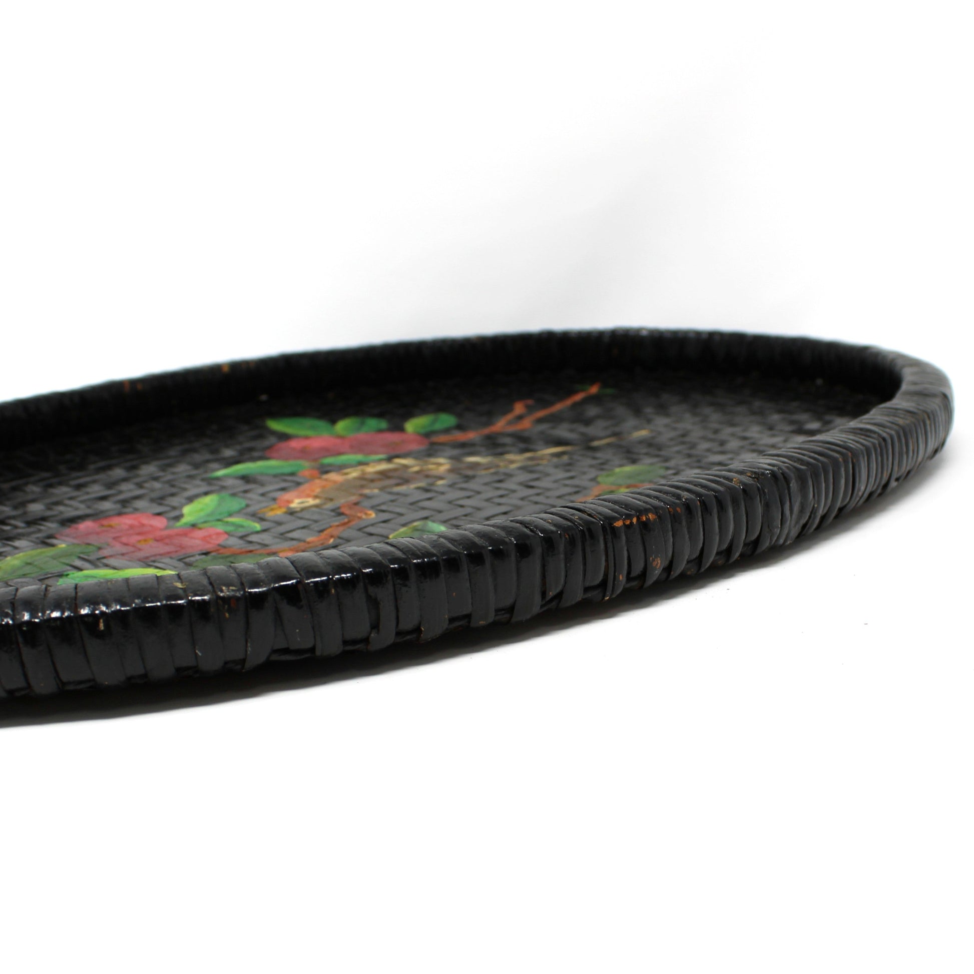 - Details:  Charming vintage woven tray, also known as a Winnowing Basket.  Hand-made and hand painted, with a One-of-a-kind Robin Bird on a Fruit Tree Branch design, set against a sleek black, woven grass background.  This oval tray combines functional artistry with rustic charm. Its unique design and refined craftsmanship make it an elegant decorative piece, perfect for adding a touch of sophisticated charm to any home interior.