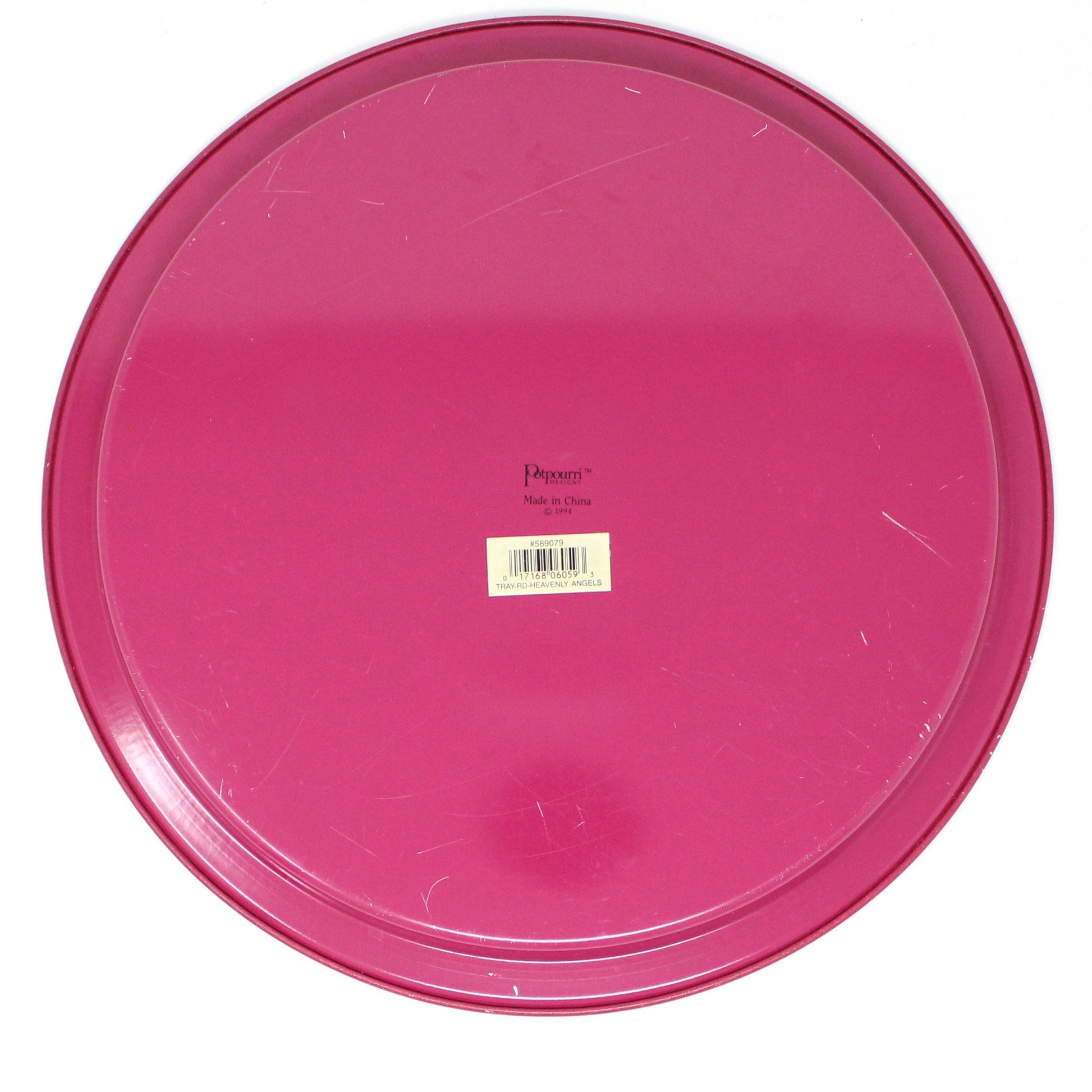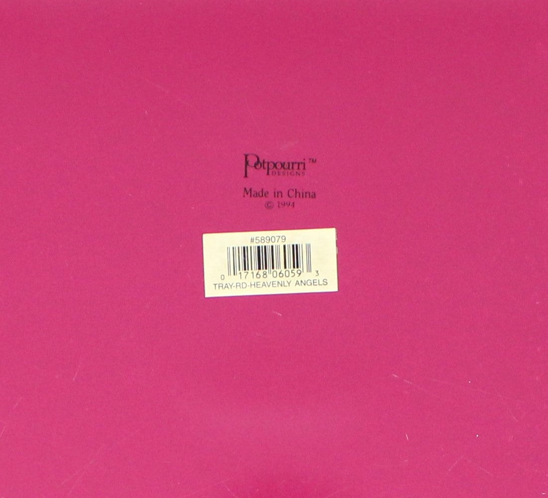 - Details: What a beautiful metal tray, and perfect for the Christmas holiday! The illustration of three angels wearing red and gold gowns, each one holding a different musical instrument is just wonderful, lots of detail. The tray has a textured finish that makes it sparkle. The back is a solid magenta (bright pink/purple), color. It is marked on back: Potpourri Designs, Made in China 1994. It retains its original sticker that shows this tray is the "Heavenly Angels" pattern. This is not only a wonderful serving tray, it would be a great addition to your Christmas decor.