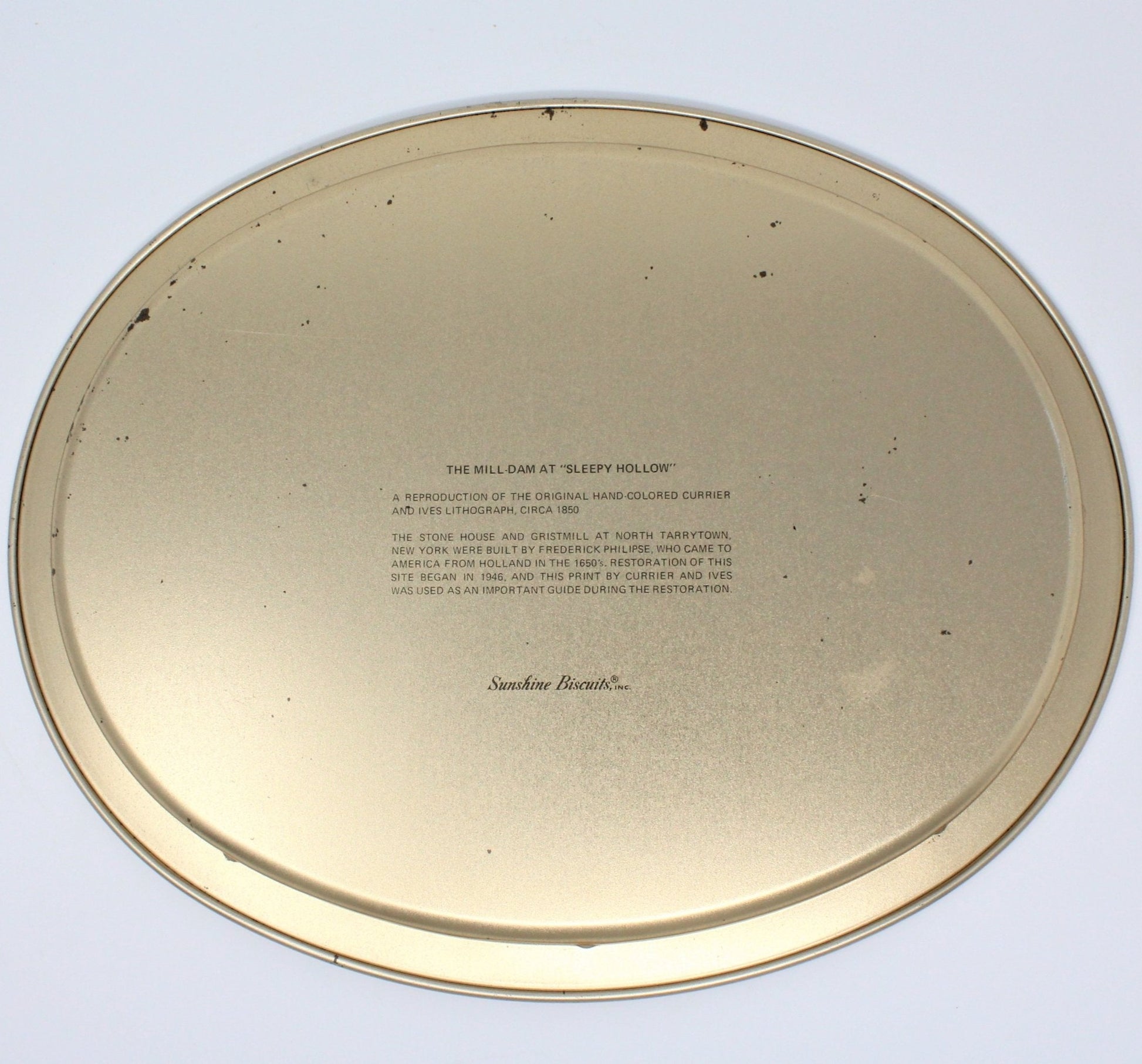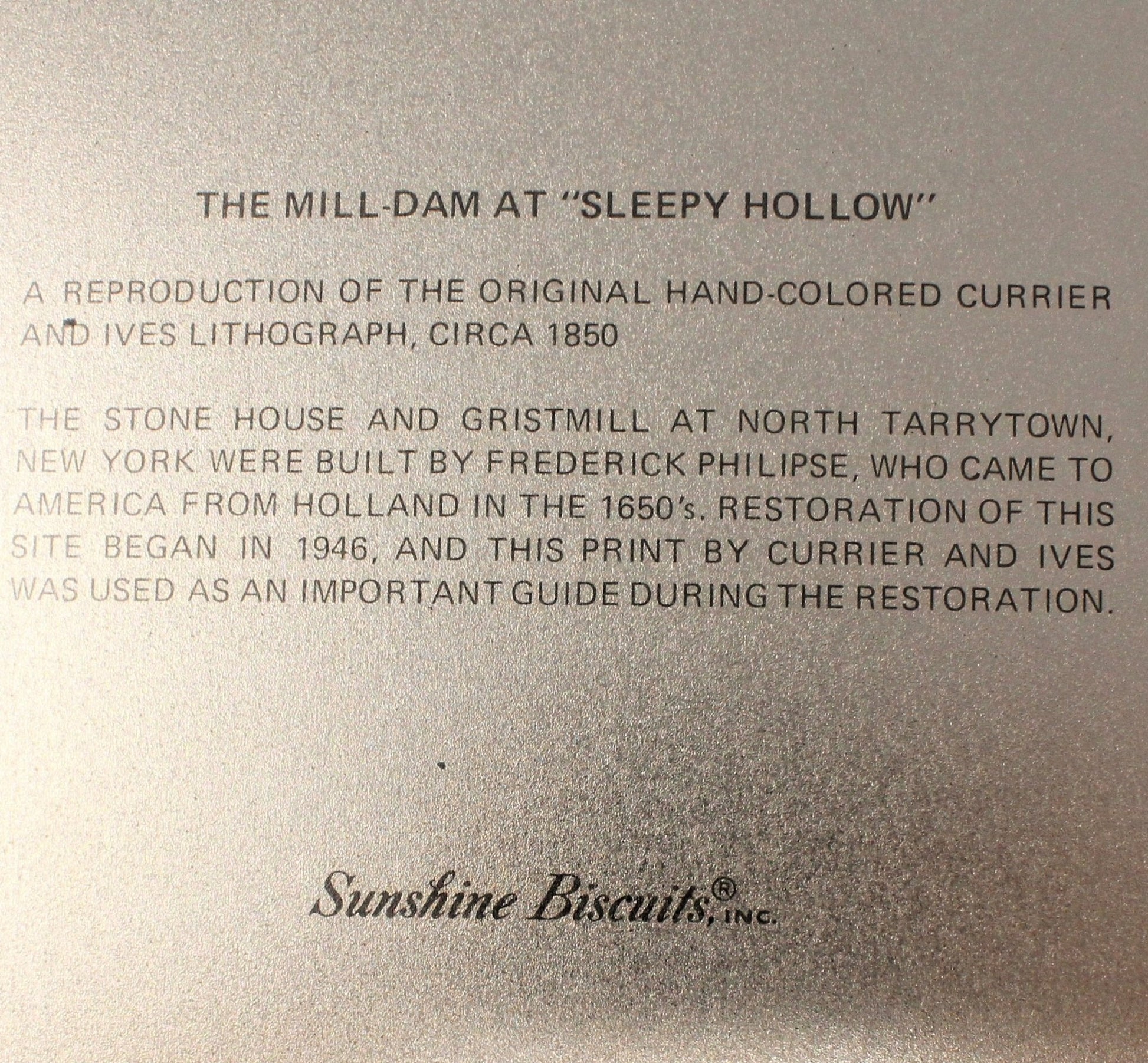 - Details: These large metal trays by Guildcraft for Sunshine Biscuits are so delightful and they are in wonderful vintage condition! There were several of these made with different works by different artists. These two are based on lithographs from Currier & Ives from the 1800's - 1907. Each tray depicts a different Americana scene. One lithograph, "The Village Blacksmith", originally done in 1864, is a beautiful country scene with a blacksmith working while children walk home from school & stop to watch him work. The other lithograph, "The Mill Dam at Sleepy Hollow", done circa 1850, shows The Stone House and Gristmill located in Tarrytown New York. Beautiful movement of water, willow trees and a man fishing from a wooden bridge. Both trays have information on the back regarding the images and the maker of these trays, Guildcraft. The trays are bordered in a rich brown and golden rim. This is a beautiful set of of Old Americana trays, not only for serving, but would make a lovely wall decor in a study, living room, office, or entrance hall. A great gift for an Americana or Currier & Ives collector. Great addition to a farmhouse / country decor!