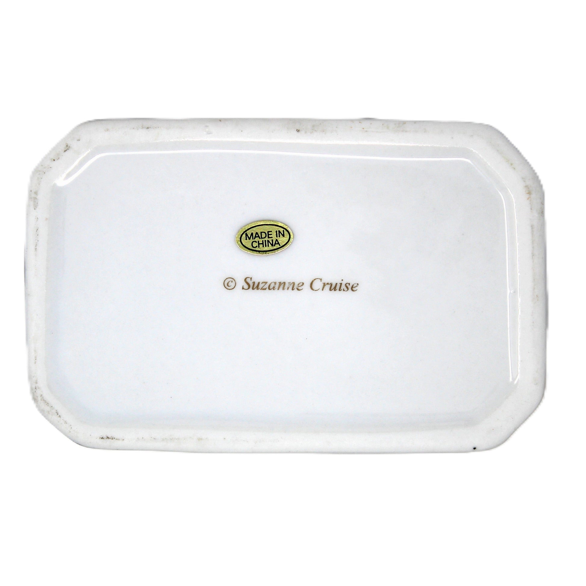 - Details: The latch on this box is broken, but it's so cute, we figured someone can put it to good use. A darling design from Suzanne Cruise, Santa carrying a sack full of toys. Rectangular shape, nice heavy weight, no other issues. It is stamped on the bottom "Suzanne Cruise", still retains the Made in China foil sticker. A great addition to your Christmas decor. Could be used to store holiday matches, candy, or other small treasures.