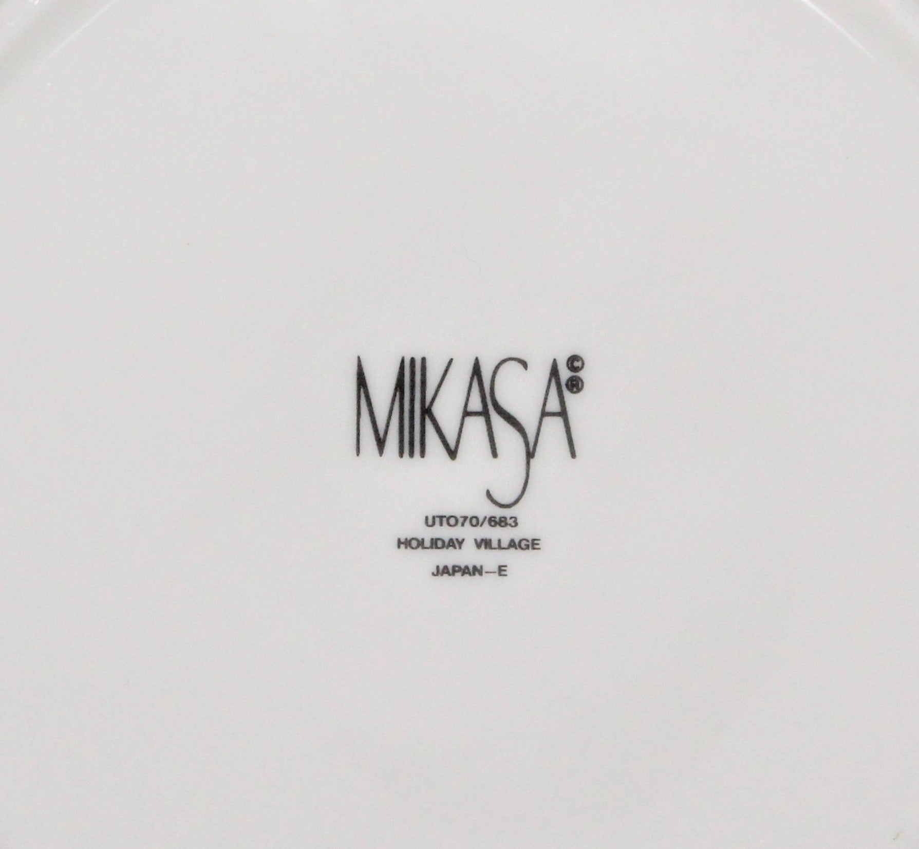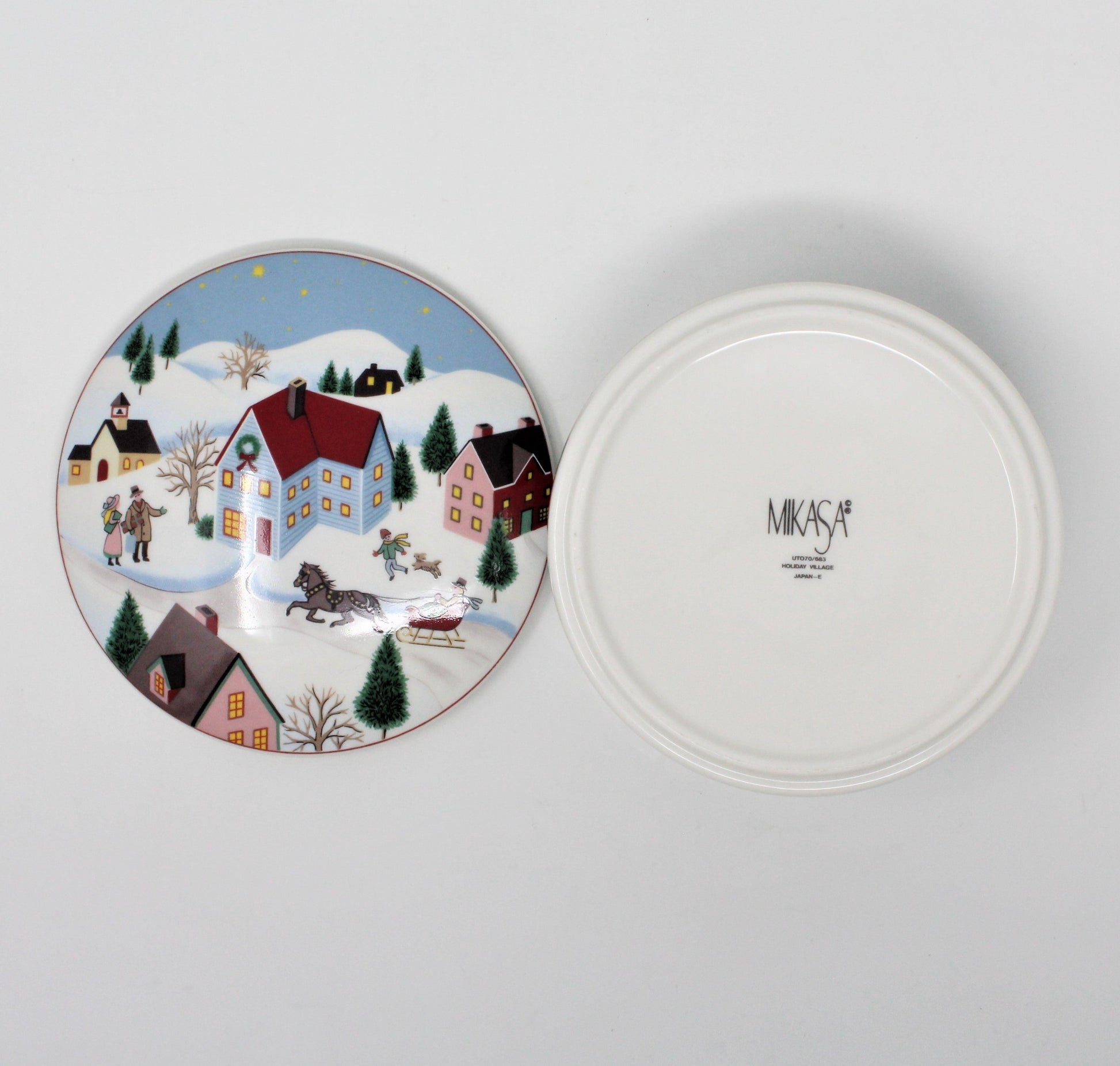 - Details: This is a very sweet round porcelain box from Mikasa, titled "Holiday Village". There's lots going on in this little wintery village and the scene is on the lid as well as all around the bottom piece. It is stamped on the bottom with the Mikasa logo and: "UTO70/683, Holiday Village, Japan-E". Hand Wash ONLY. A great addition to your Christmas decor or as a gift maybe filled with candies or chocolates, it is really in perfect condition.