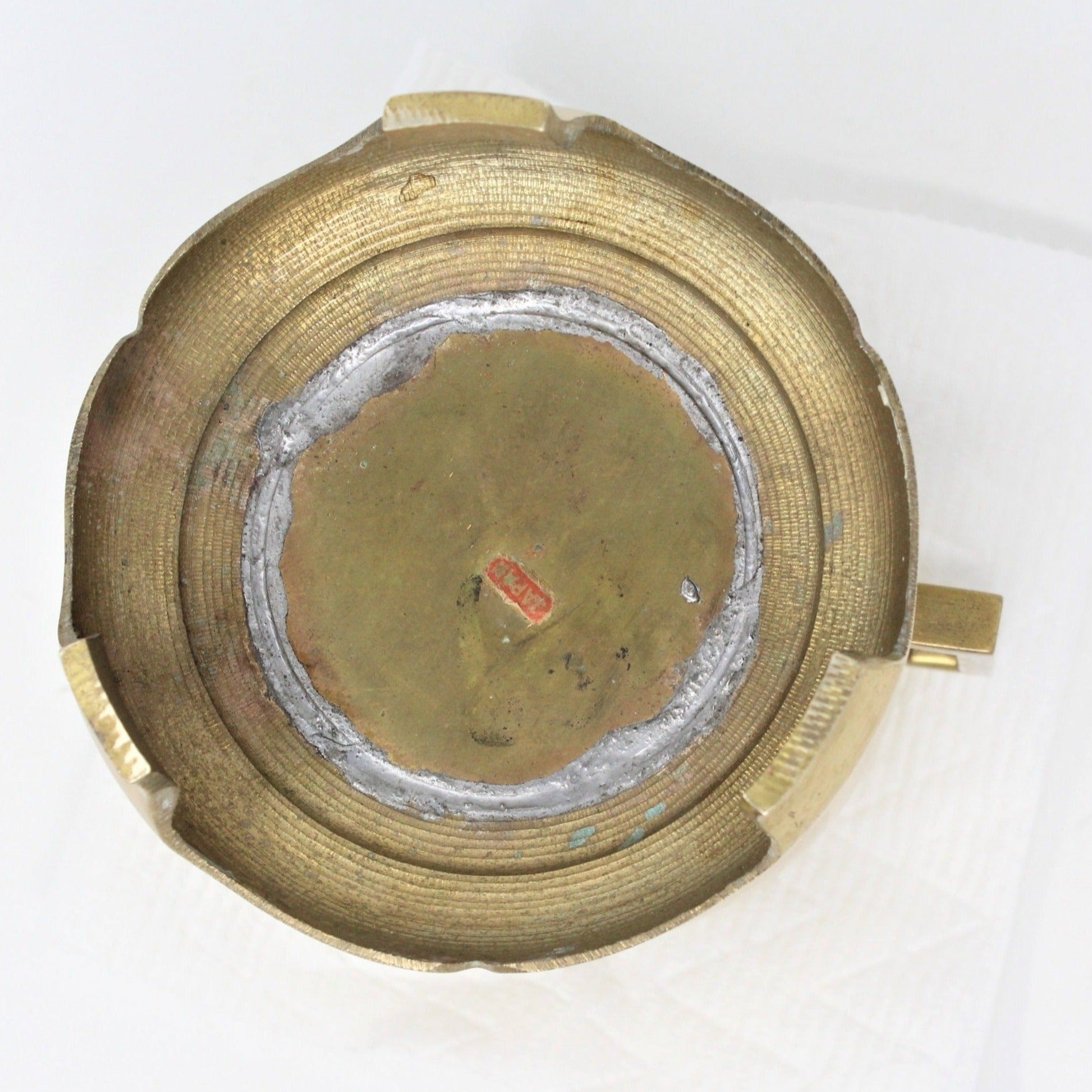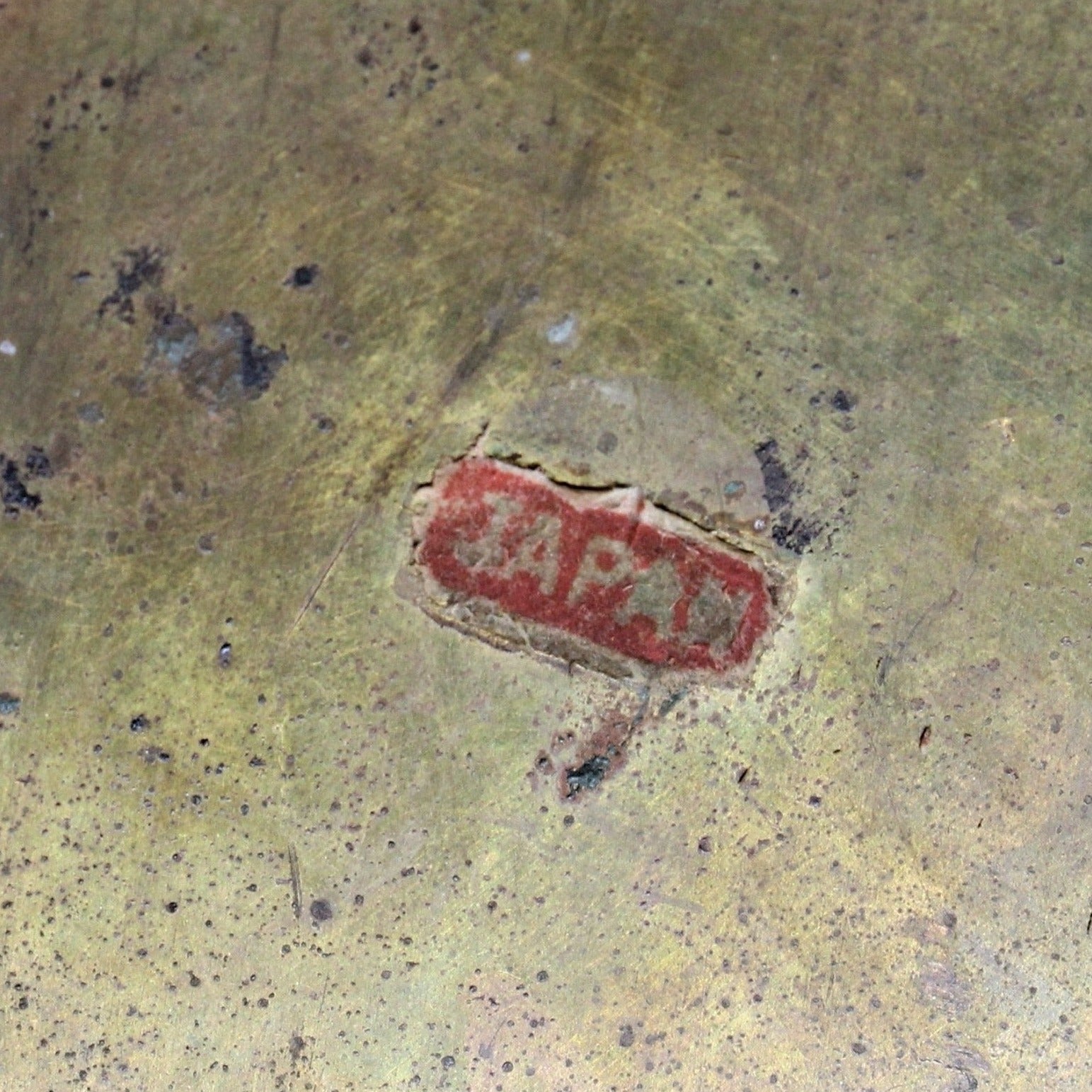 - Details: This urn is simple and beautiful, it is forged brass by Japanese artisans. It has a oriental feel but also a bit Mediterranean/Greek in its design with sharp geometric shapes. The base is round with three "feet" and a pretty "swirl" bracket design. The bottom retains its original label, looks like a very old label that simply reads: "Japan". The urn has not been cleaned as many love the patina of old brass, however, if you prefer shiny brass, this should clean up very nicely. Lovely as decor on its own, gorgeous with a few leaves or flowers (real or faux). Would fit right in with a modern decor style or a more traditional style. Really a unique and lovely piece, great gift idea!