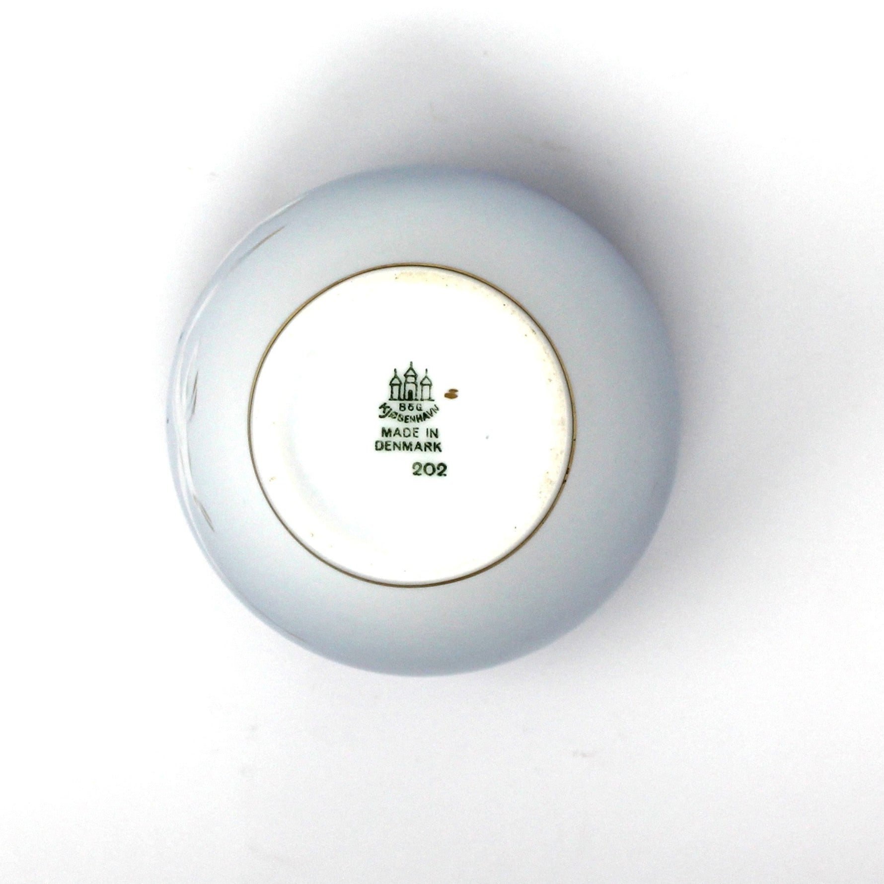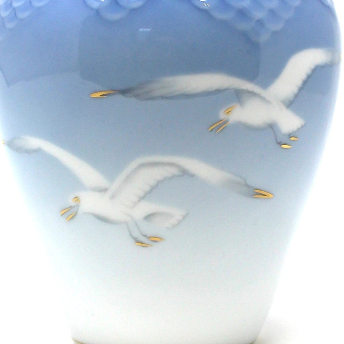 - Details: An exquisite vase with a classic design, and highly collected pattern, from Bing & Grondahl, called Seagulls. Features delicate gilded seagulls, flying against a pale blue background with embossed, shaded patterns of "fish scales" around top border. This pattern was originally issued as a set of dinnerware, designed by Fanny Garde in 1892. New pieces kept being added and the pattern became so popular, the series became known as the "National Service of Denmark". There are over 20 different vases in this pattern, in various shapes and heights, gilded, not gilded, this one is #202. The backstamp on this vase dates it to between 1952 and 1957. Its elegant mid-century design evokes coastal charm, making it a refined addition to any sophisticated interior. Perfect as a thoughtful gift or a timeless decorative piece, this vase captures the serene beauty of marine-inspired artistry.