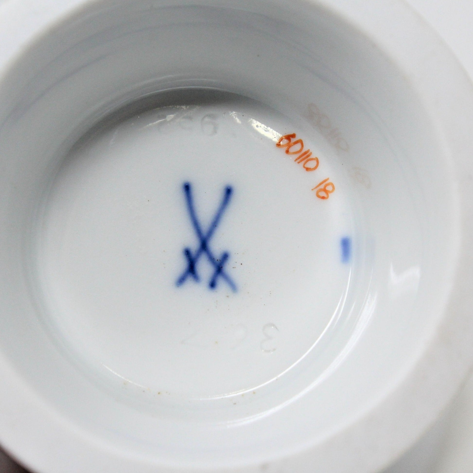 - Details: This gorgeous trumpet vase is by Meissen, the most internationally known of all the German luxury brands. The vase is decorated with beautiful florals, the largest flower in blue and yellow, and smaller flowers in yellow and pink. The back features two smaller stems, one in purple and one in orange. It has a gold rim and other gold accents. The shape of this vase is unique, it's a trumpet, (also called a funnel), with a narrow base widening towards the top. The bottom is stamped with the Meissen mark that was used from 1947 to 1973. It also has red numbers: "60110 18". These vases are highly collectible, with many different patterns to choose from, all in this unique shape.