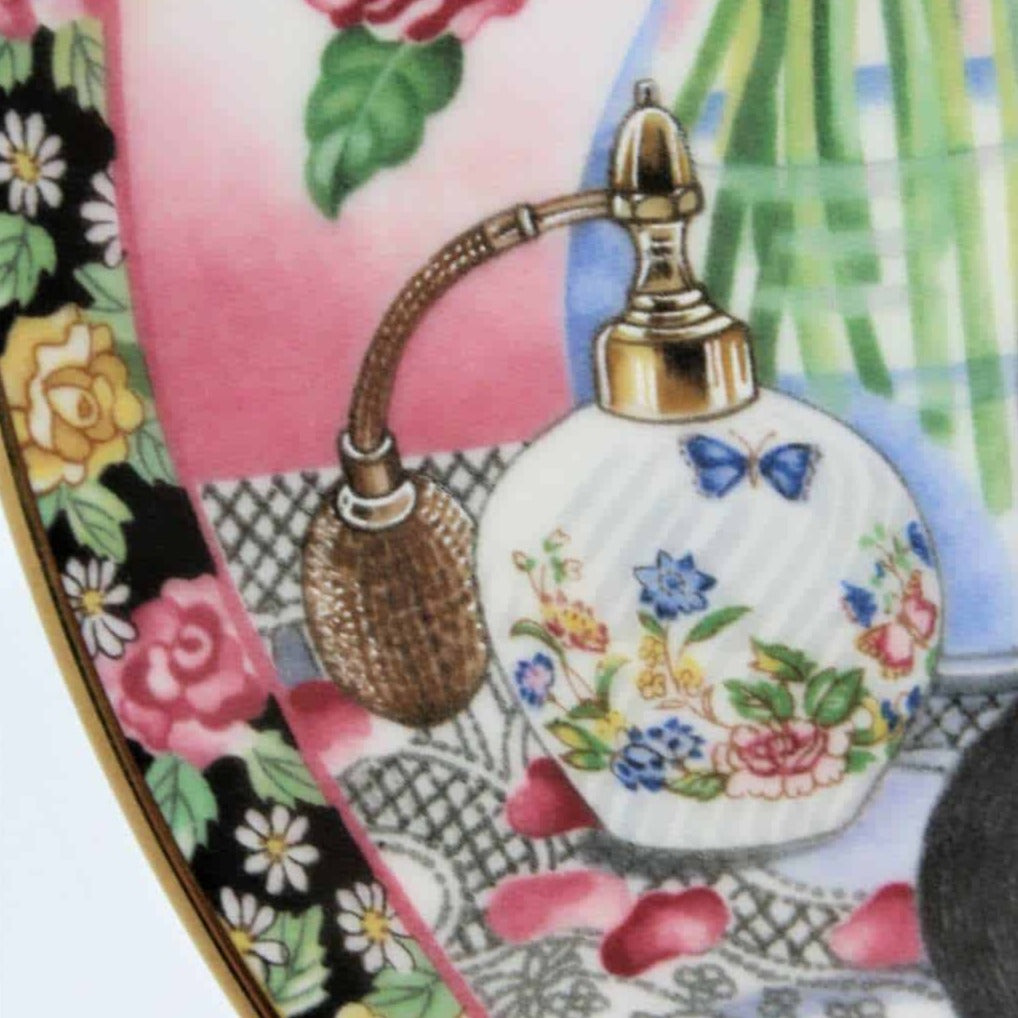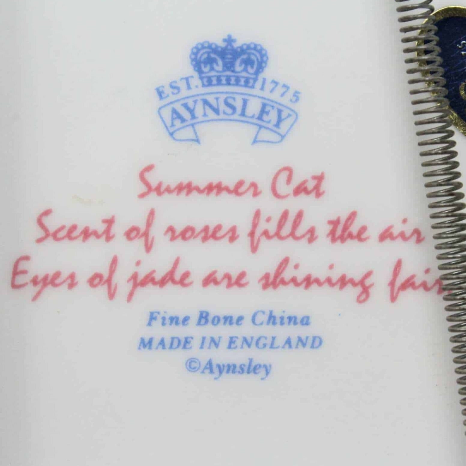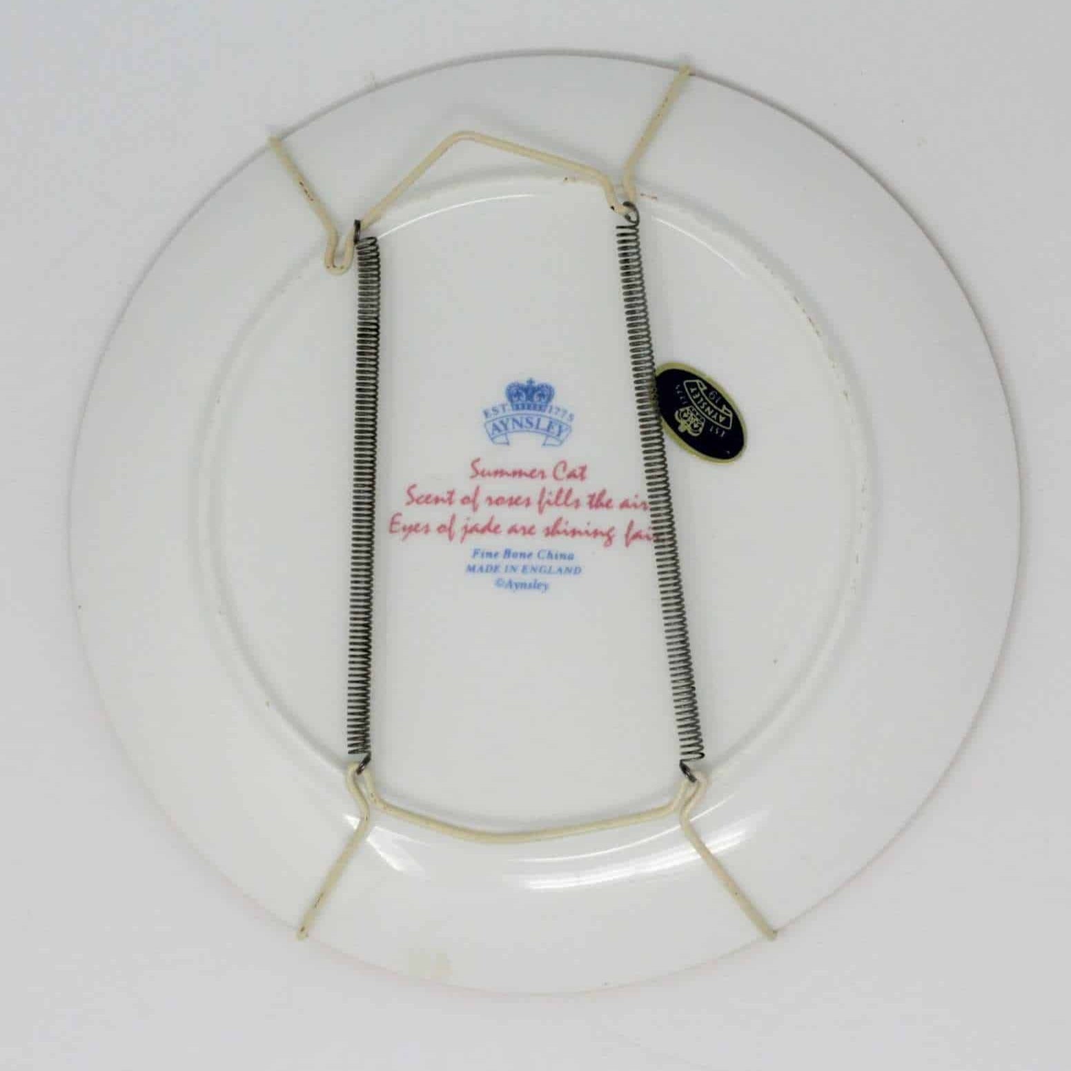 - Details: This is an adorable decorative plate by John Aynsley & Sons, it is part of a collection called "Cats for all Seasons", this one is Summer. It's a beautiful gray and white cat with big green eyes, sitting by a window. On the table rests a big straw hat with daisies and a red bow, a gorgeous bouquet of roses and a perfume atomizer, likely the owner's dressing table. There's an additional pattern all around the border of yellow and pink roses and white daisies on a black background, the plate is rimmed in gold. It retains the original blue sticker from Aynsley. It is stamped on the back: "Aynsley Est. 1775, Summer Cat, 'Scent of roses fills the air, Eyes of jade are shining fair', Fine Bone China, Made in England, the copyright logo Aynsley". It has a plate hanger attached, we'll leave for you, it's in great condition. If you're looking to complete your collection, we hope this is a happy find. If you're looking for a pretty plate for your bedroom, sunroom or powder room wall, this would be lovely. Actually, any place you display this plate, it will be beautiful. Perfect gift for a cat lover!