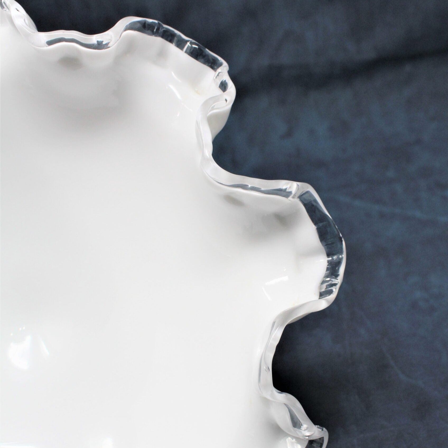 - Details: Spectacular piece showcasing the gorgeous Fenton pattern "Silver Crest". All the pieces in this pattern have this beautiful border, combining milk glass with 1/4 inch clear glass edge. When it also has large ruffles like this, it's known as Double Crimped. This piece is most likely pre-1970, this is based not only on the previous owner, but because it doesn't have the "Fenton" mark on the bottom, that practice was started around 1970. These are perfect for Bridal Showers, Weddings and Baby Showers too. Makes a beautiful candy dish.