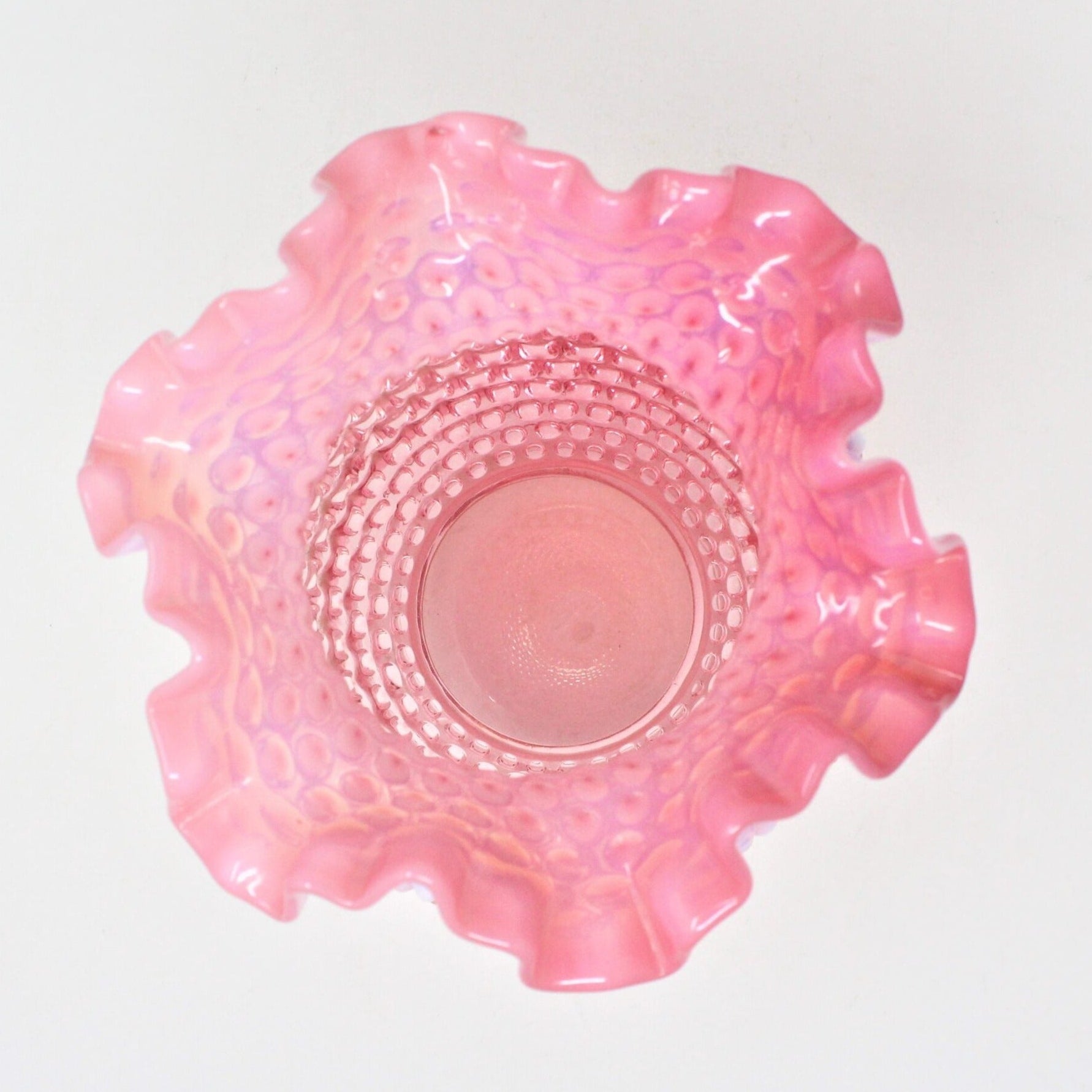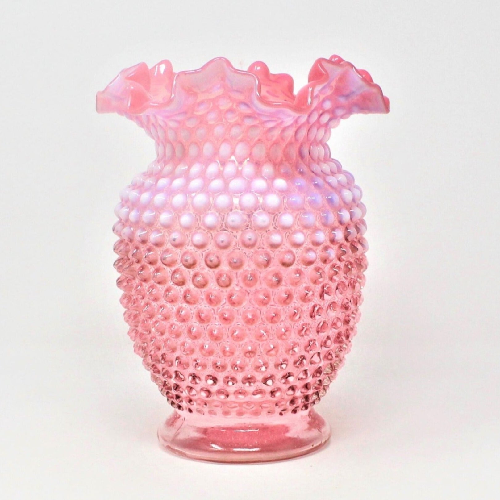 - Details: Spectacular vase from Fenton showcasing the gorgeous Cranberry Hobnail pattern. This vase has the added beauty of what they called "opalescent glass", which is the beautiful translucent white color added to the clear cranberry glass plus the neck that forms a wonderful double crimped ruffle, it's just an amazing piece! Gorgeous on a tabletop with flowers, but really a stand-out beauty all on its own. Perfect for gift-giving!
